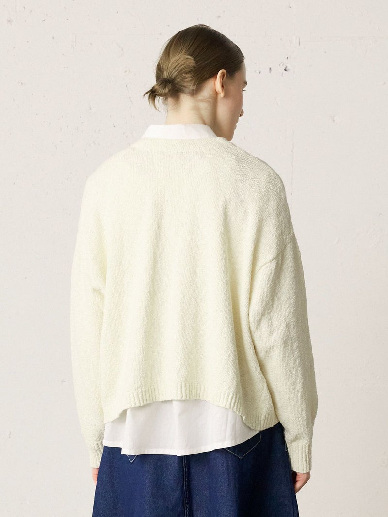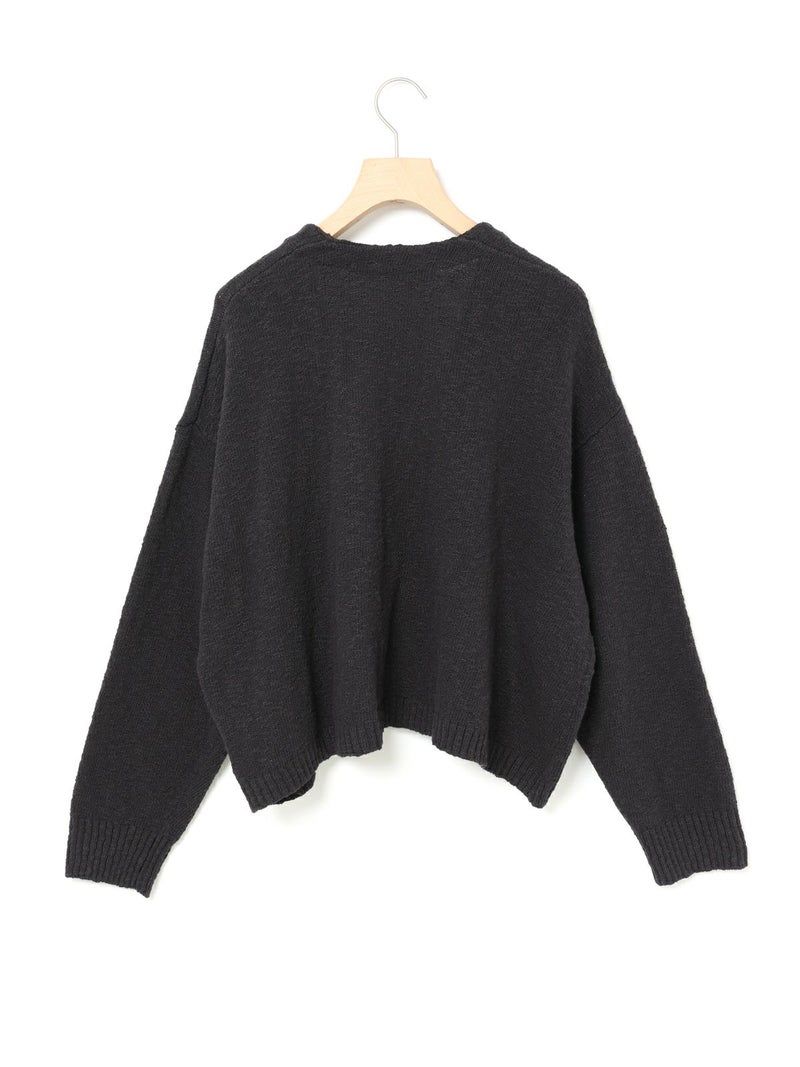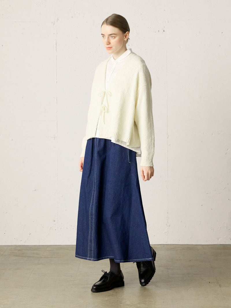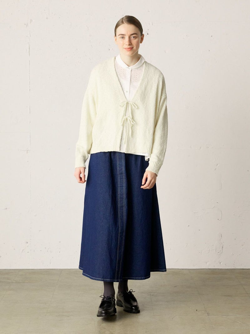 コットンナイロン糸を使用したリボンニットカーディガンです。スラブ感のある風合いのニットシリーズで1-729781/ドローストリングニットベスト、1-729782/ワイドニットベストも展開。フロントのリボンが特徴のニットカーデ。着丈は短めになっております。春先に気軽に羽織っていただける女性らしい1枚です。