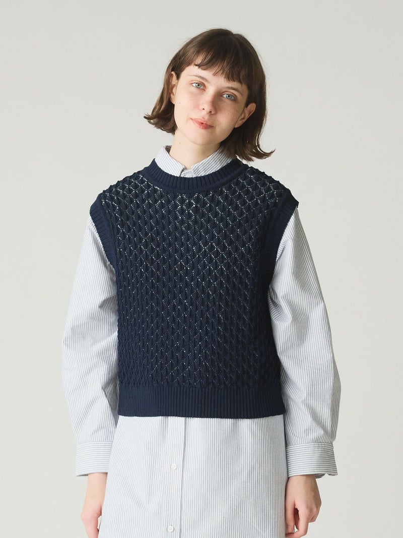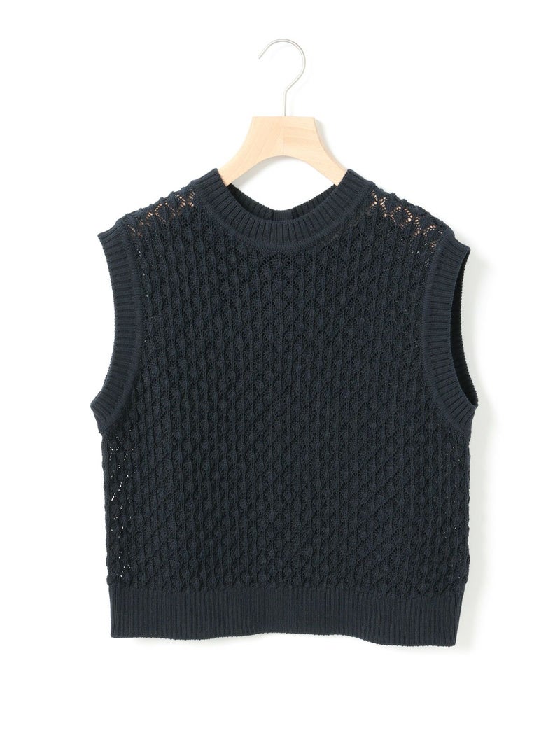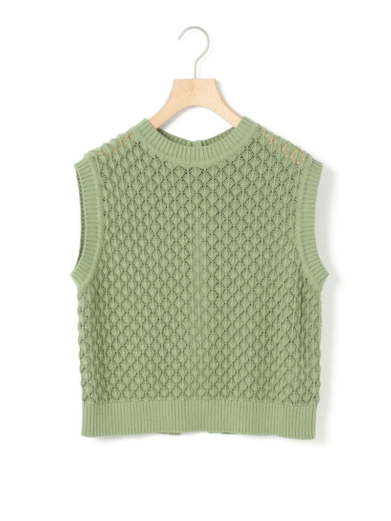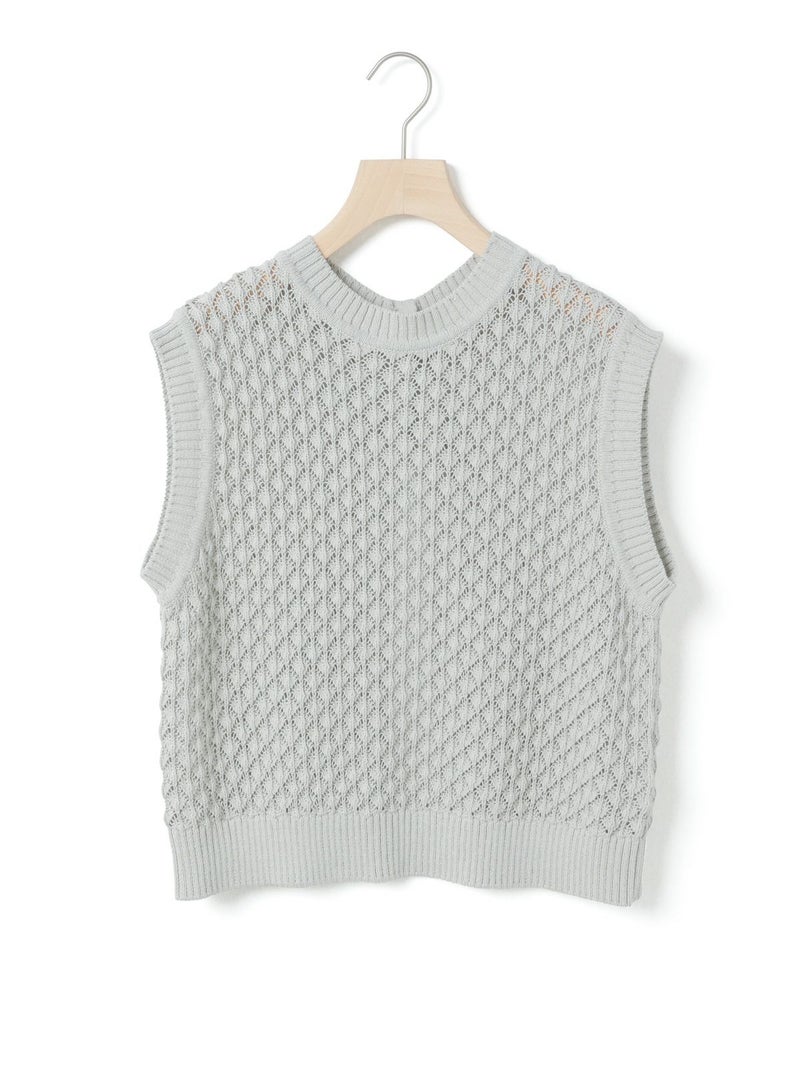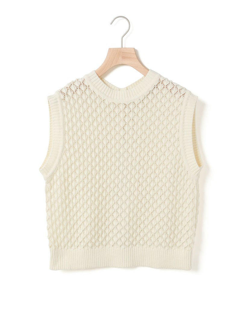 メッシュ編みコットンニットを使用したメッシュニットベストです。ハンドニット風の柄の透け感が魅力のニットアイテムです。重ね着アイテムとしてお勧めでバックの開いた魅力的なデザイン仕上げ。ワンピースやシャツなど多様なアイテムと合わせていただけます。優しい色合いは春の爽やかな着こなしを演出してくれます。ニットの重たい感じはなくベーシックアイテムとして重宝していただける1枚です。