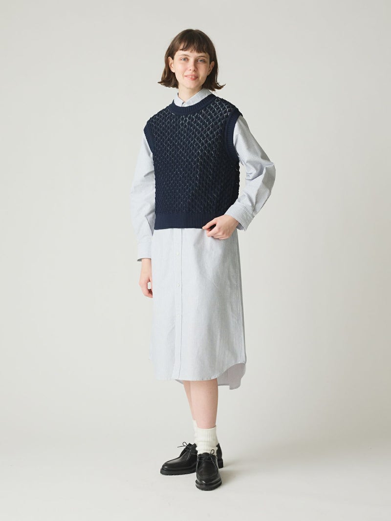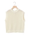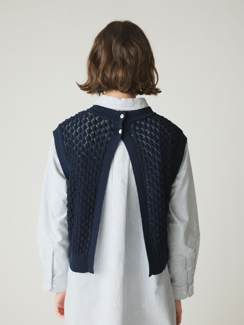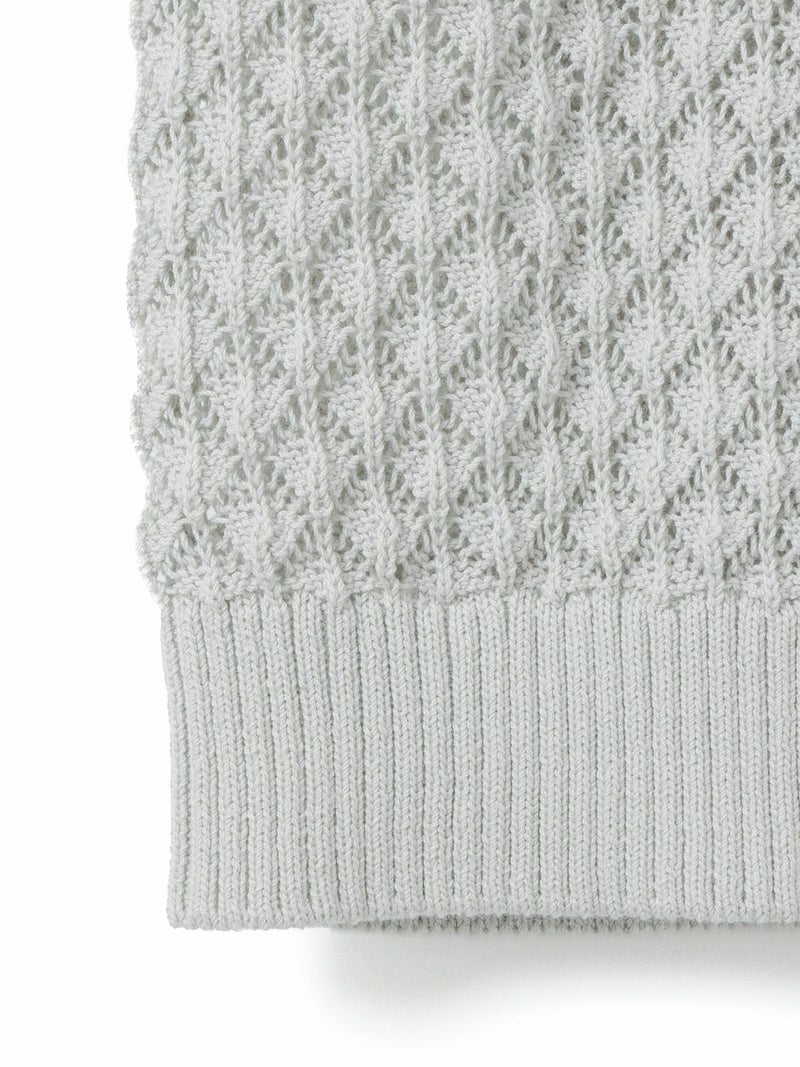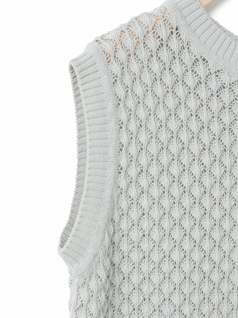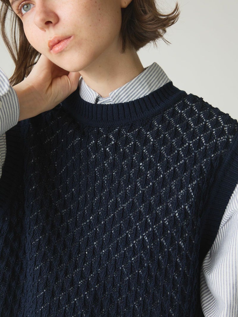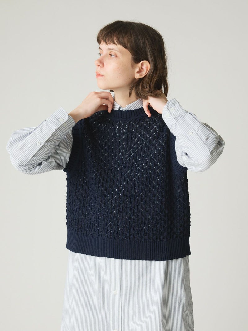 メッシュ編みコットンニットを使用したメッシュニットベストです。ハンドニット風の柄の透け感が魅力のニットアイテムです。重ね着アイテムとしてお勧めでバックの開いた魅力的なデザイン仕上げ。ワンピースやシャツなど多様なアイテムと合わせていただけます。優しい色合いは春の爽やかな着こなしを演出してくれます。ニットの重たい感じはなくベーシックアイテムとして重宝していただける1枚です。