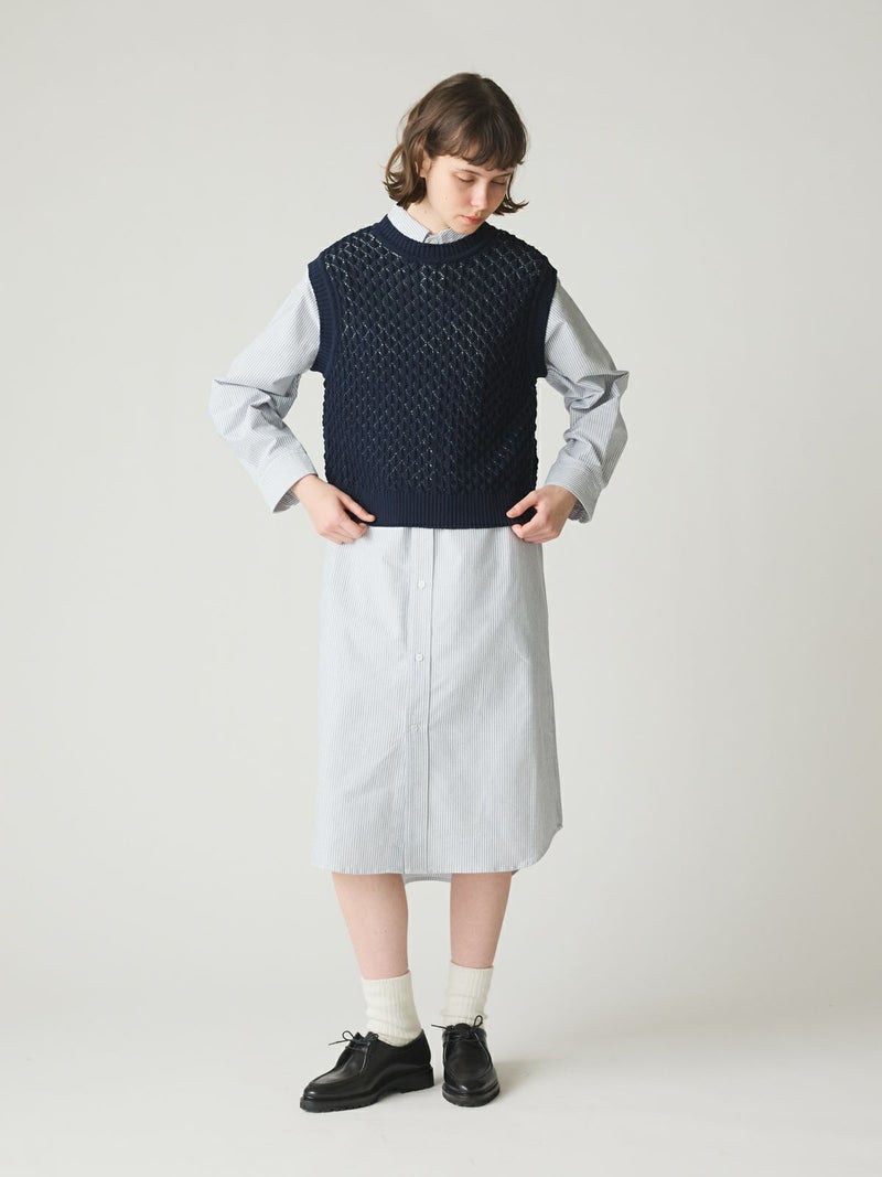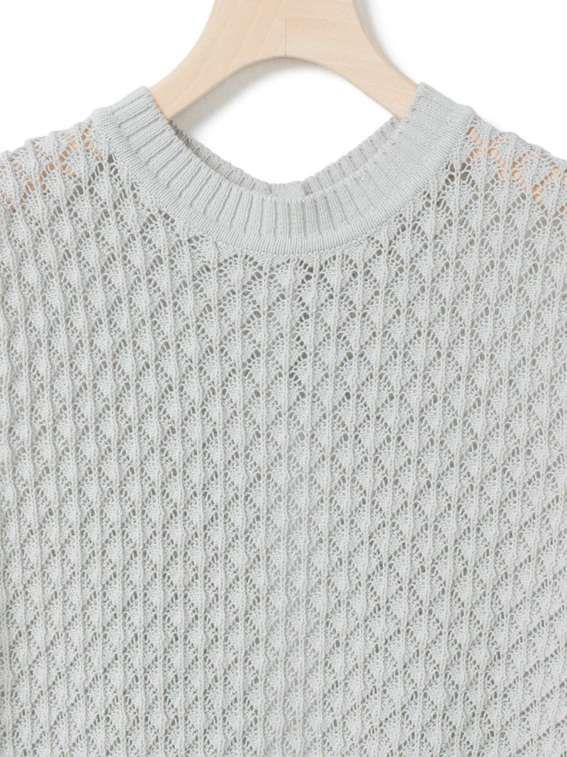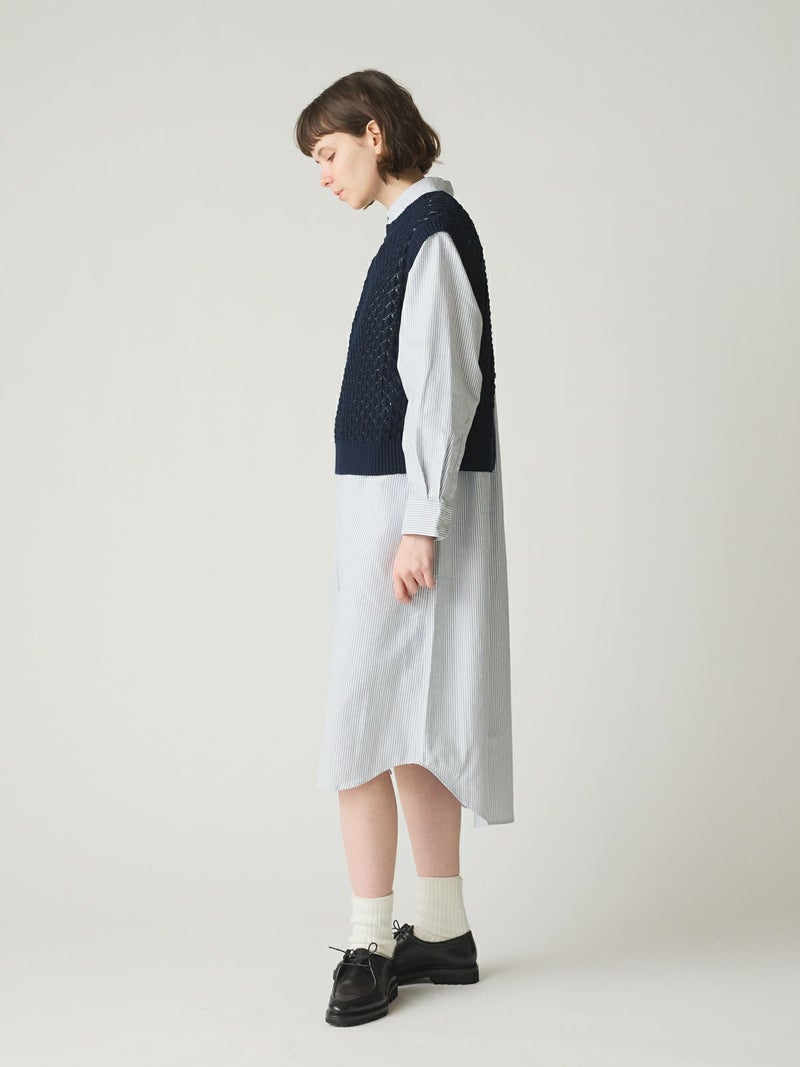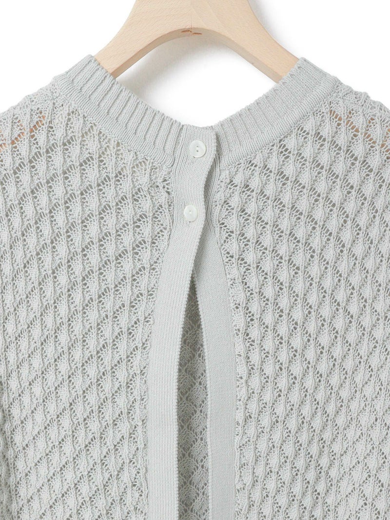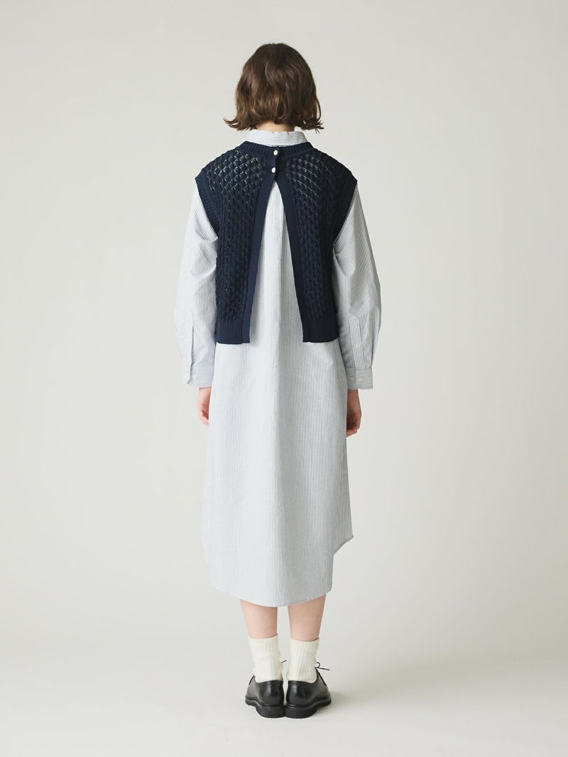 メッシュ編みコットンニットを使用したメッシュニットベストです。ハンドニット風の柄の透け感が魅力のニットアイテムです。重ね着アイテムとしてお勧めでバックの開いた魅力的なデザイン仕上げ。ワンピースやシャツなど多様なアイテムと合わせていただけます。優しい色合いは春の爽やかな着こなしを演出してくれます。ニットの重たい感じはなくベーシックアイテムとして重宝していただける1枚です。