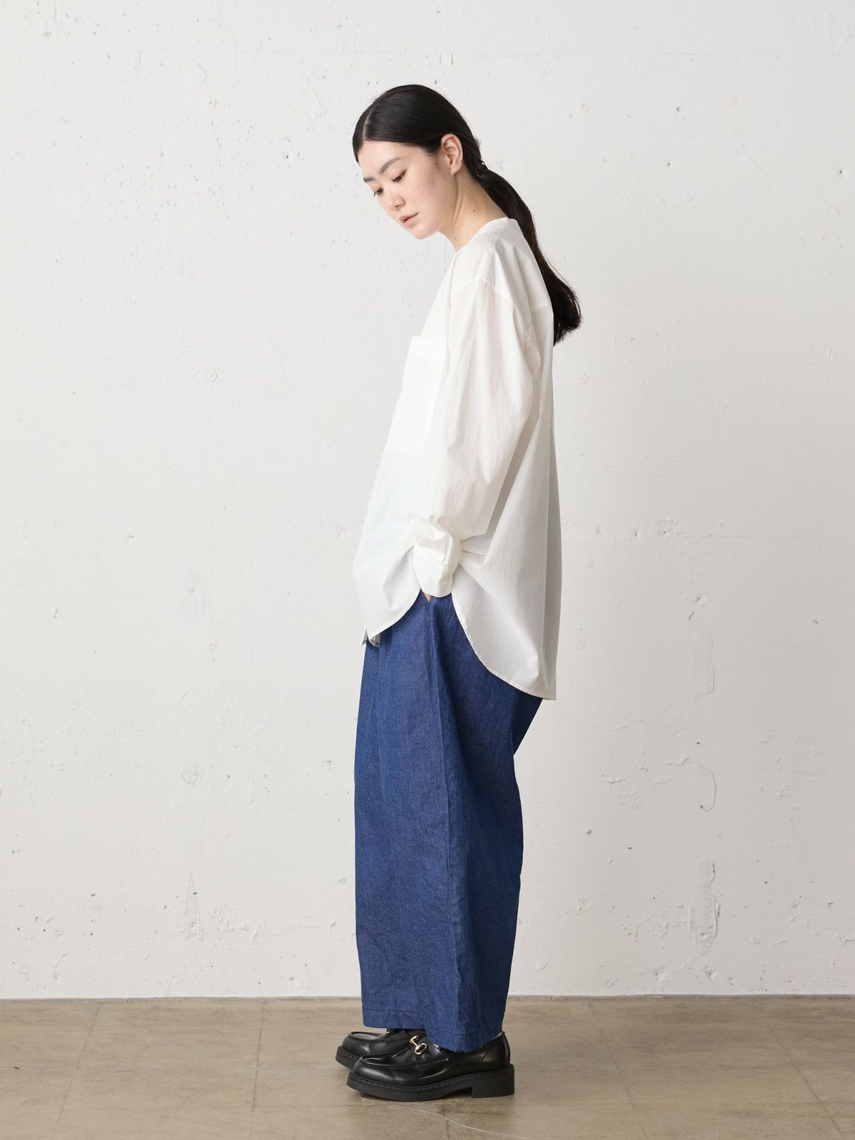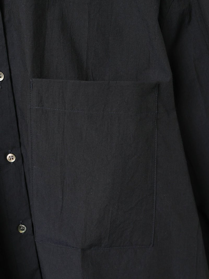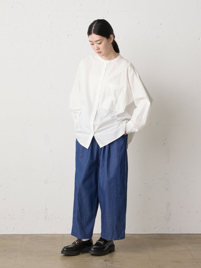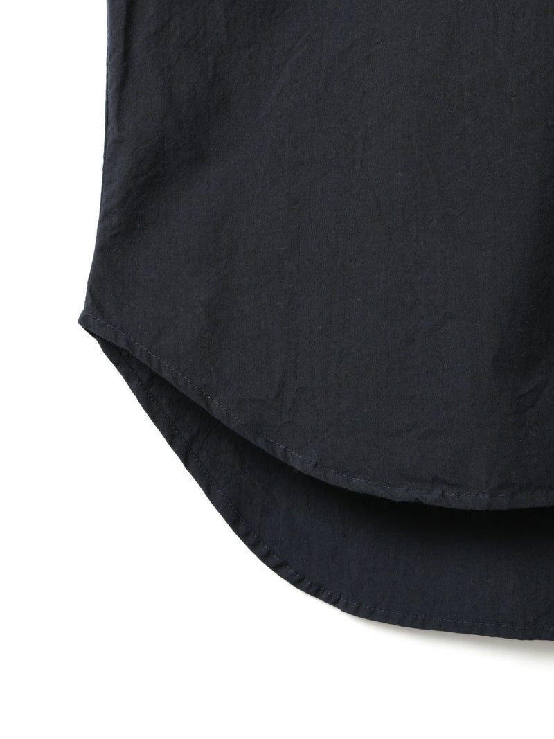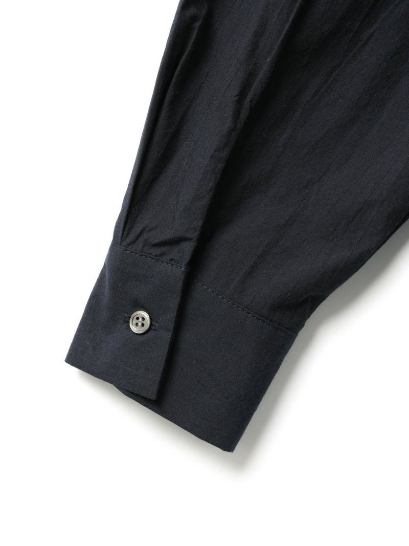 高密度に織られたタイプライター生地を使用したスタンドカラービッグシャツ。播州でワッシャー加工を施し、ヴィンテージライクに仕上げました。細めのバンドカラーと大きめのパッチポケットのバランスが絶妙のデザインポイント。袖にタックを施したことで立体感がでるようなシルエットを表現。たっぷりとしたサイズ感で着こなせ、ベーシックなスタイリングにお勧めの1枚です。同シリーズ1-730088/ワイドロングシャツも展開。