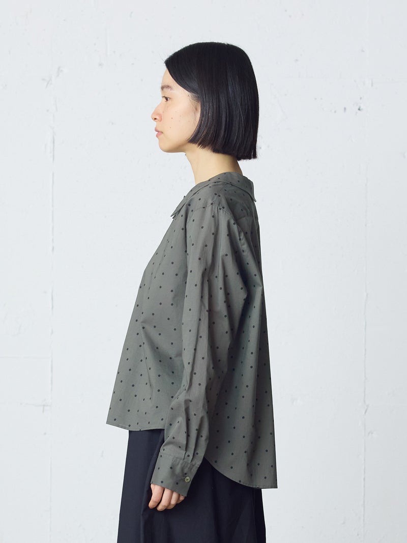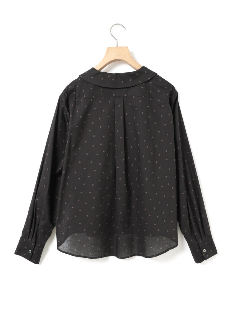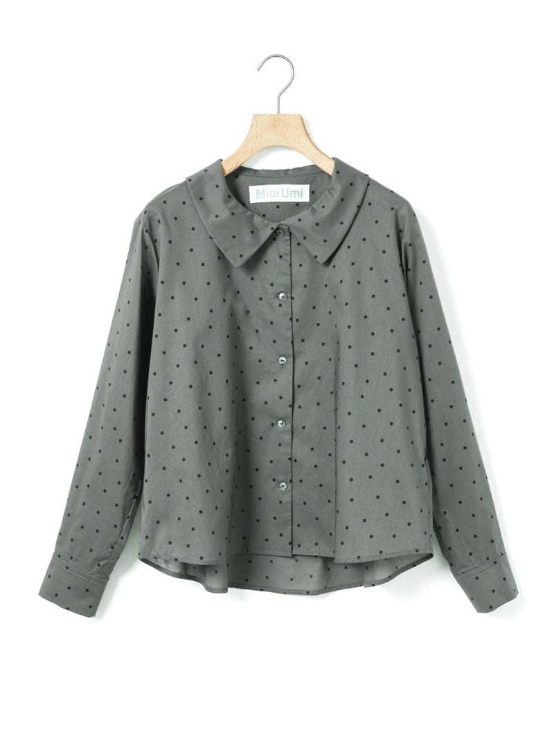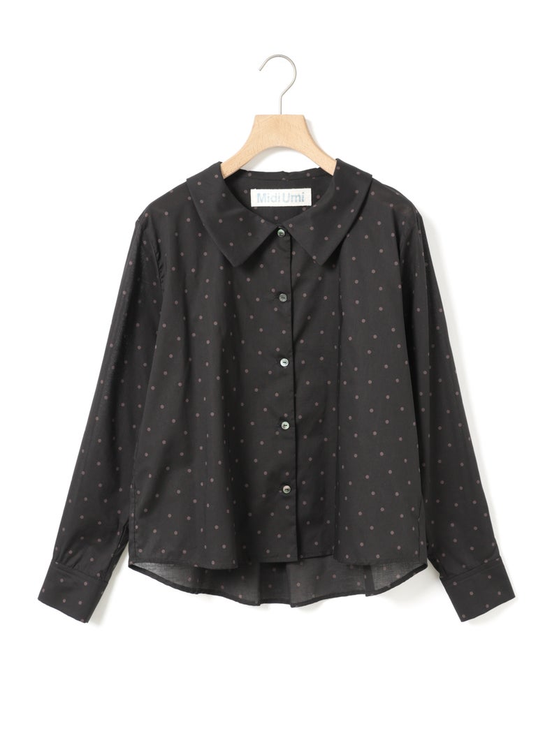 ドット柄の60ローン素材を使用したフラットカラードットシャツです。大人っぽい透け感と落着きのある色目のドットがポイント。大きめのフラットカラーもアクセントになったデザイン。若干の前後差を付けた丈と程よくゆとりのあるサイズ感なので重ね着もしやすく1枚でも着こなしやすいアイテムです。カジュアルアイテムの多いMidiUmiですが、落着きのあるシックな雰囲気に仕上げたこの春お勧めの1枚です。同シリーズ1-750119/ウエスト切り替えドットワンピースも展開。