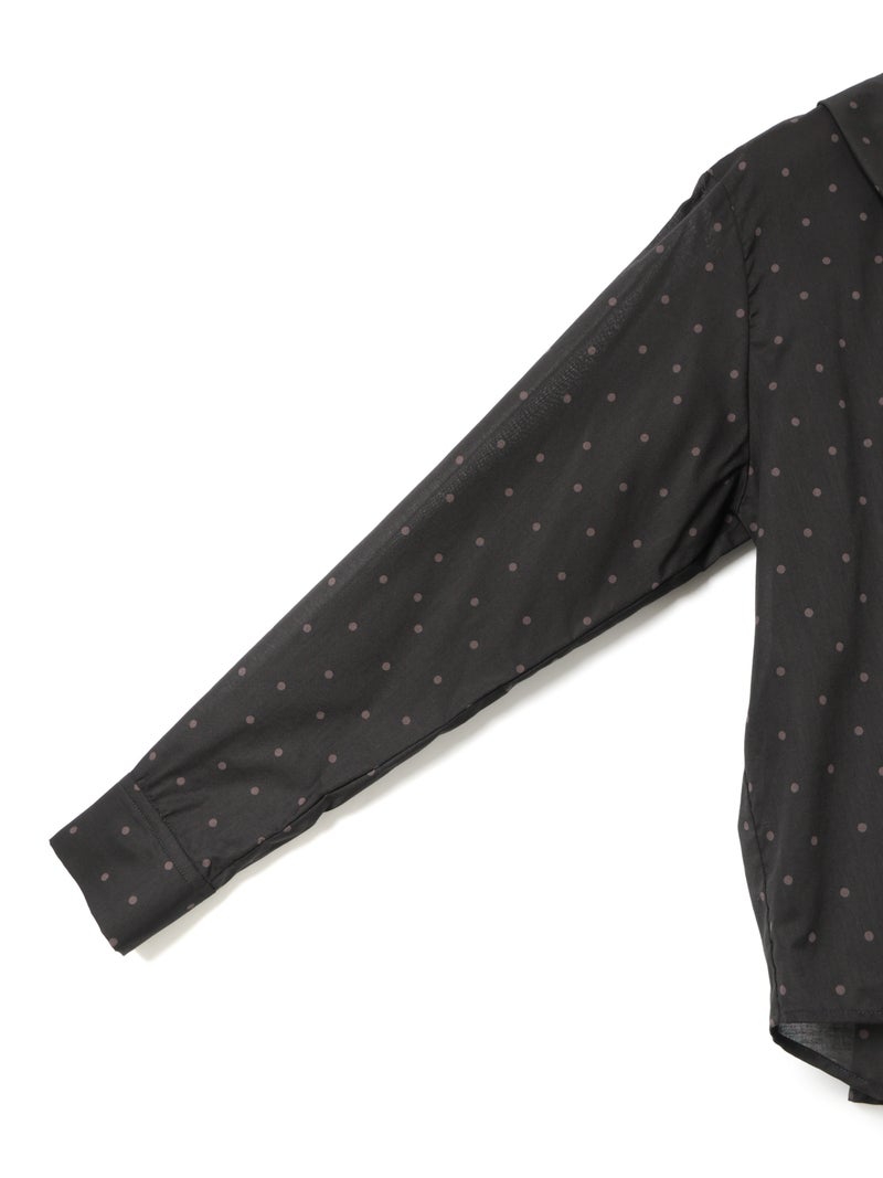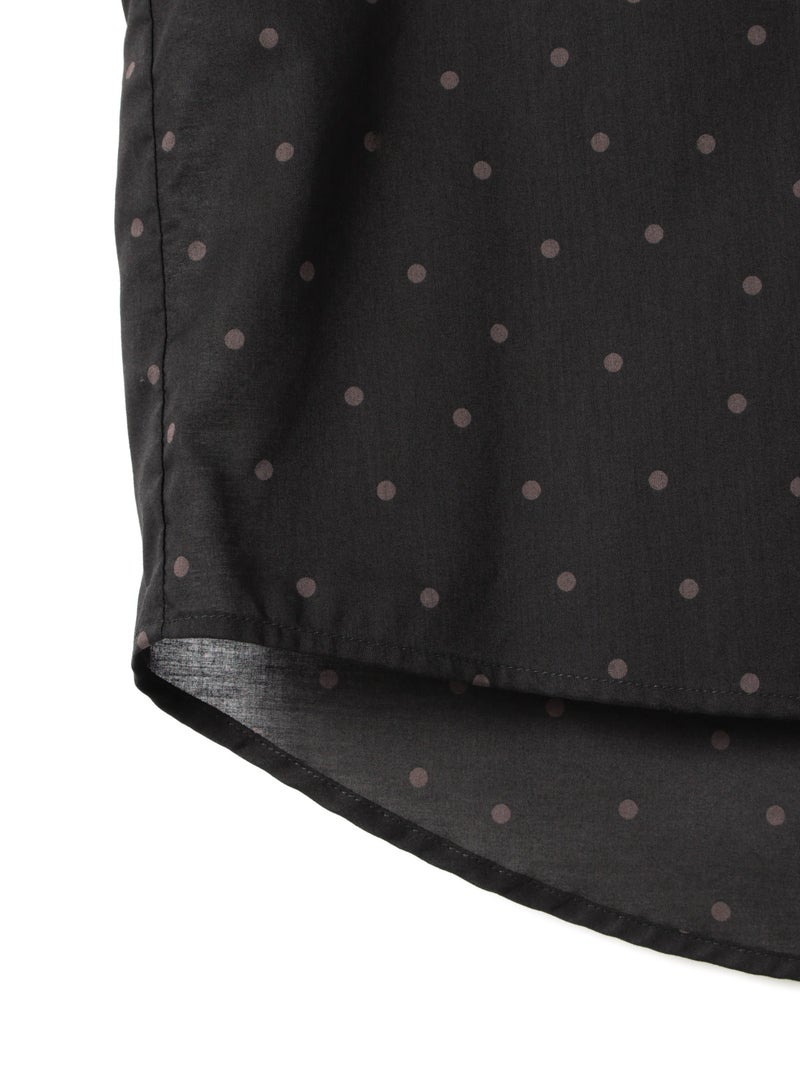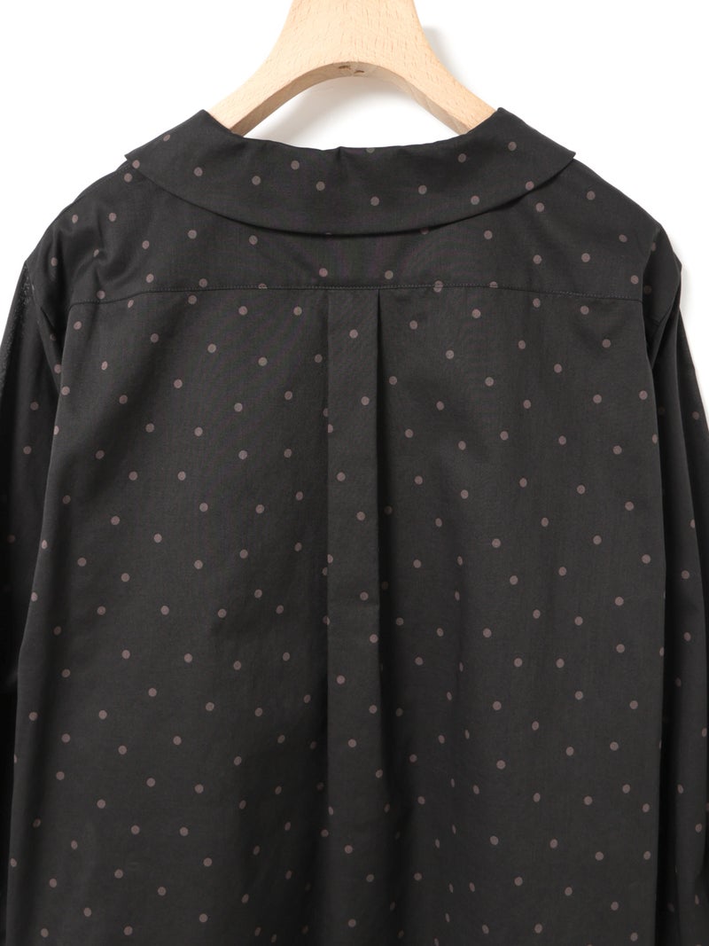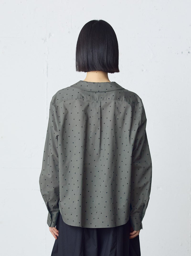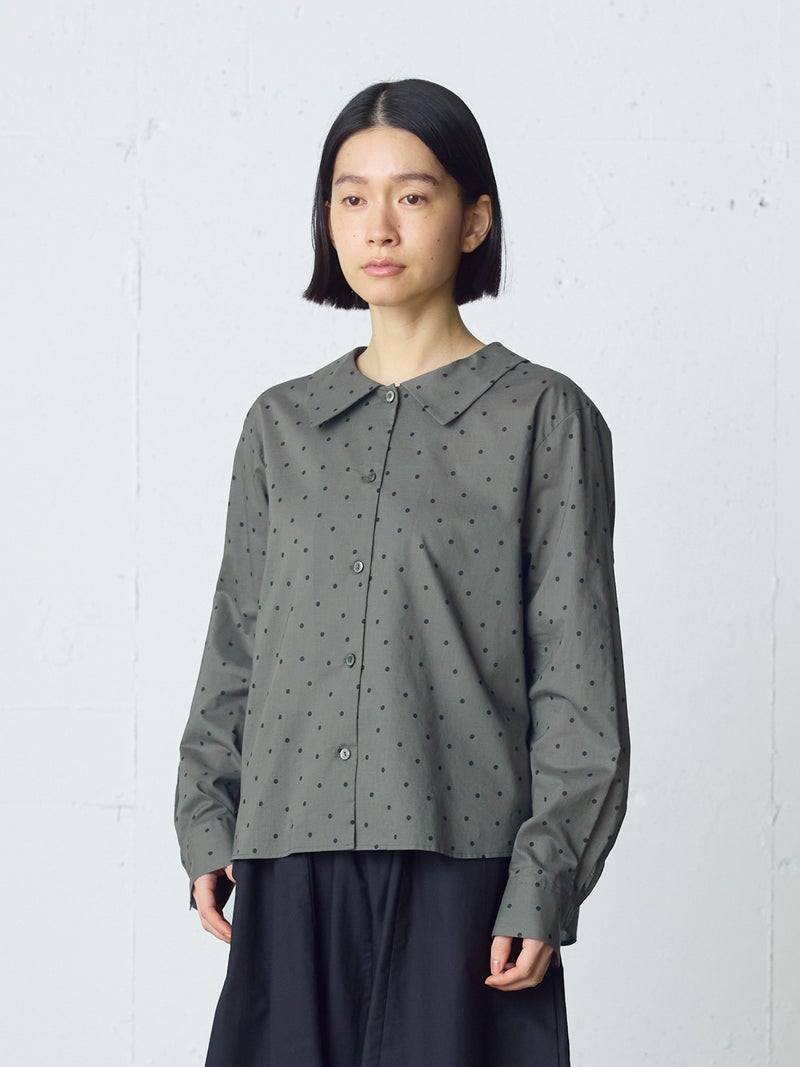 ドット柄の60ローン素材を使用したフラットカラードットシャツです。大人っぽい透け感と落着きのある色目のドットがポイント。大きめのフラットカラーもアクセントになったデザイン。若干の前後差を付けた丈と程よくゆとりのあるサイズ感なので重ね着もしやすく1枚でも着こなしやすいアイテムです。カジュアルアイテムの多いMidiUmiですが、落着きのあるシックな雰囲気に仕上げたこの春お勧めの1枚です。同シリーズ1-750119/ウエスト切り替えドットワンピースも展開。