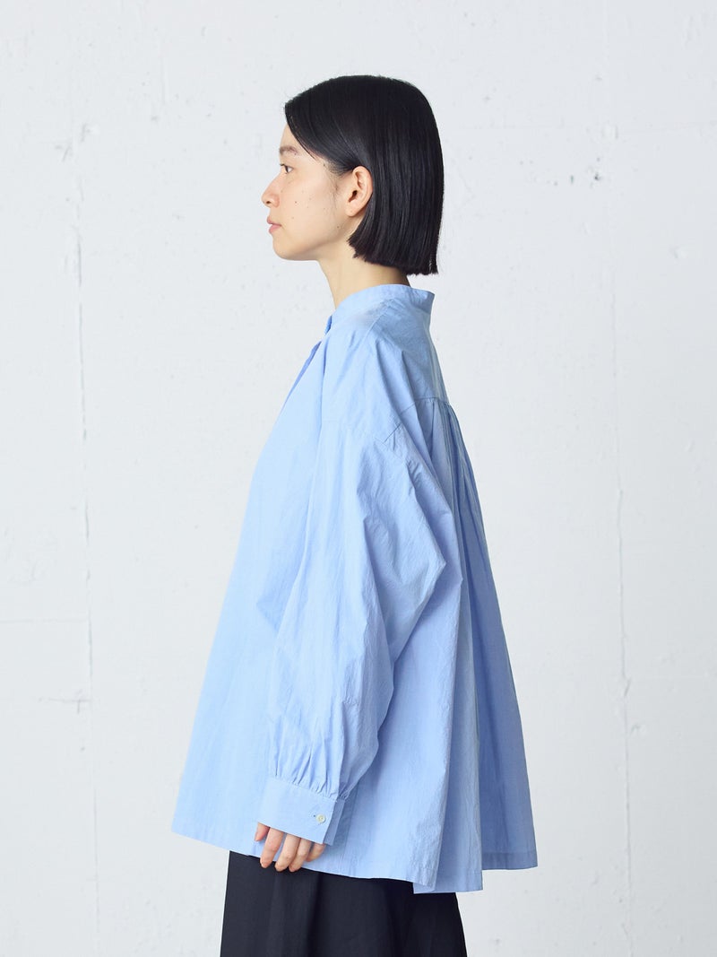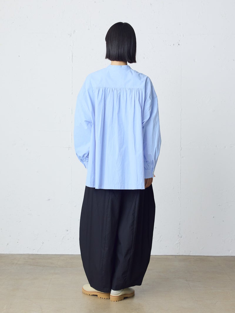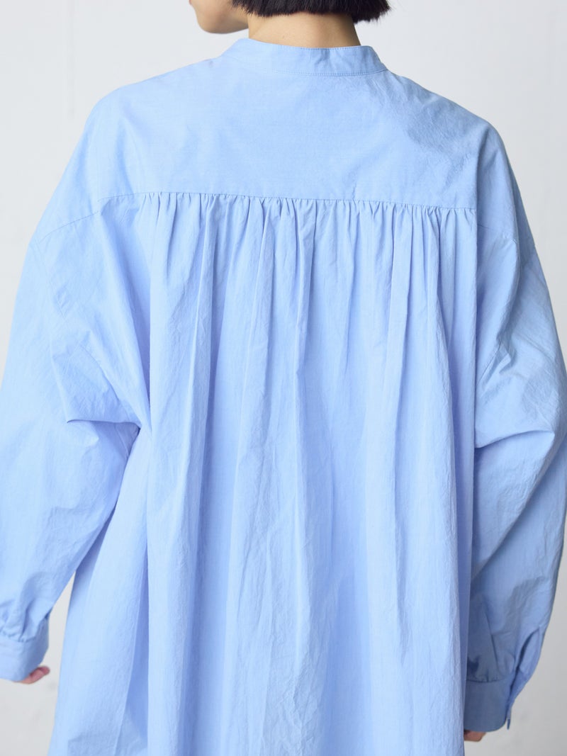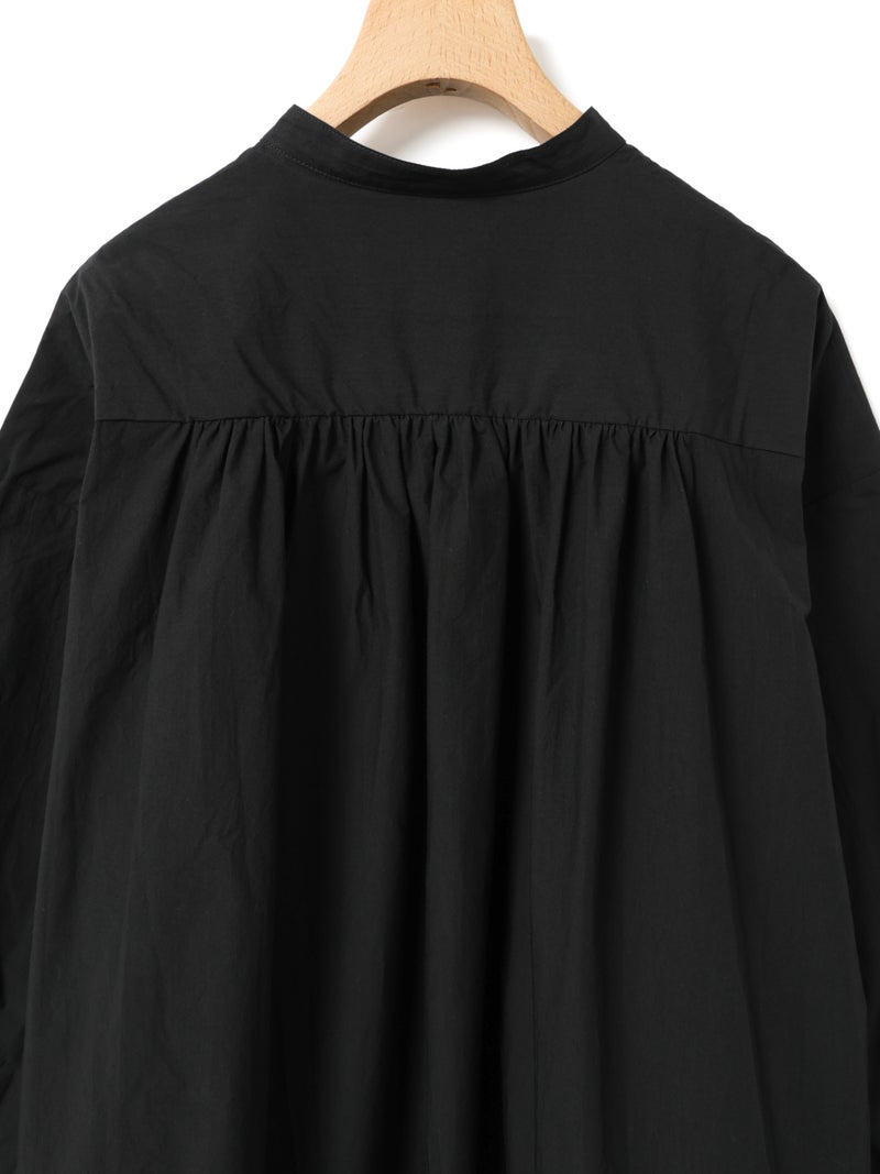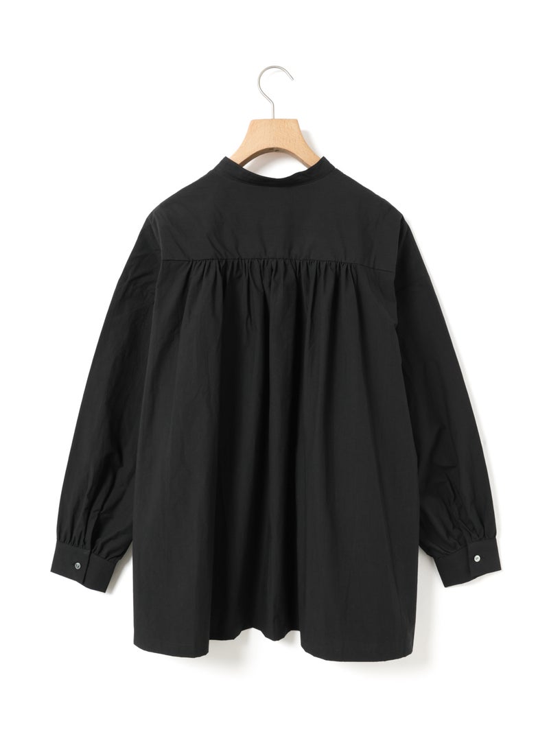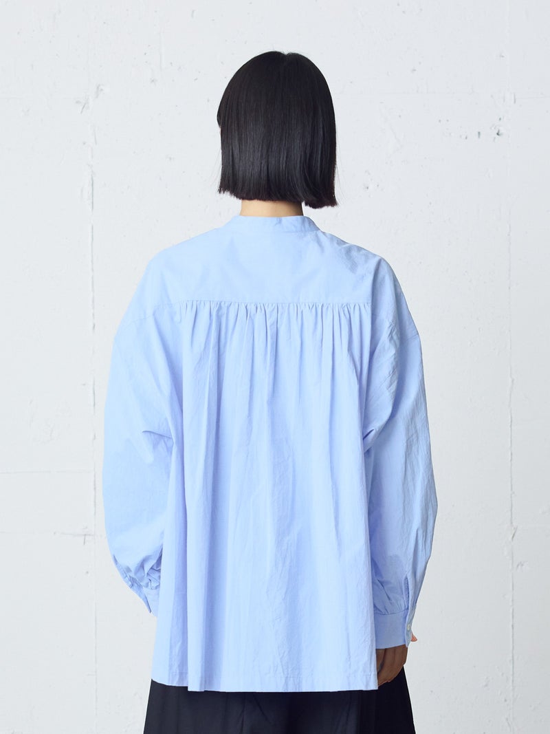 高密度に織られたタイプライター生地を使用したワイドバックギャザーシャツです。播州でワッシャー加工を施した、ヴィンテージライクな1枚。着丈は長めに、後ろはたっぷりギャザーを施したワイドなシルエットが魅力。シンプルに一枚で着用しても雰囲気のある着こなしを演出します。ベストを重ねてみたり、カーディガンを羽織ってみたりと季節に合わせて幅広くコーディネートしていいただける1枚です。