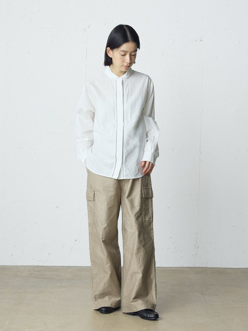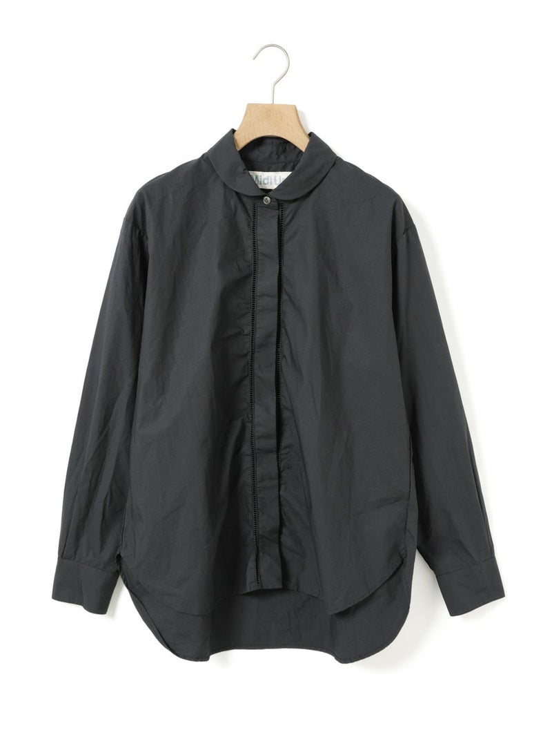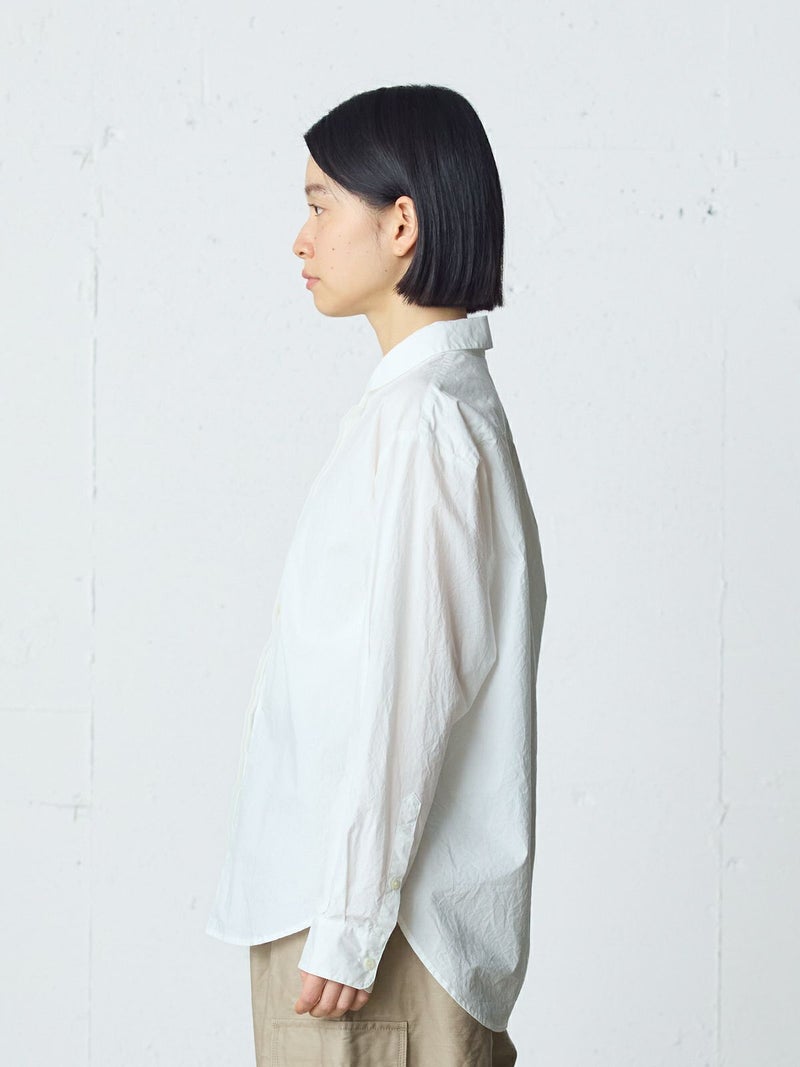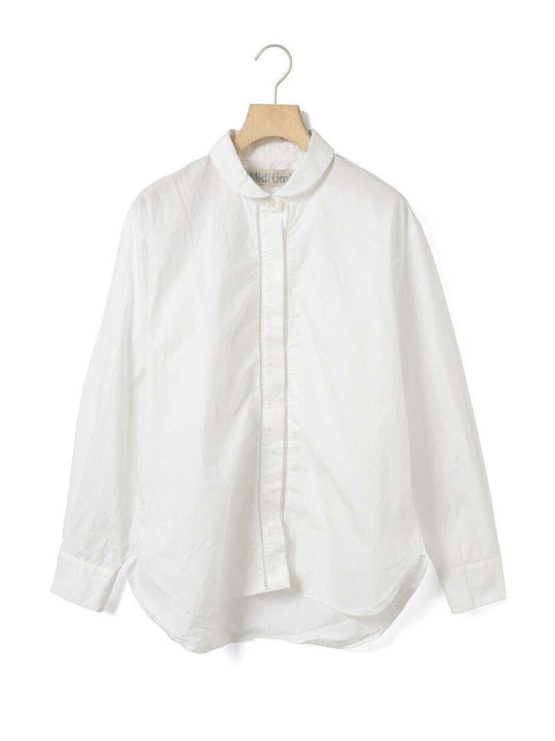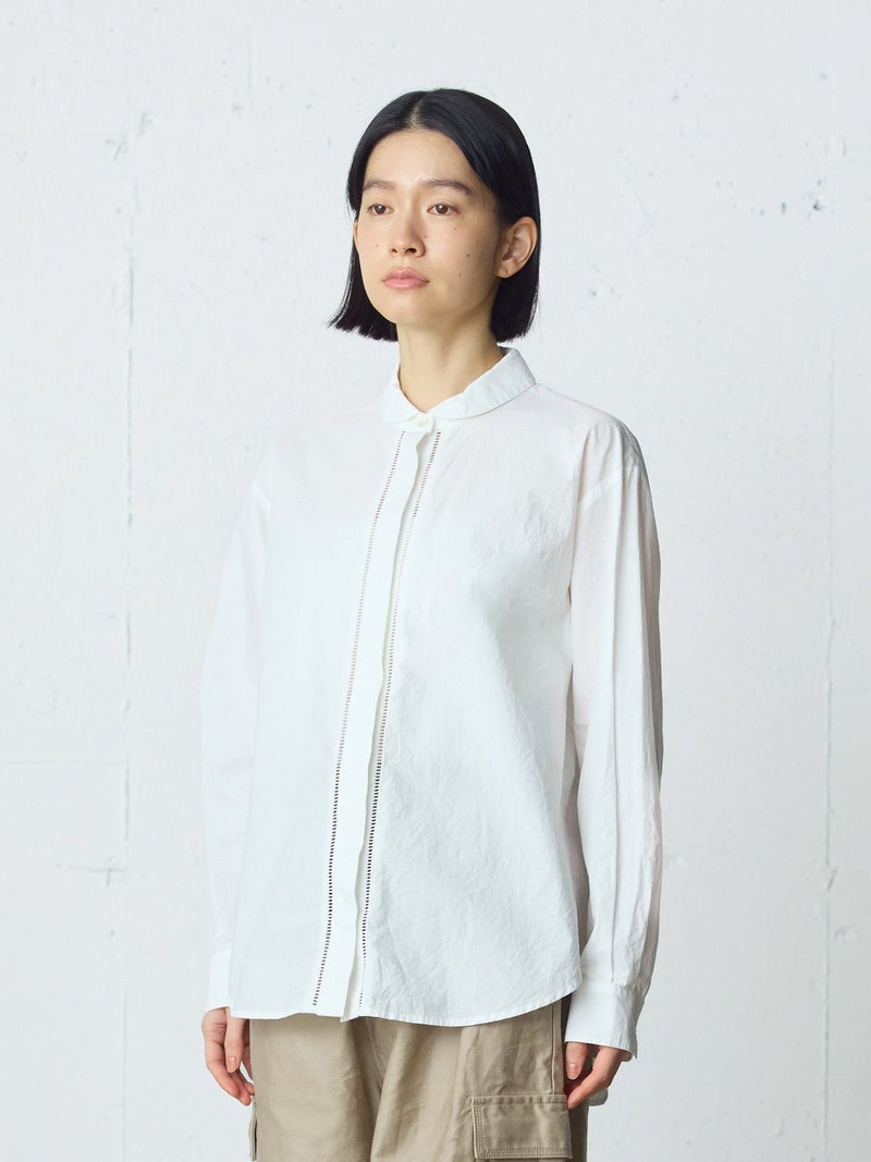 40タイプライターを使用したダッチカラーレースシャツ。洗いのかかった生地のナチュラルな雰囲気が楽しめます。前立てにハシゴレースを使用。首周りに沿って折り返したダッチカラーはすっきり感があり丸襟の控えめな可愛さがポイント。比翼仕立てにし、ボディはレギュラーサイズに仕上げ、甘すぎないベーシックな雰囲気を表現しています。インナー使いにもお勧めの1枚です。同じ素材でデザインした1-730155/フロントフリルレースシャツも展開。