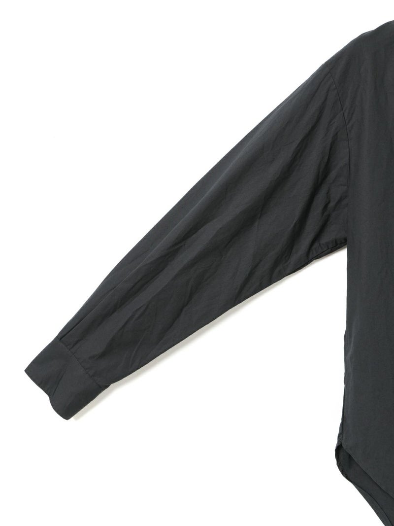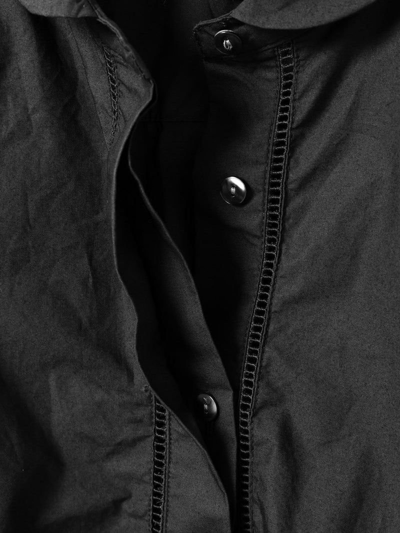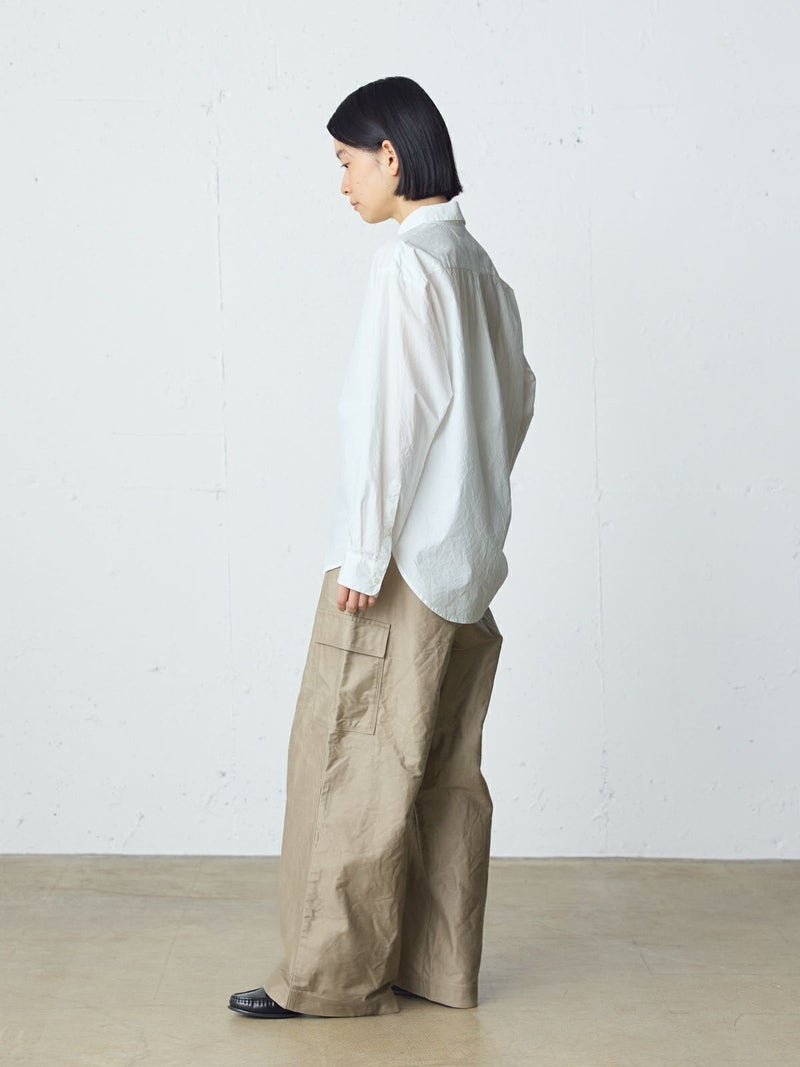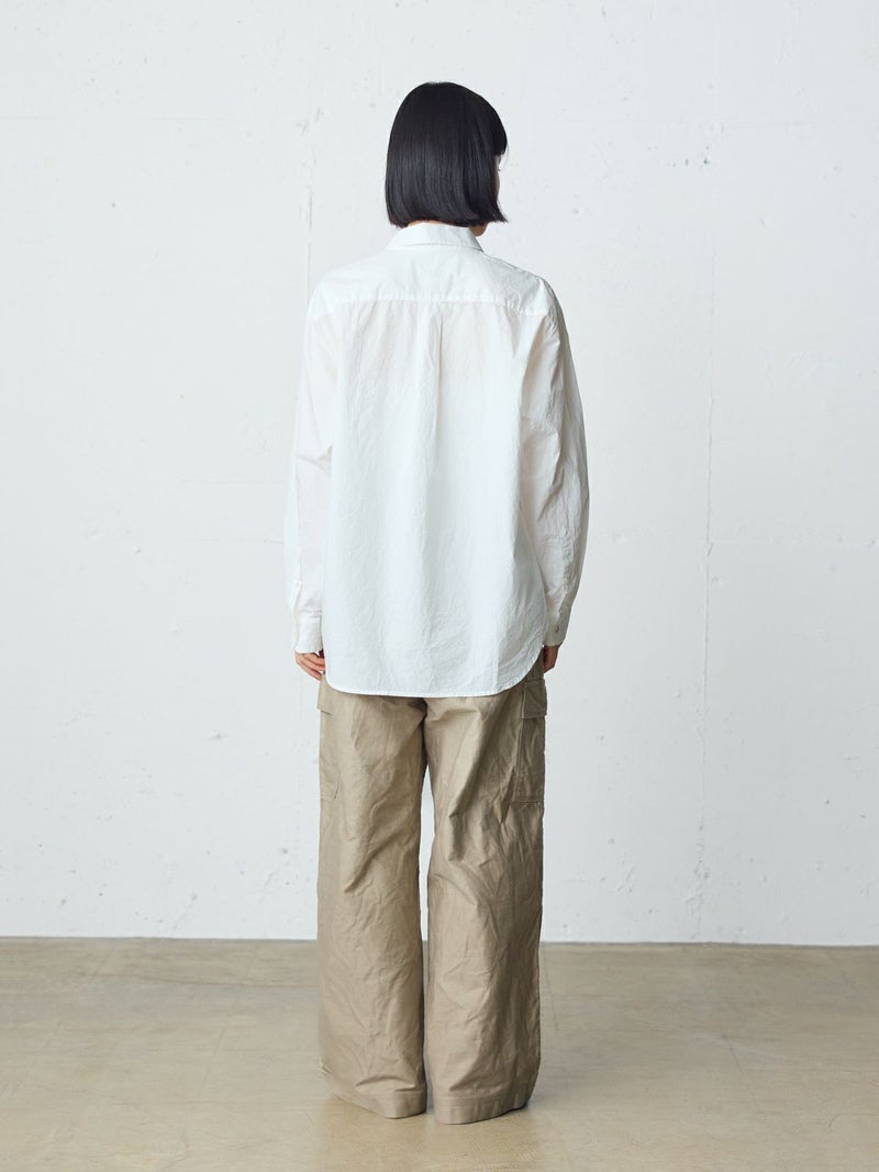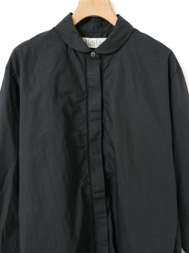 40タイプライターを使用したダッチカラーレースシャツ。洗いのかかった生地のナチュラルな雰囲気が楽しめます。前立てにハシゴレースを使用。首周りに沿って折り返したダッチカラーはすっきり感があり丸襟の控えめな可愛さがポイント。比翼仕立てにし、ボディはレギュラーサイズに仕上げ、甘すぎないベーシックな雰囲気を表現しています。インナー使いにもお勧めの1枚です。同じ素材でデザインした1-730155/フロントフリルレースシャツも展開。