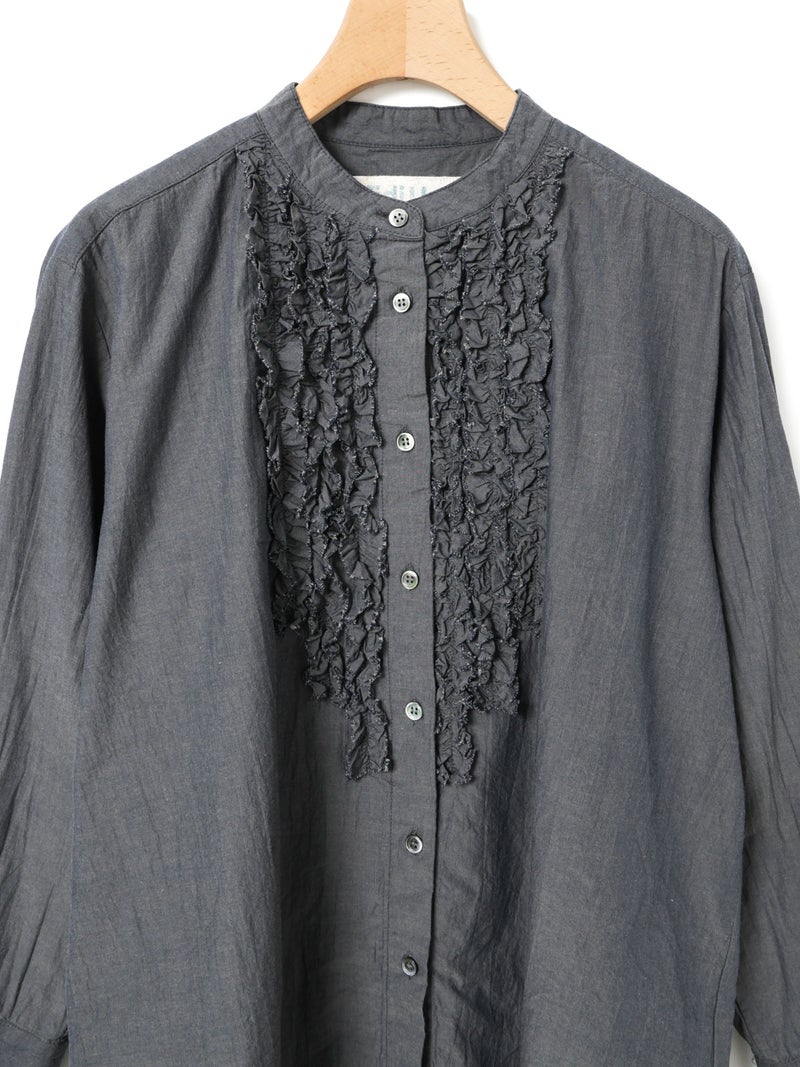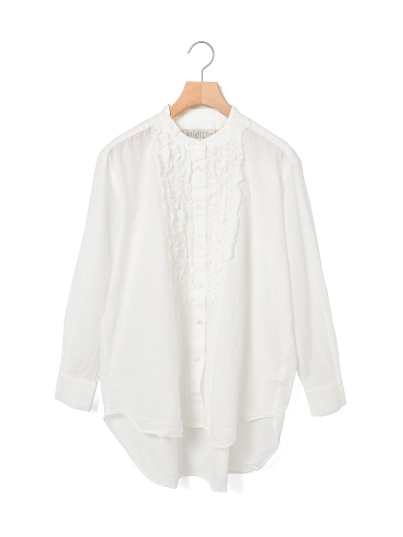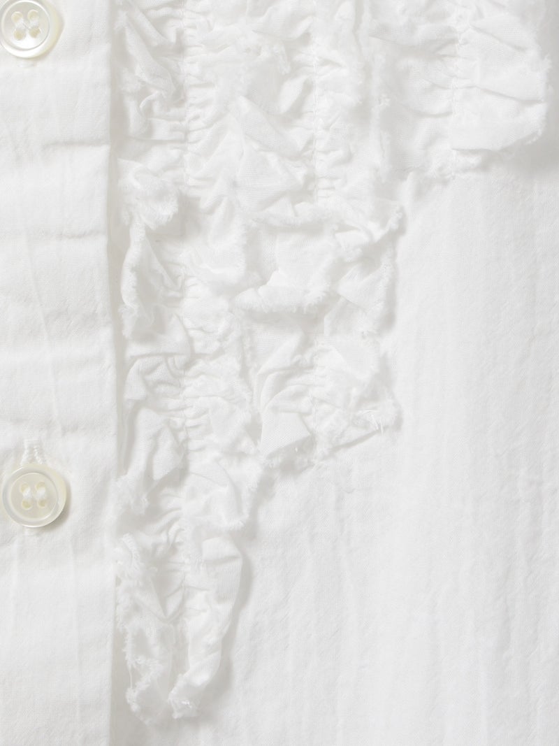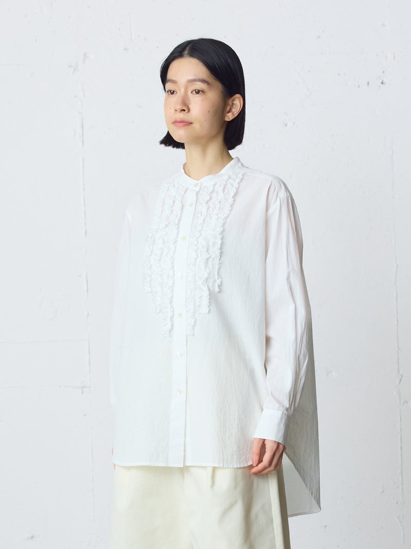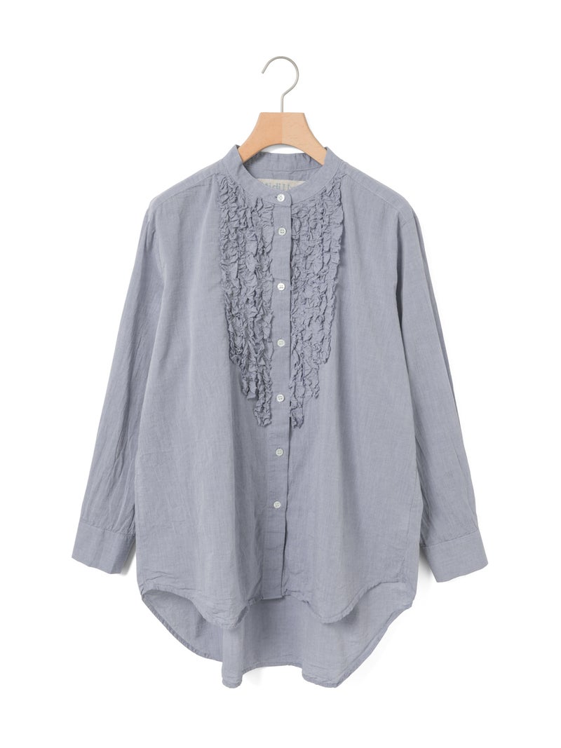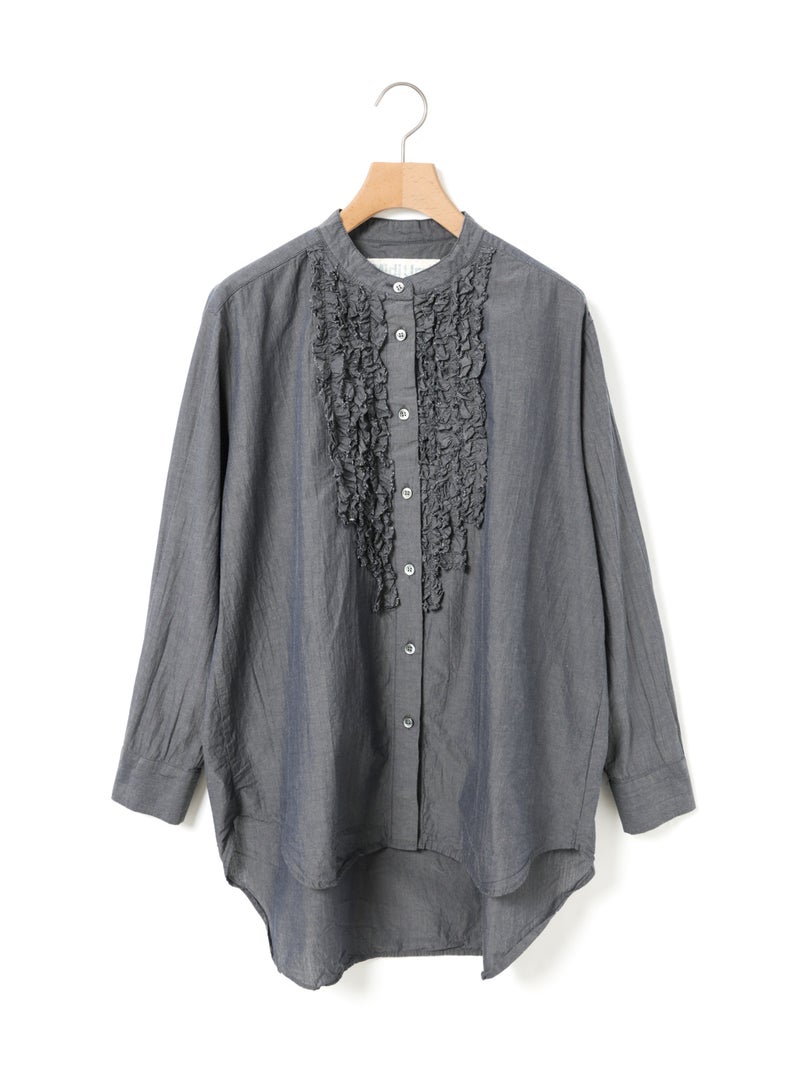 ワッシャー加工を施した雰囲気のある生地感が特徴のフロントフリルシャツです。フロントにフリルを施した上品な1枚で着丈は少し長めにデザインしました。きれいめにもカジュアルにもコーディネートを楽しんでいただけ、着用しやすいサイズ感に仕上がっています。前後差を付けた裾ラインは丸みのある女性らしいシルエットを表現。重ね着アイテムとしても役立つ1枚となっています。