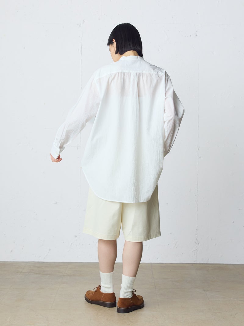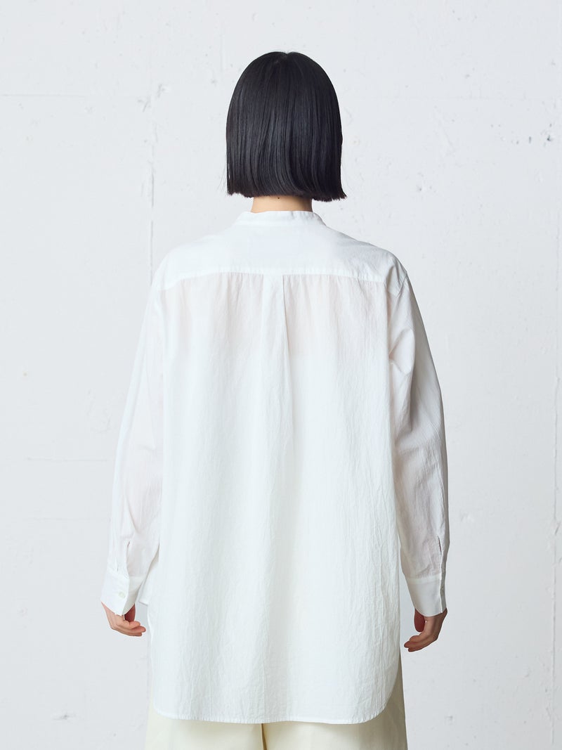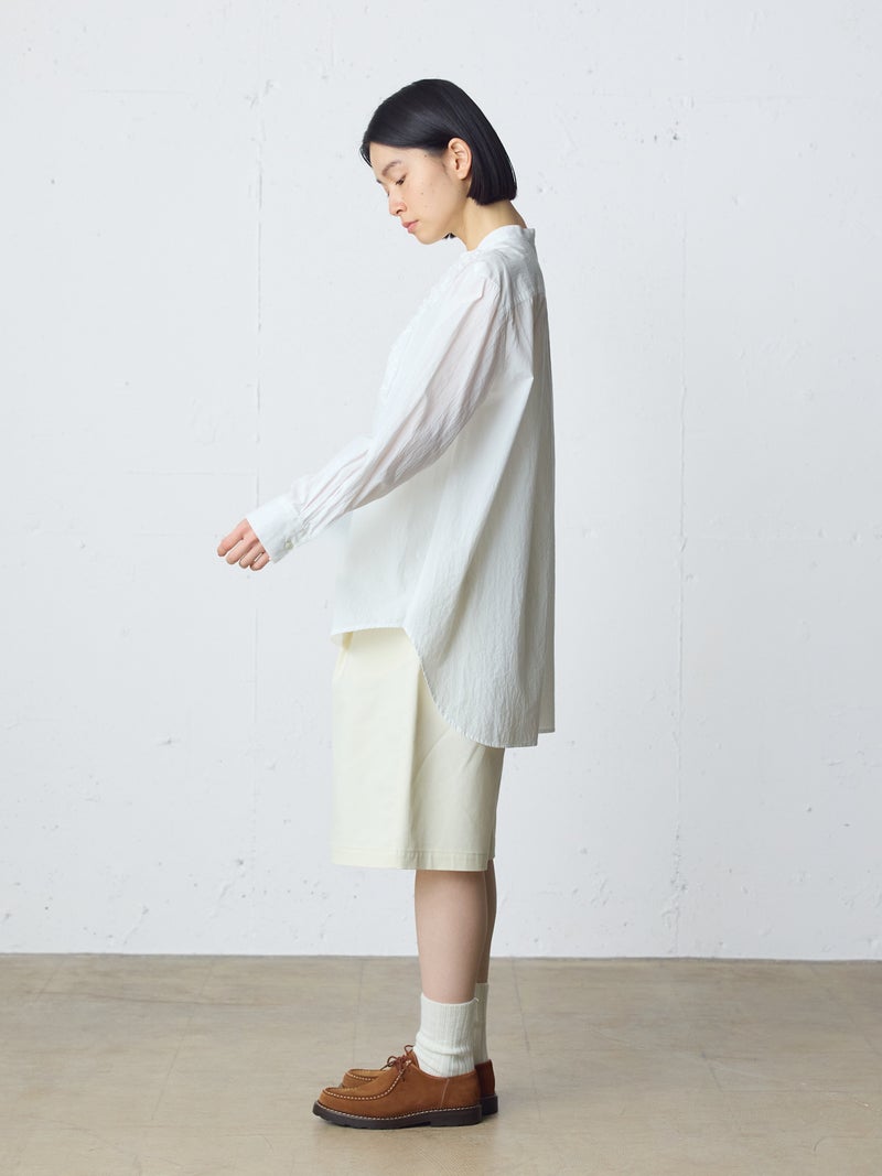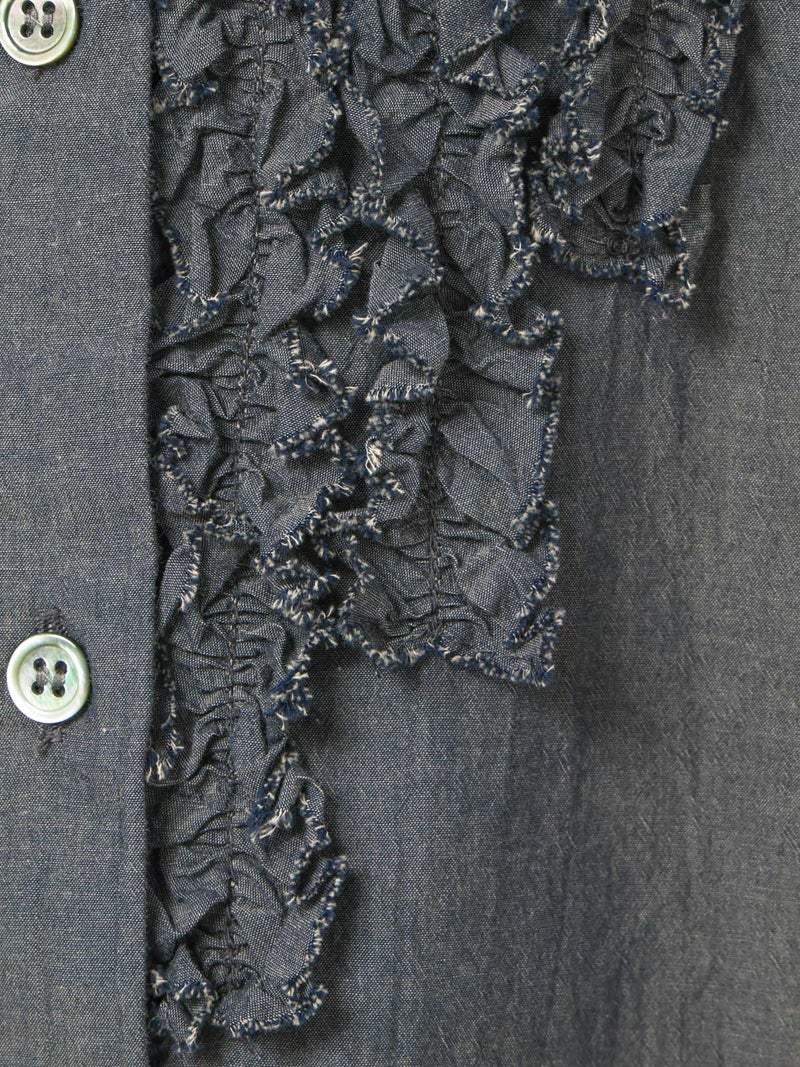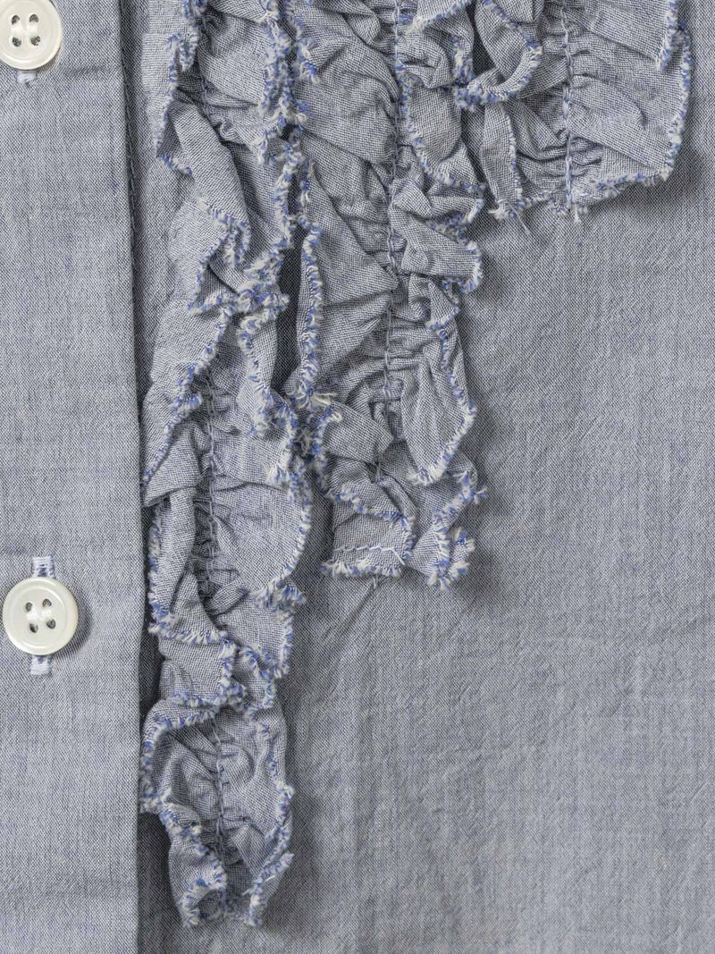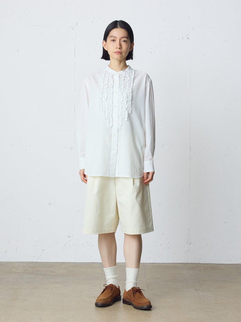 ワッシャー加工を施した雰囲気のある生地感が特徴のフロントフリルシャツです。フロントにフリルを施した上品な1枚で着丈は少し長めにデザインしました。きれいめにもカジュアルにもコーディネートを楽しんでいただけ、着用しやすいサイズ感に仕上がっています。前後差を付けた裾ラインは丸みのある女性らしいシルエットを表現。重ね着アイテムとしても役立つ1枚となっています。