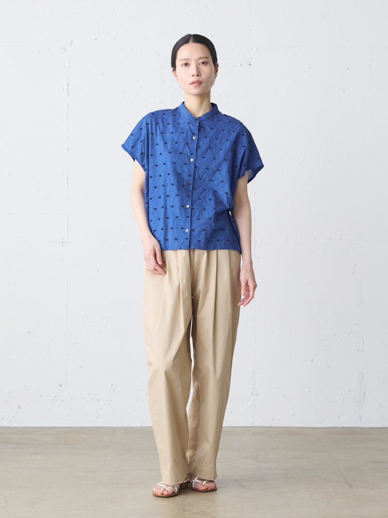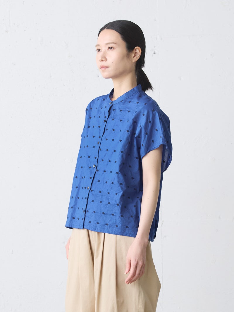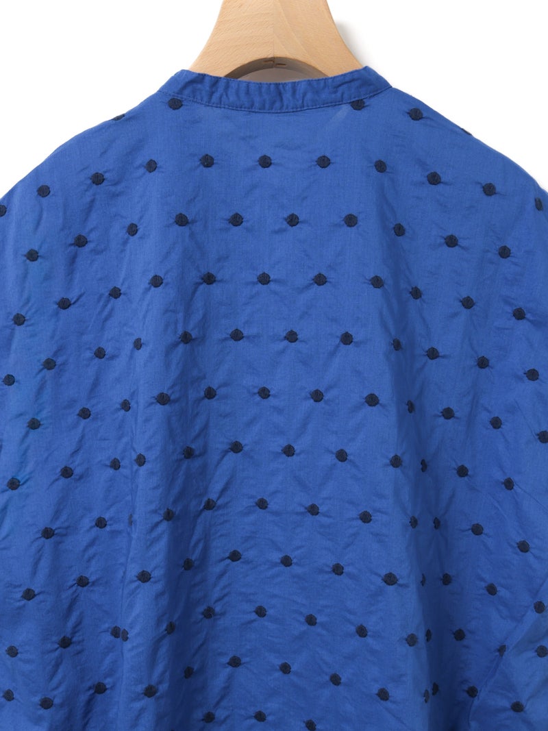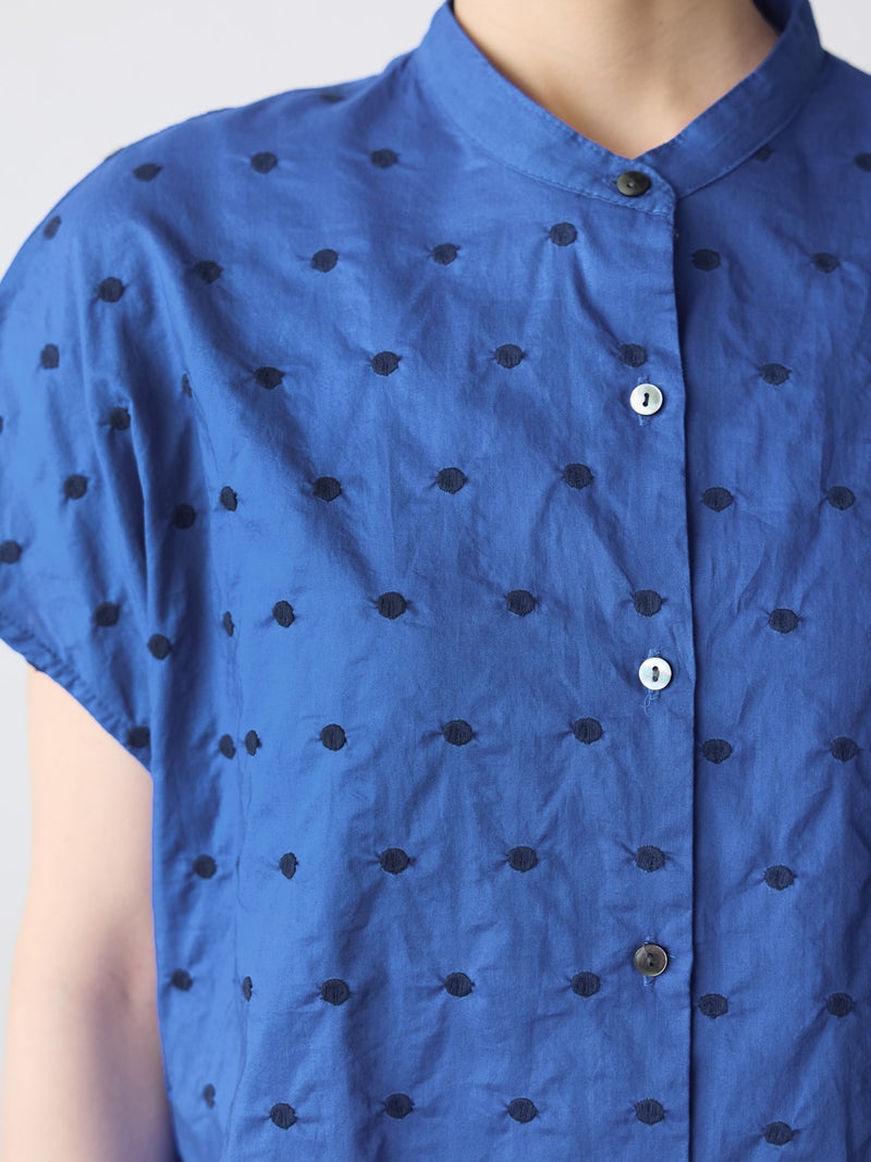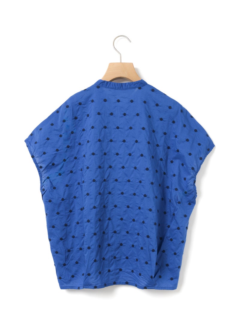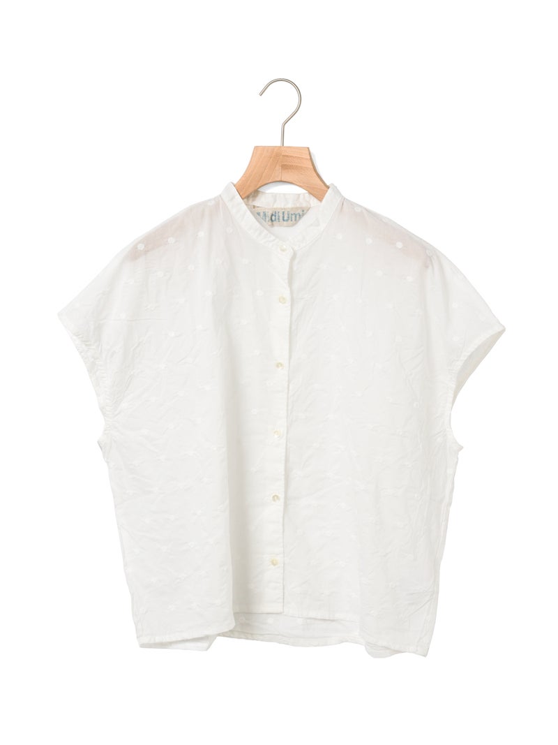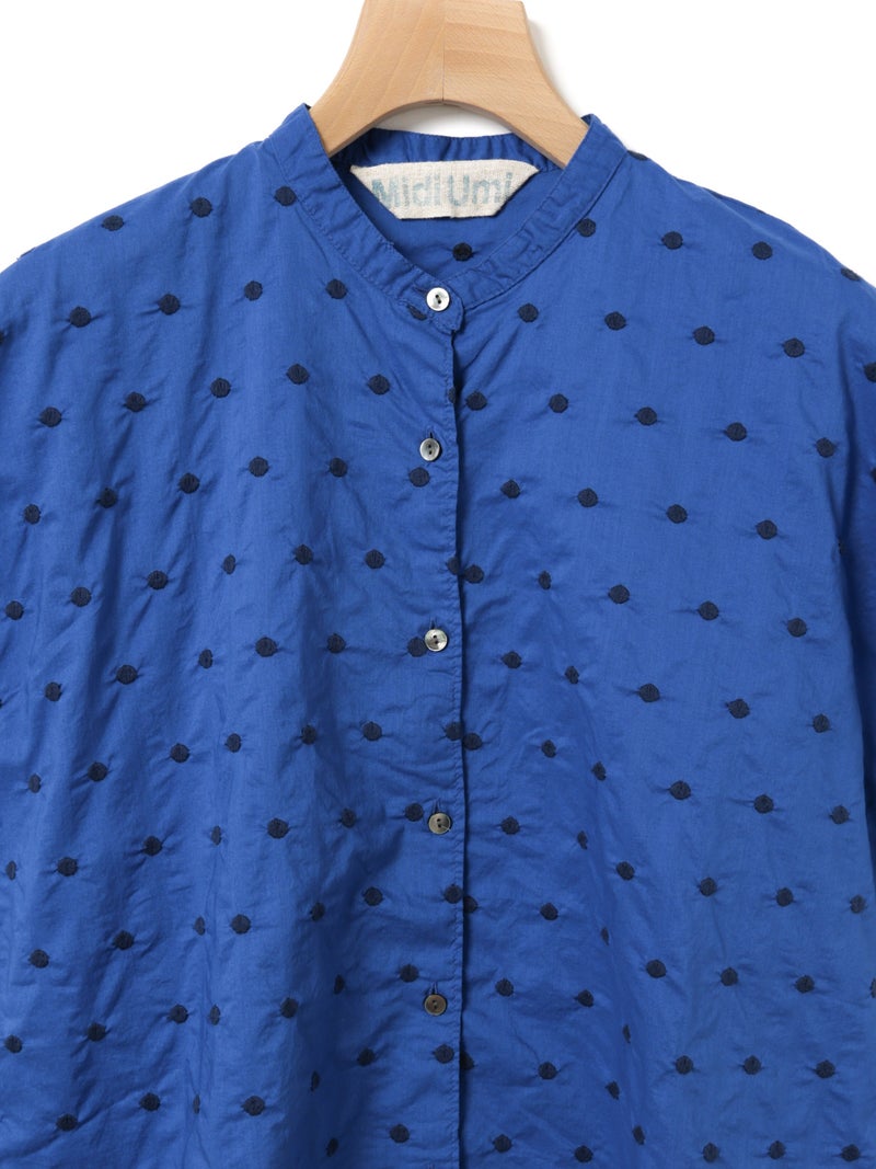 昨年展開していたMidiUmiのドットシャツが今季も入荷しました。ポコポコとした刺繍ドットがシャツ全体に散らばったドット柄シャツノースリーブです。身頃も袖幅も広く、風通しのよいシルエットを表現しました。フロントボタンを使用した羽織っても着こなせるデザインです。裾は若干の前後差を付けています。ドットの配色は同色で揃えたホワイトとブラック、ブルーのみ配色が異なり、ネイビーのドットがより目立ったデザインになっています。薄手の生地を使用したことで清涼感を感じていただける1枚です。同シリーズ1-730169/ドット柄ワイドシャツプルオーバーも展開。