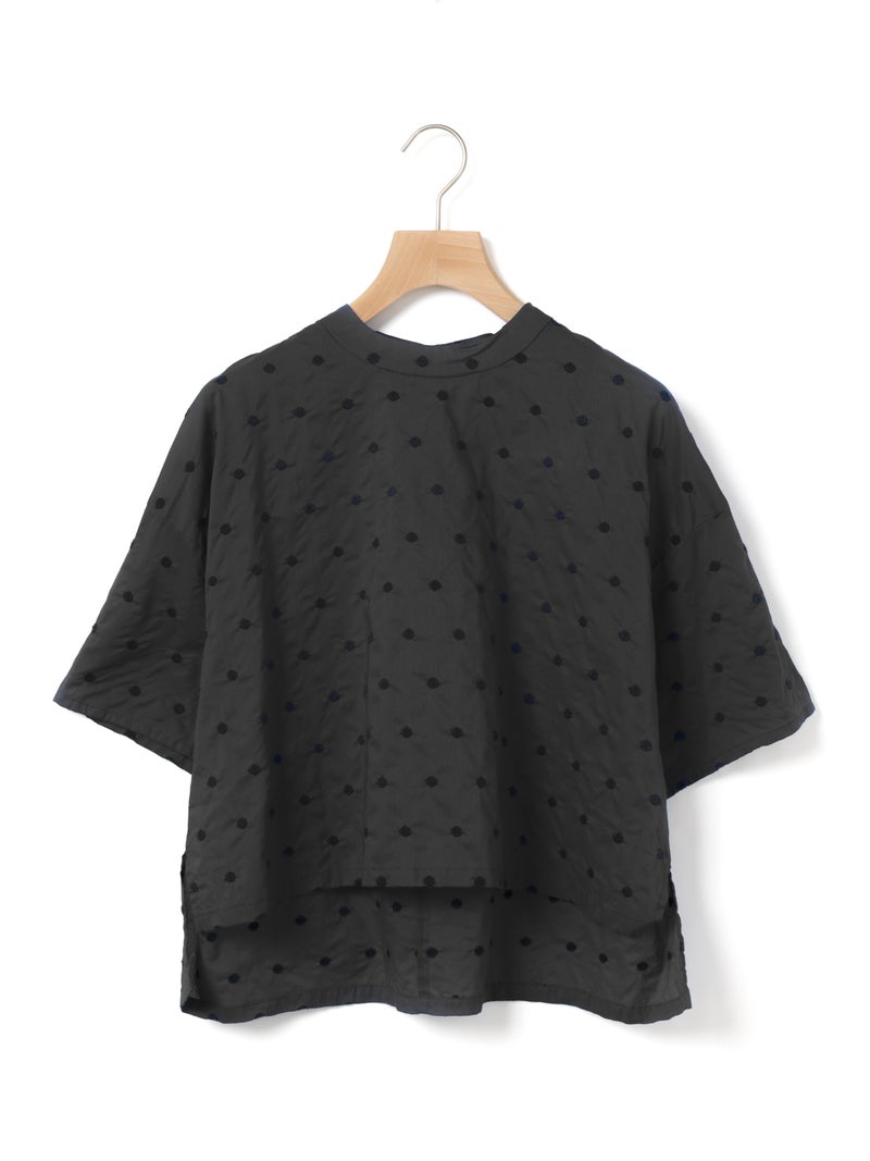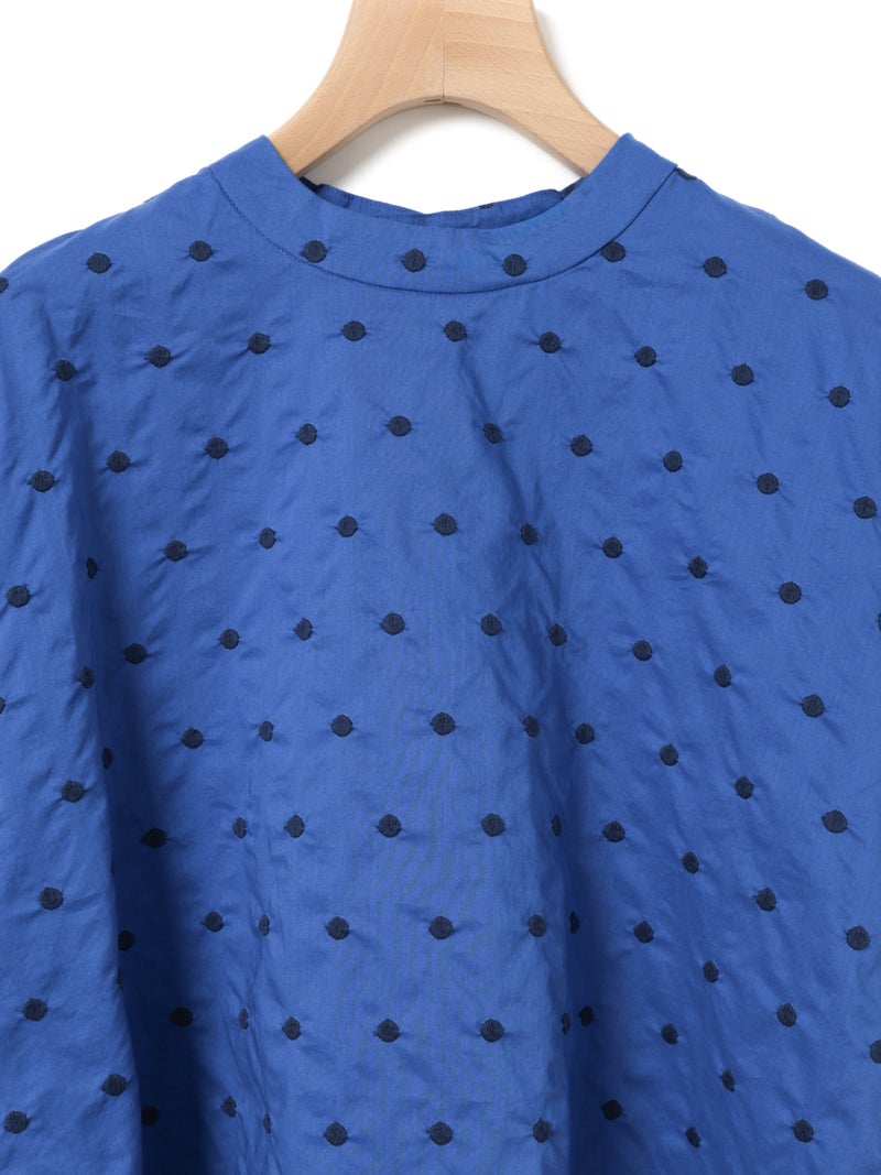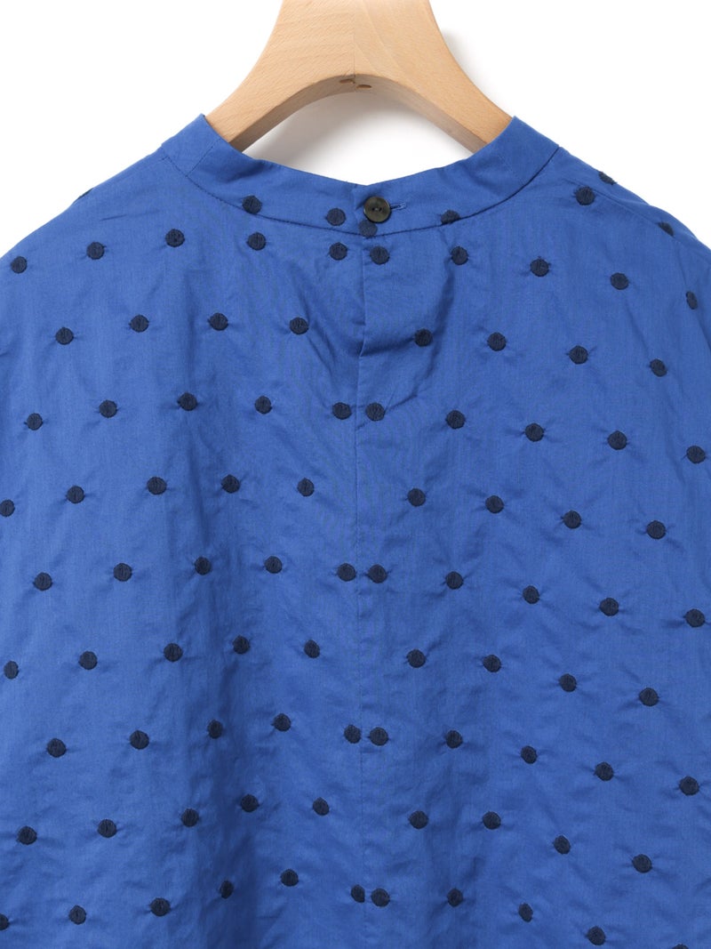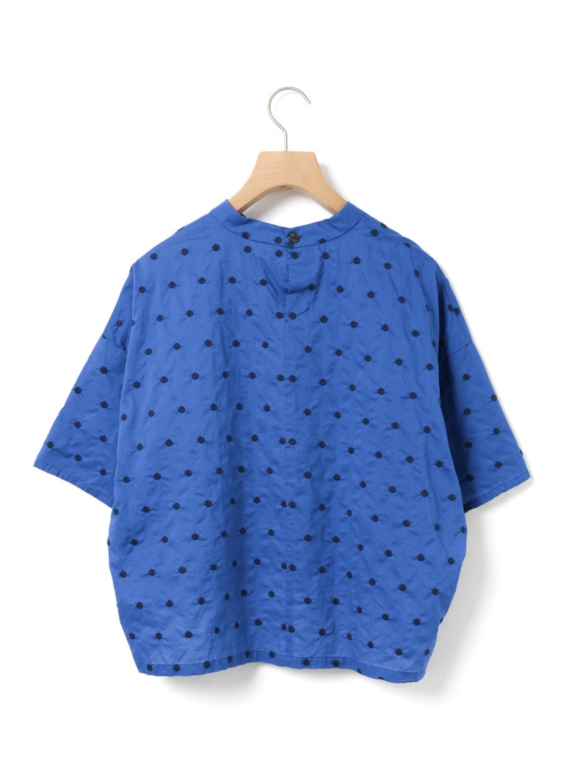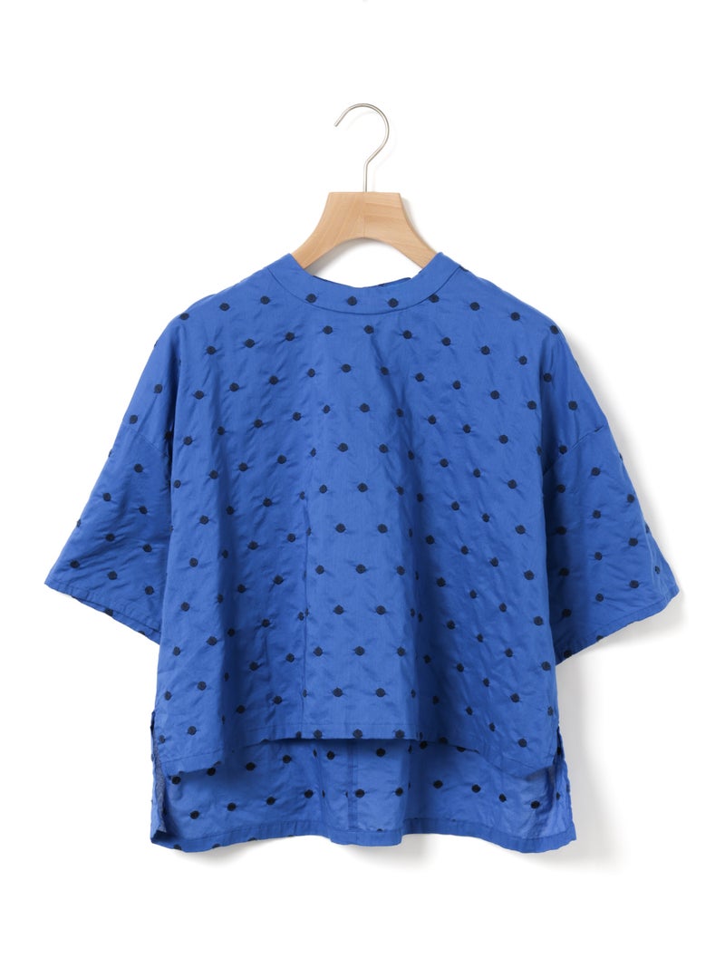 昨年展開していたMidiUmiのドットシャツが今季も入荷しました。ポコポコとした刺繍ドットがシャツ全体に散らばったドット柄ワイドシャツプルオーバーです。フロントはすっきりとした丈感、バックはヒップに掛かるほどの丈で前後差を付けています。身頃も袖幅も広く、風通しのよいシルエットを表現しました。バックネック部分にボタンが付いています。ドットの配色は同色で揃えたホワイトとブラック、ブルーのみ配色が異なり、ネイビーのドットがより目立ったデザインになっています。薄手の生地を使用したことで清涼感を感じていただける1枚です。同シリーズ1-730168/ドット柄シャツノースリーブも展開。