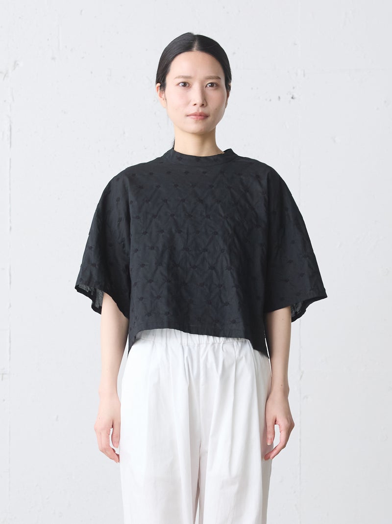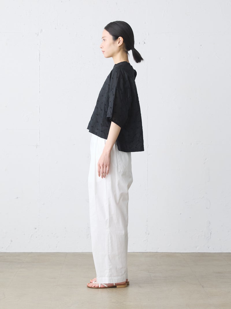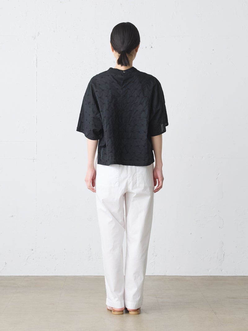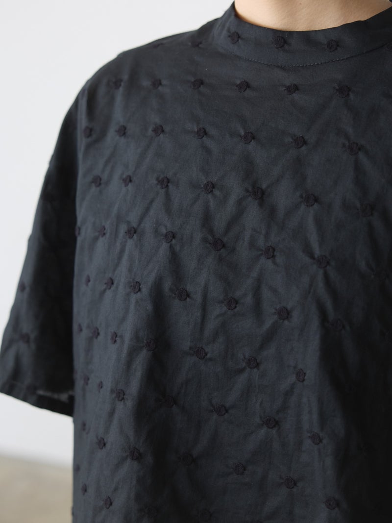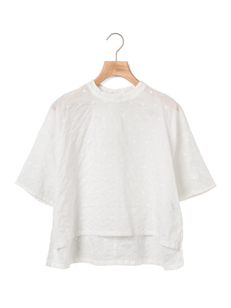 昨年展開していたMidiUmiのドットシャツが今季も入荷しました。ポコポコとした刺繍ドットがシャツ全体に散らばったドット柄ワイドシャツプルオーバーです。フロントはすっきりとした丈感、バックはヒップに掛かるほどの丈で前後差を付けています。身頃も袖幅も広く、風通しのよいシルエットを表現しました。バックネック部分にボタンが付いています。ドットの配色は同色で揃えたホワイトとブラック、ブルーのみ配色が異なり、ネイビーのドットがより目立ったデザインになっています。薄手の生地を使用したことで清涼感を感じていただける1枚です。同シリーズ1-730168/ドット柄シャツノースリーブも展開。