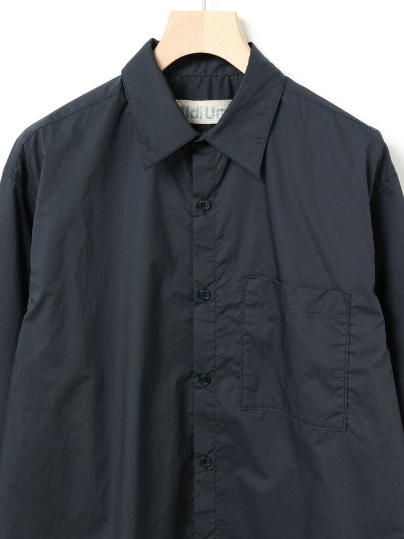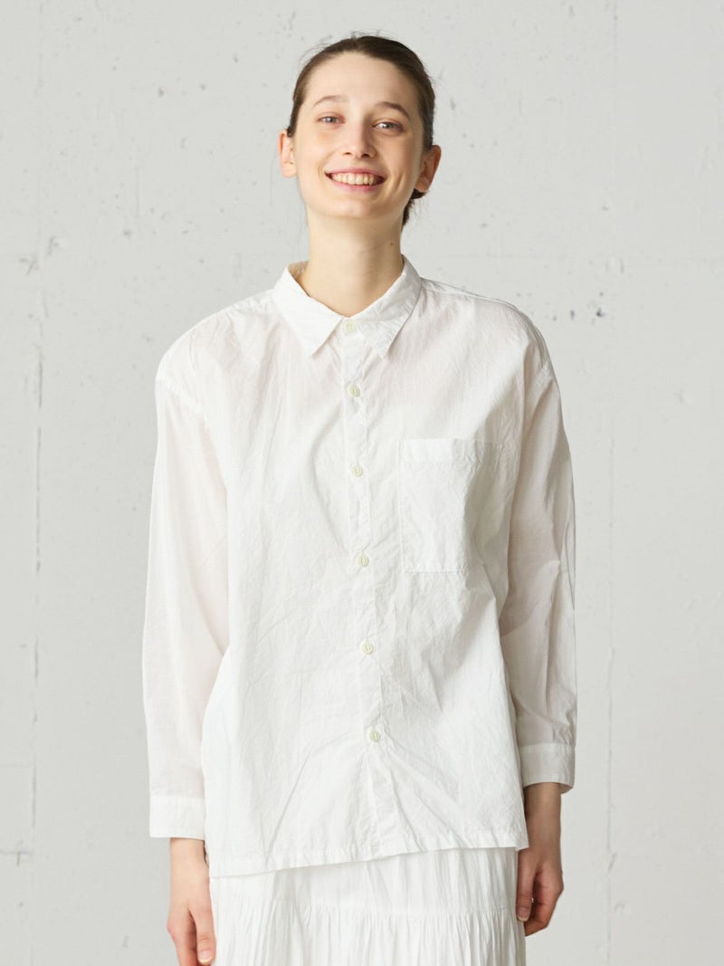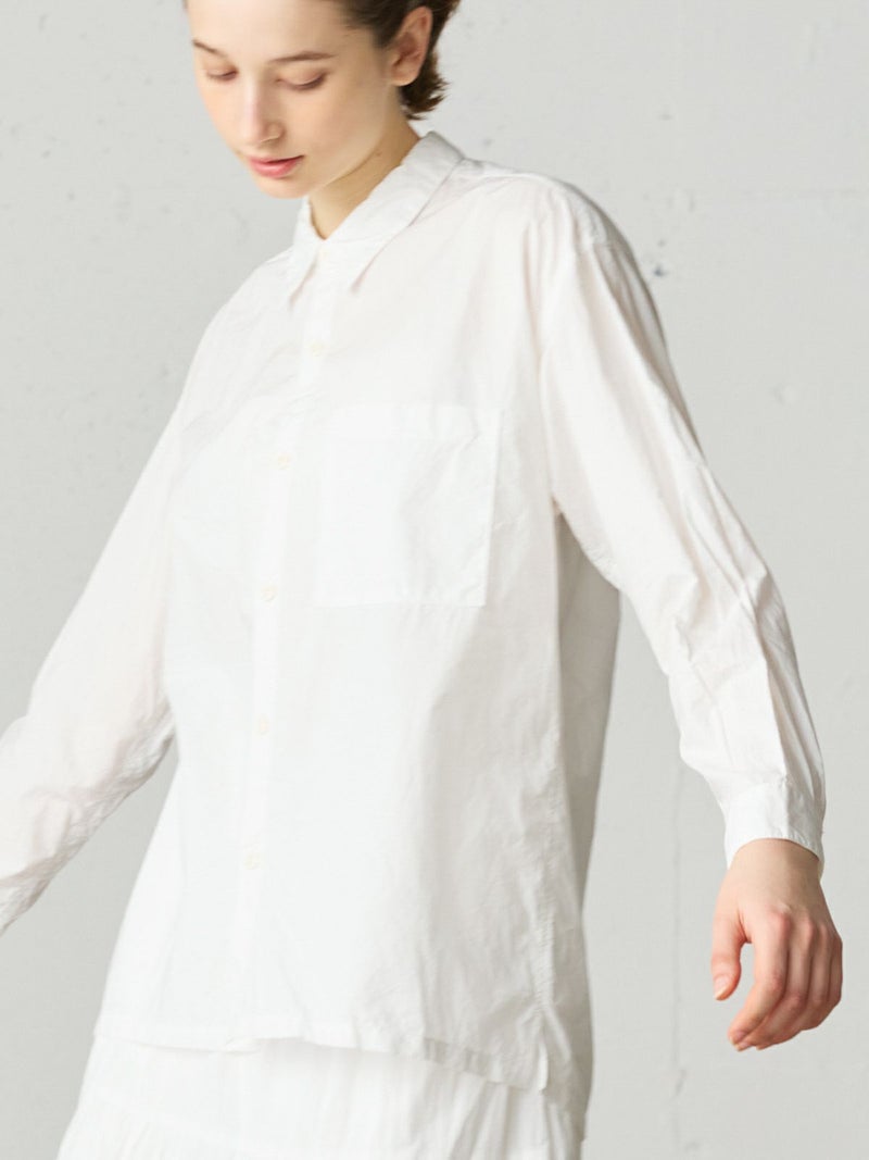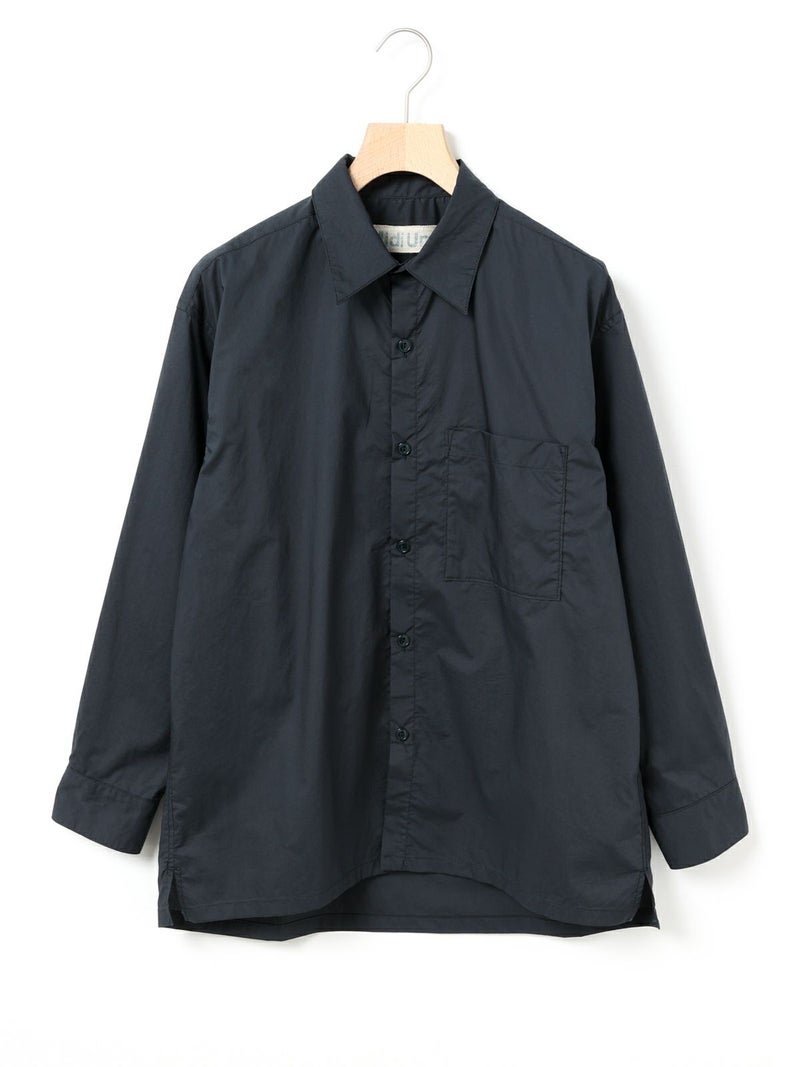 薄手のタイプライターを使用したワークシャツ。サラッとした素材感と程よい透け感がポイントの今季おすすめのベーシックな1枚です。胸ポケット付き。ヒップの隠れる少し長めのシルエットでシンプルに着こなせるシャツとなっています。オフホワイトとネイビーの合わせやすい2色展開。カジュアルなコーディネートに欠かせない大人のシャツを演出します。