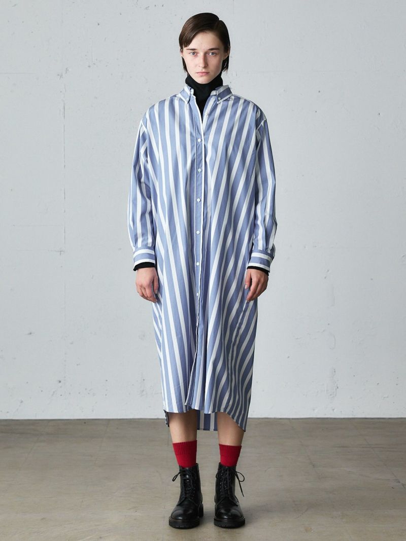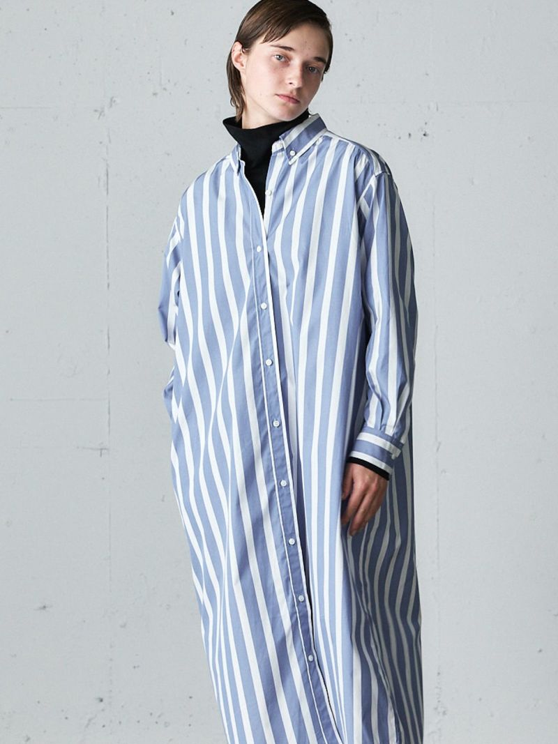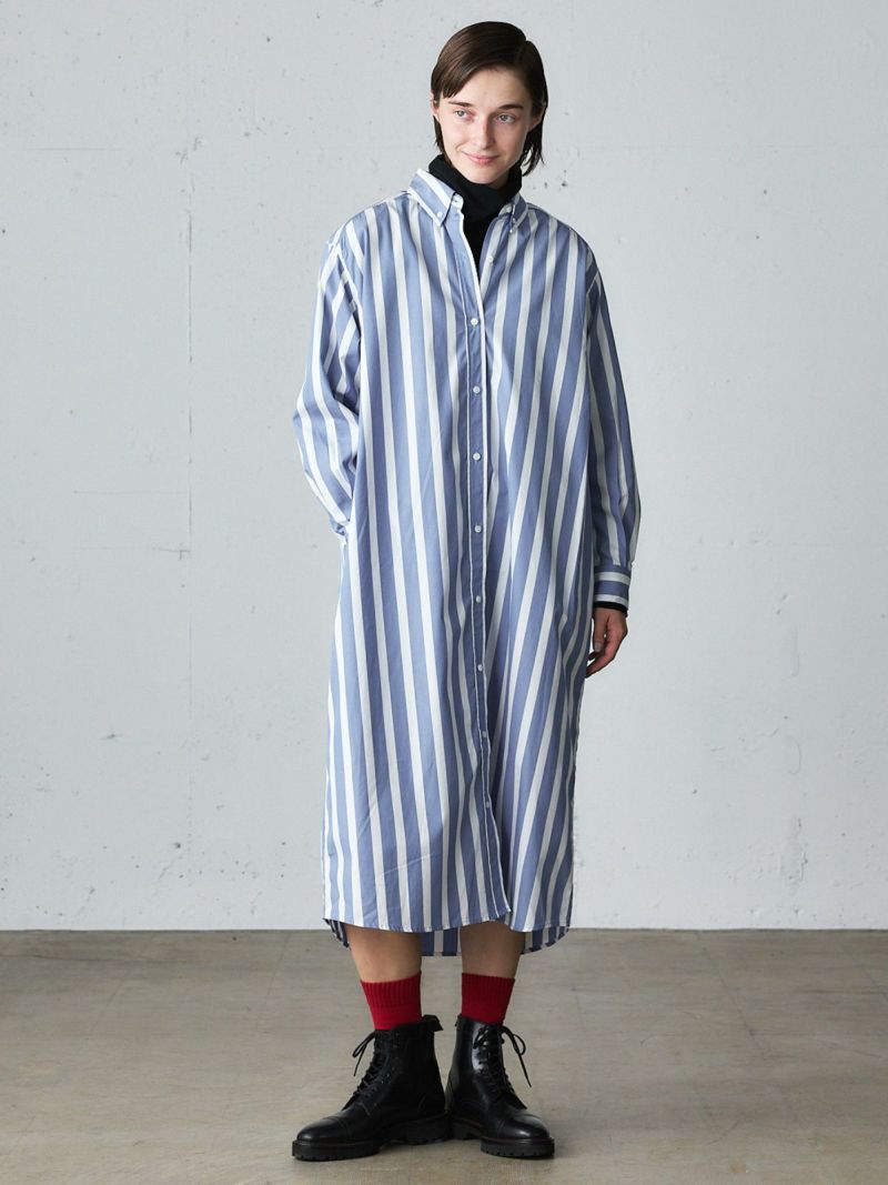 ストンと足元までストレートに落ちるボタンダウンワンピースです。無地はオーガニックコットンを使用。太目のストライプをセレクトした春らしい爽やかな着こなしを表現します。フロントボタンを開けて重ね着にもお勧め。清楚でありながら、カジュアルな着こなしも演出できる1枚。同じシリーズの1-739085(ボタンダウンシャツ)も展開。