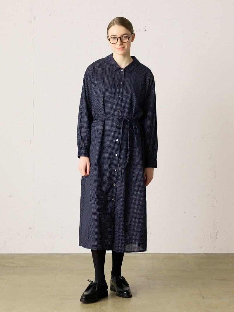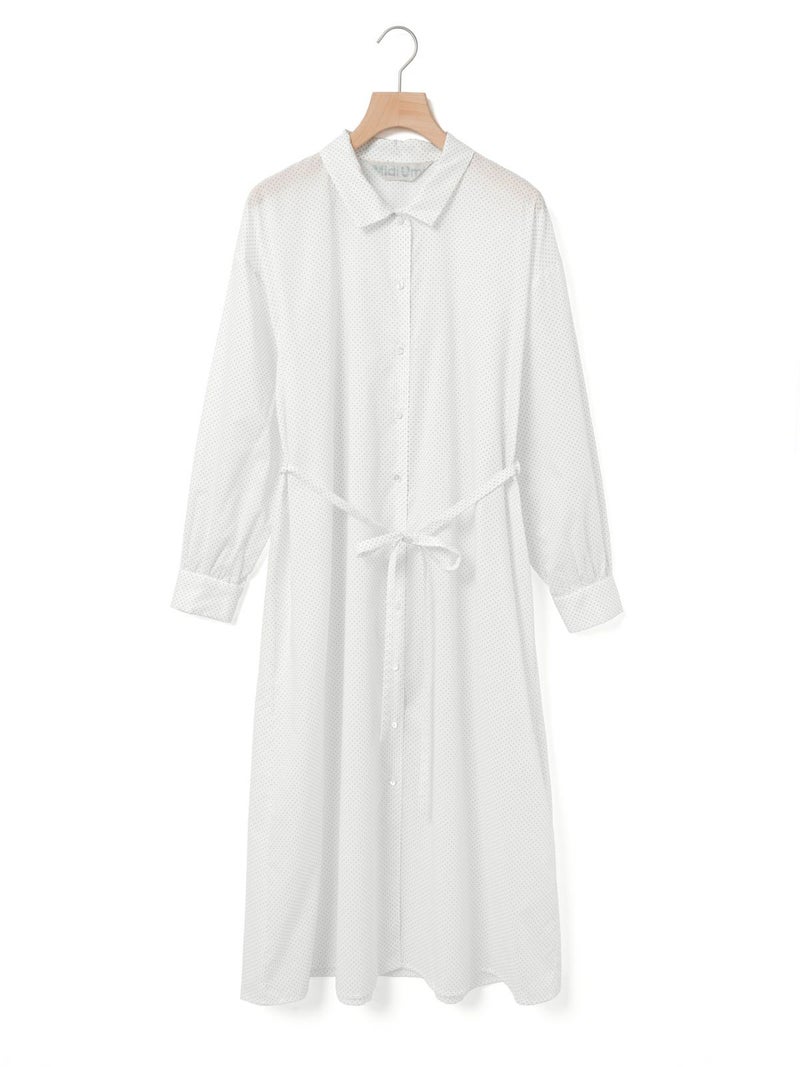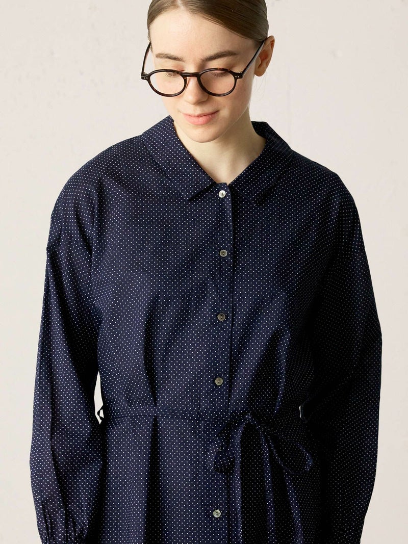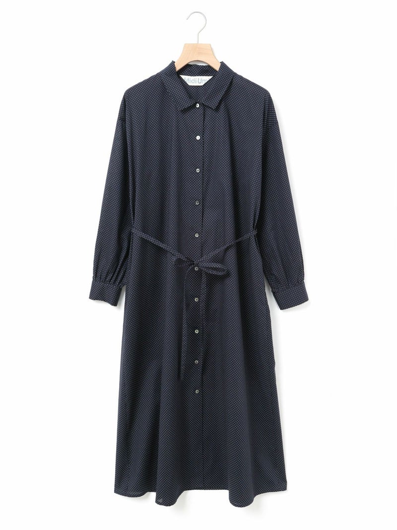 60ローンの生地を使用したベルト付ドットシャツワンピースです。無地見えする小ドットが特徴。深めのコートライクな襟元や羽織としても着用いただけるデザインを表現。共布でベルトアレンジができるので幅広くオシャレを楽しんでいただける1枚です。1-739787/ドットタックシャツも展開。