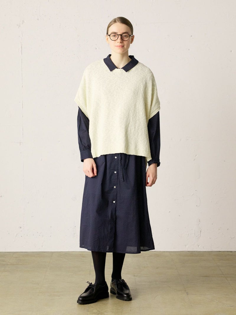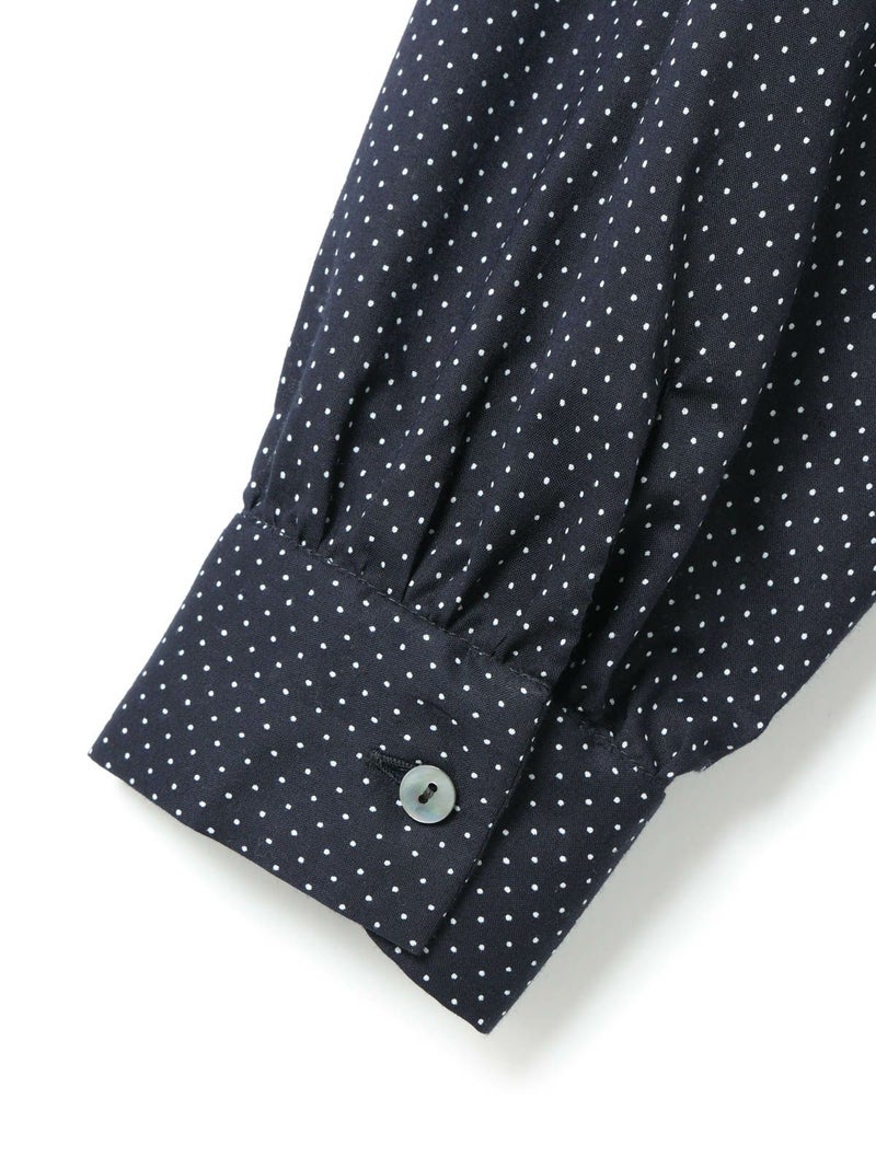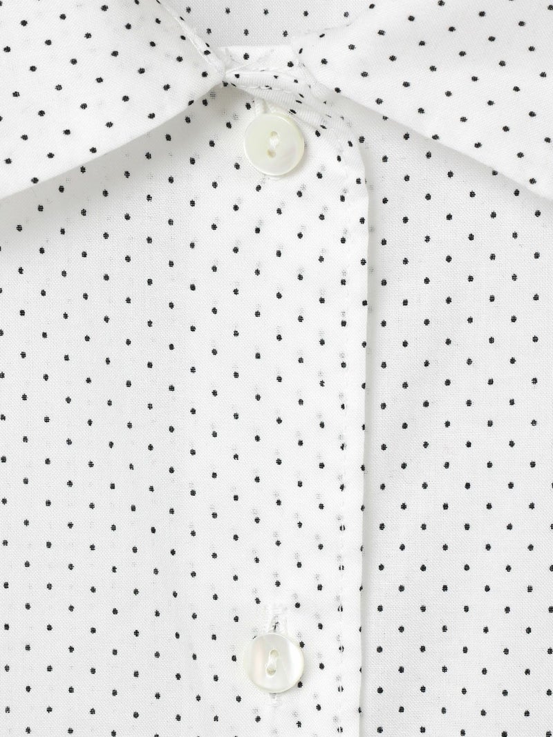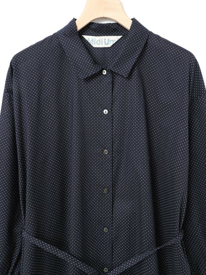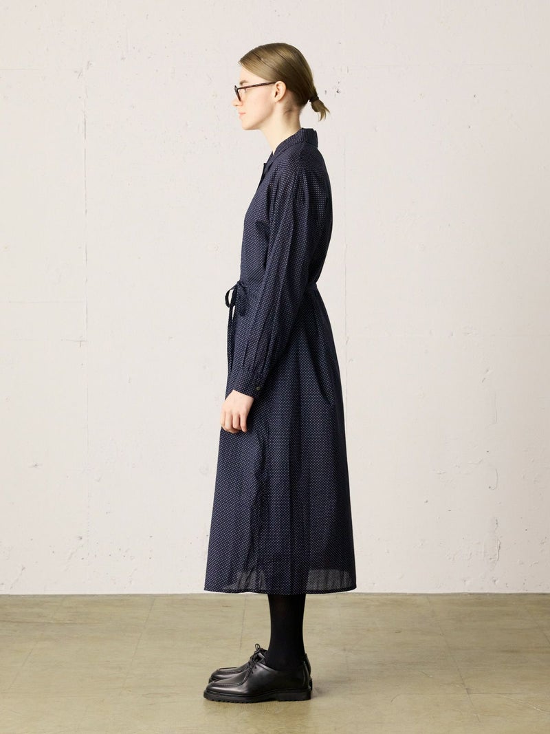 60ローンの生地を使用したベルト付ドットシャツワンピースです。無地見えする小ドットが特徴。深めのコートライクな襟元や羽織としても着用いただけるデザインを表現。共布でベルトアレンジができるので幅広くオシャレを楽しんでいただける1枚です。1-739787/ドットタックシャツも展開。