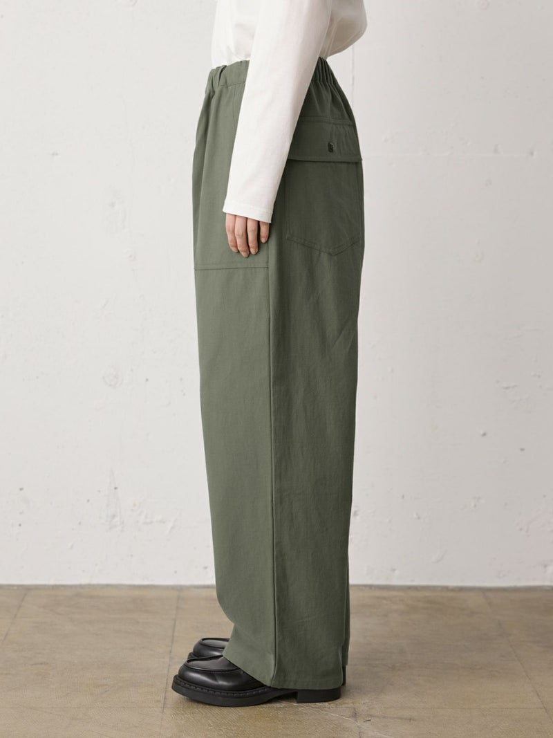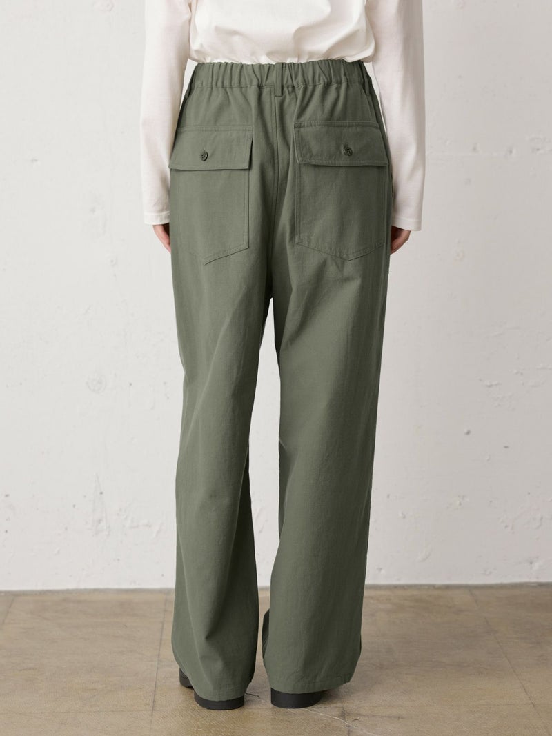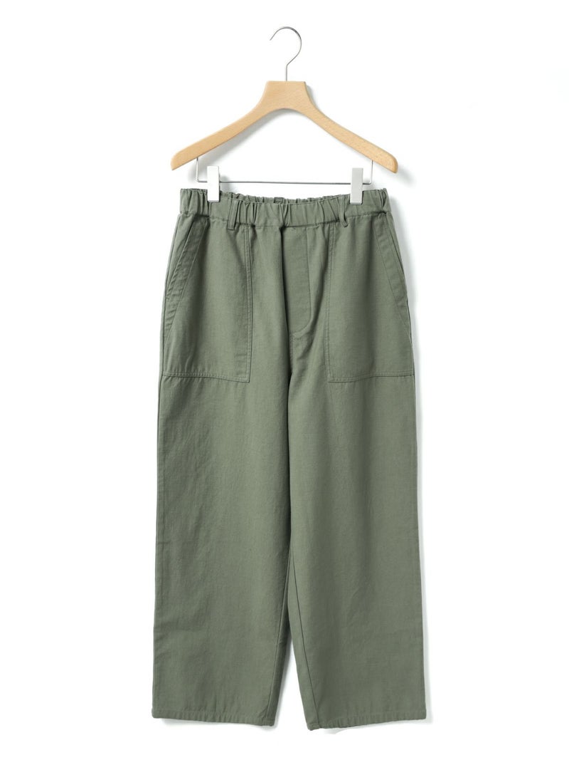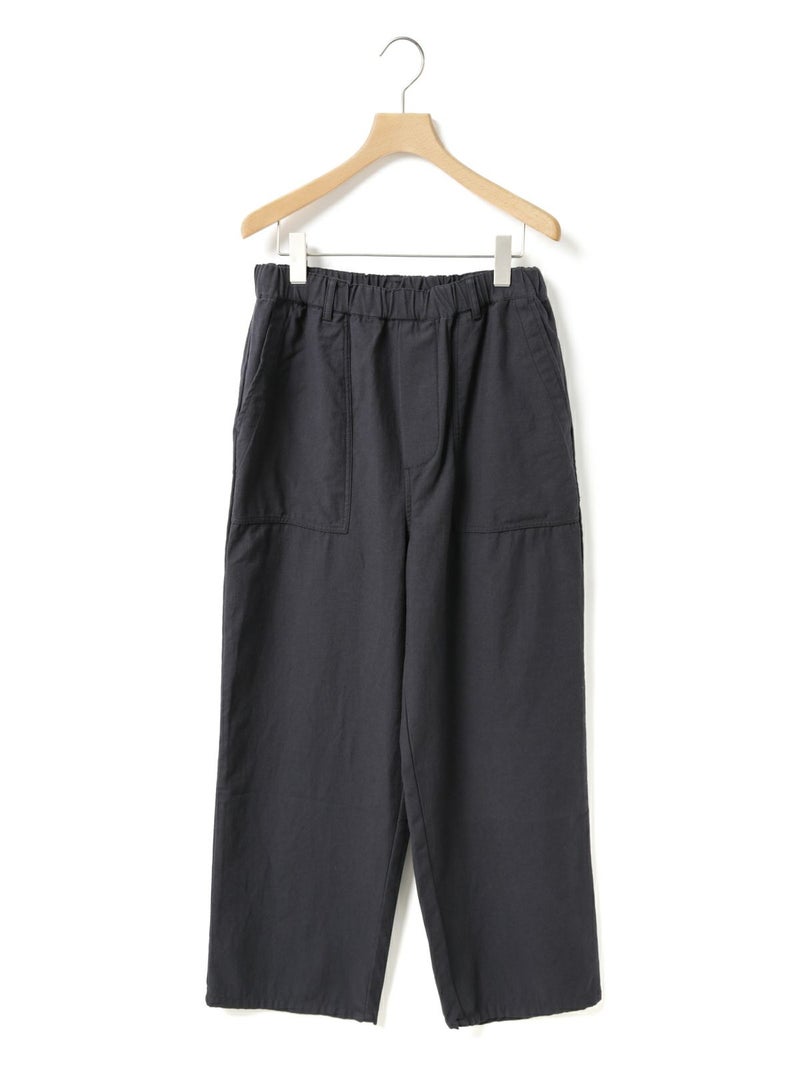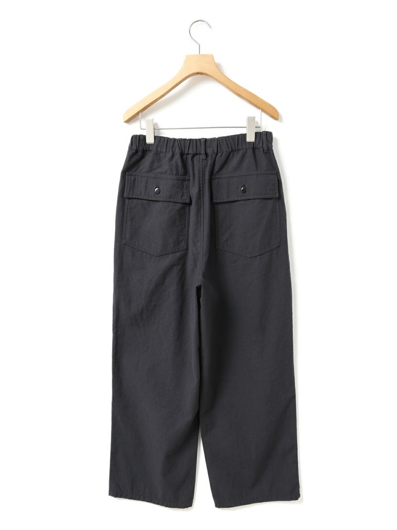 綿のバックサテン生地に近江産地の染色技法を用いて仕上げたバックサテンベイカーパンツです。ヴィンテージ感のある雰囲気が魅力的。ウエストはゴム仕様でイージーに穿けるベイカーパンツ。ベルトループ付きなのでベルト使いでシャツインをしたりと、カッコよくアレンジをきかせ大人のカジュアルを演出できる1枚。バックはフラップポケット付。ネイビーとカーキの2色展開です。同シリーズ1-760073/バックサテンツータックパンツも展開。