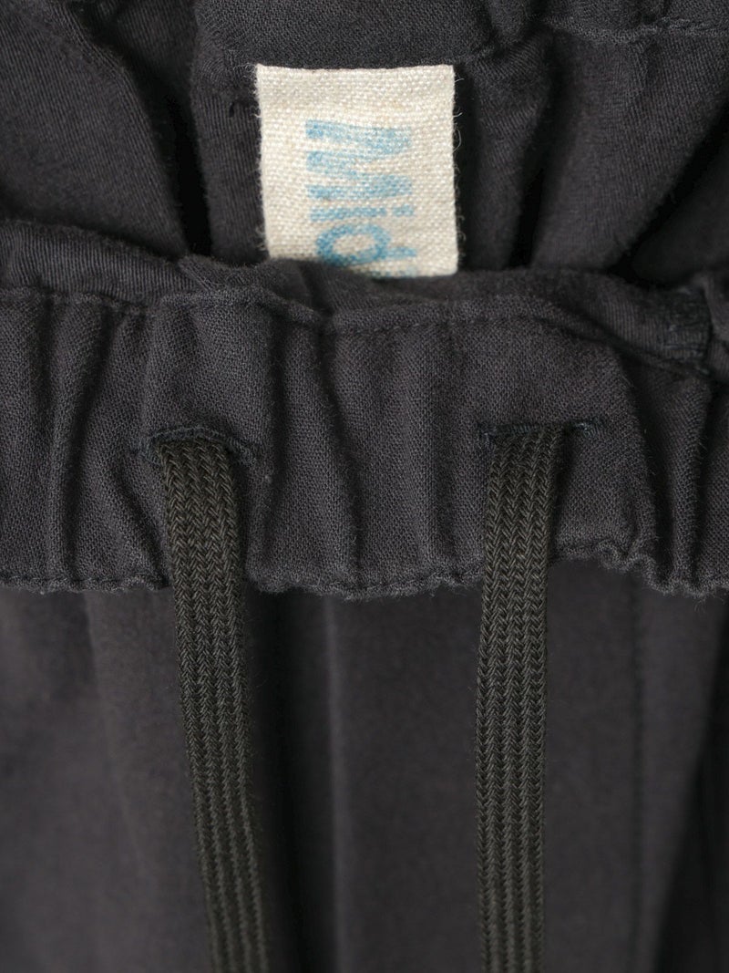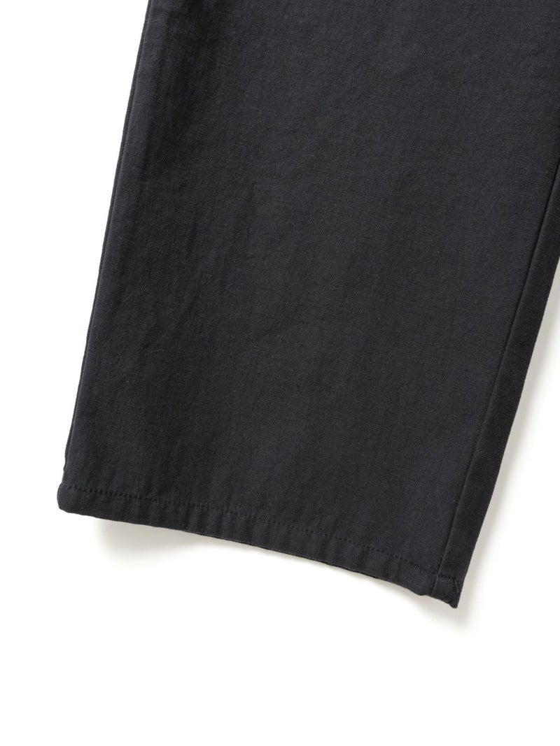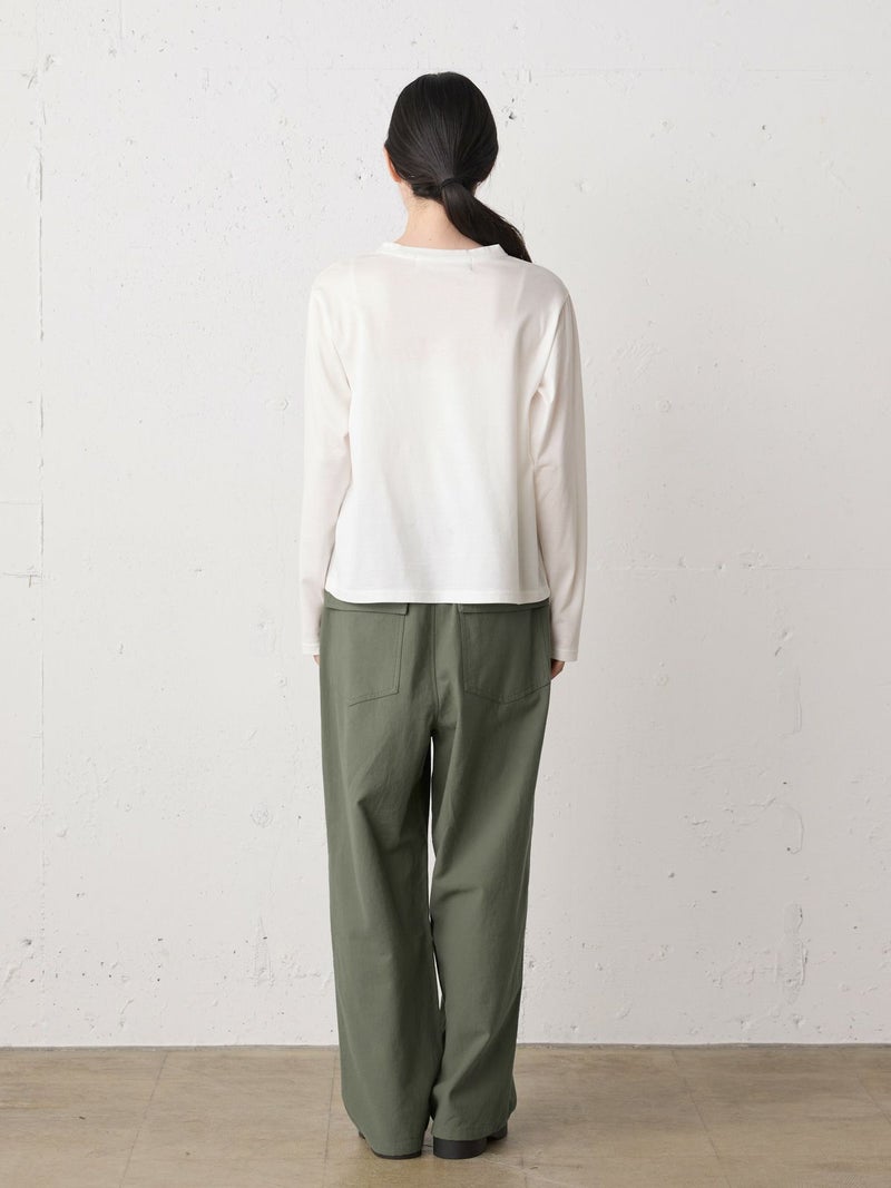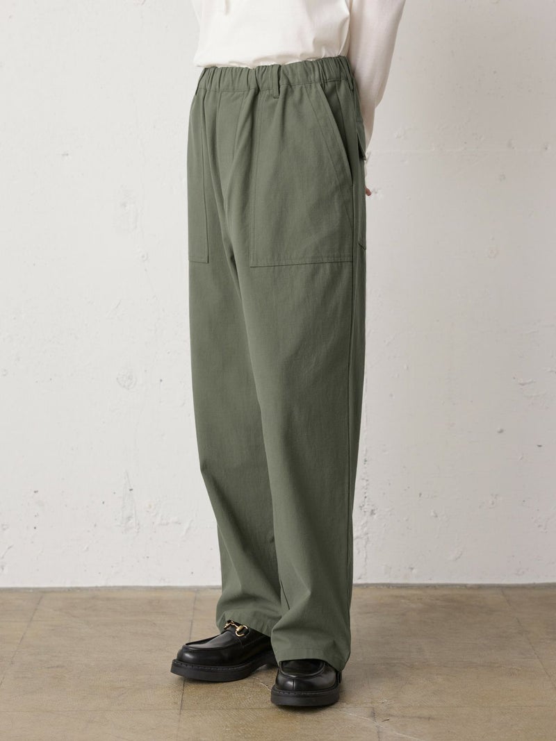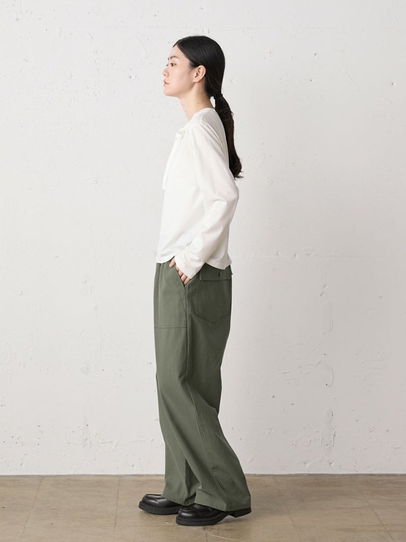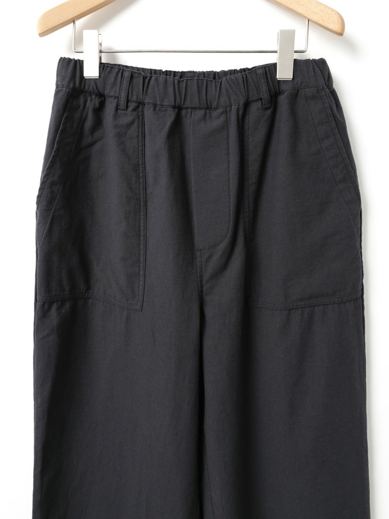 綿のバックサテン生地に近江産地の染色技法を用いて仕上げたバックサテンベイカーパンツです。ヴィンテージ感のある雰囲気が魅力的。ウエストはゴム仕様でイージーに穿けるベイカーパンツ。ベルトループ付きなのでベルト使いでシャツインをしたりと、カッコよくアレンジをきかせ大人のカジュアルを演出できる1枚。バックはフラップポケット付。ネイビーとカーキの2色展開です。同シリーズ1-760073/バックサテンツータックパンツも展開。