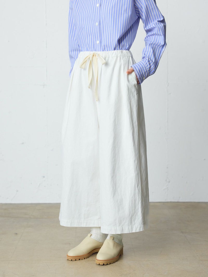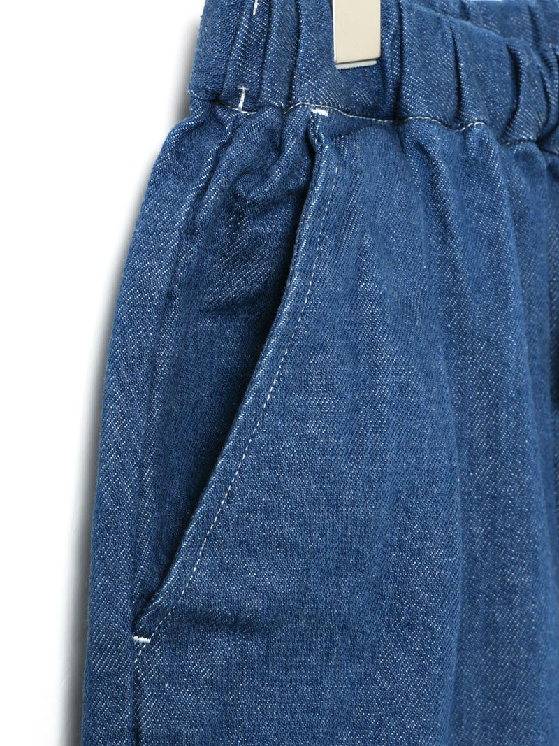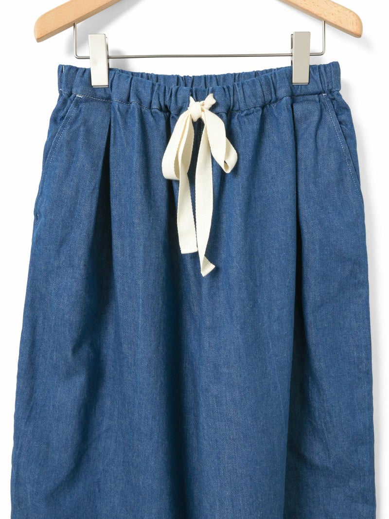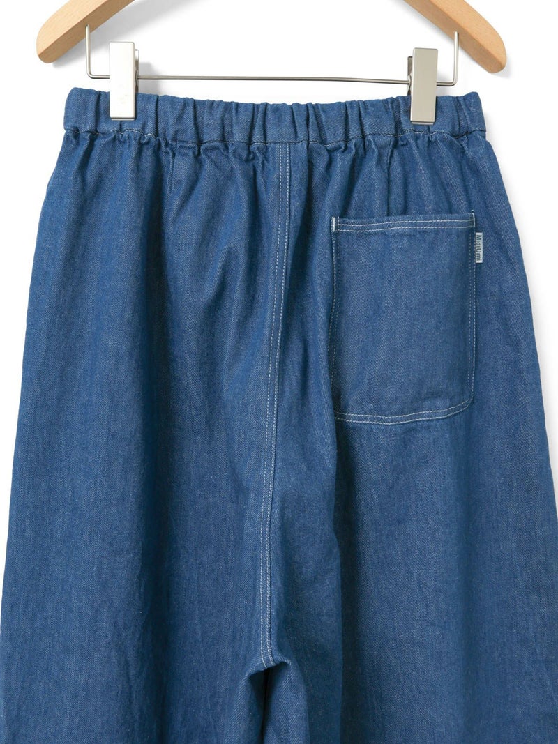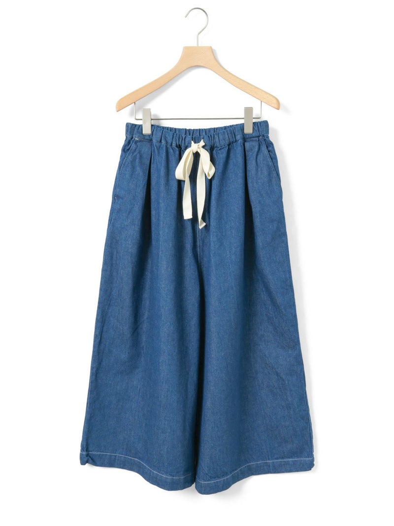 10ozのデニムを使用したワイドタックデニム。洗いをかけ柔らかい質感のデニムに仕上げました。9分丈のクロップドパンツのシルエットを表現。ウエストはリラックス感のあるゴム使用に加え調整紐付き。股上を深めにとっているので、ハイウエストでも腰穿きでも素敵です。シルエットの異なる同シリーズ1-760136/ワイドテーパードデニムも展開。