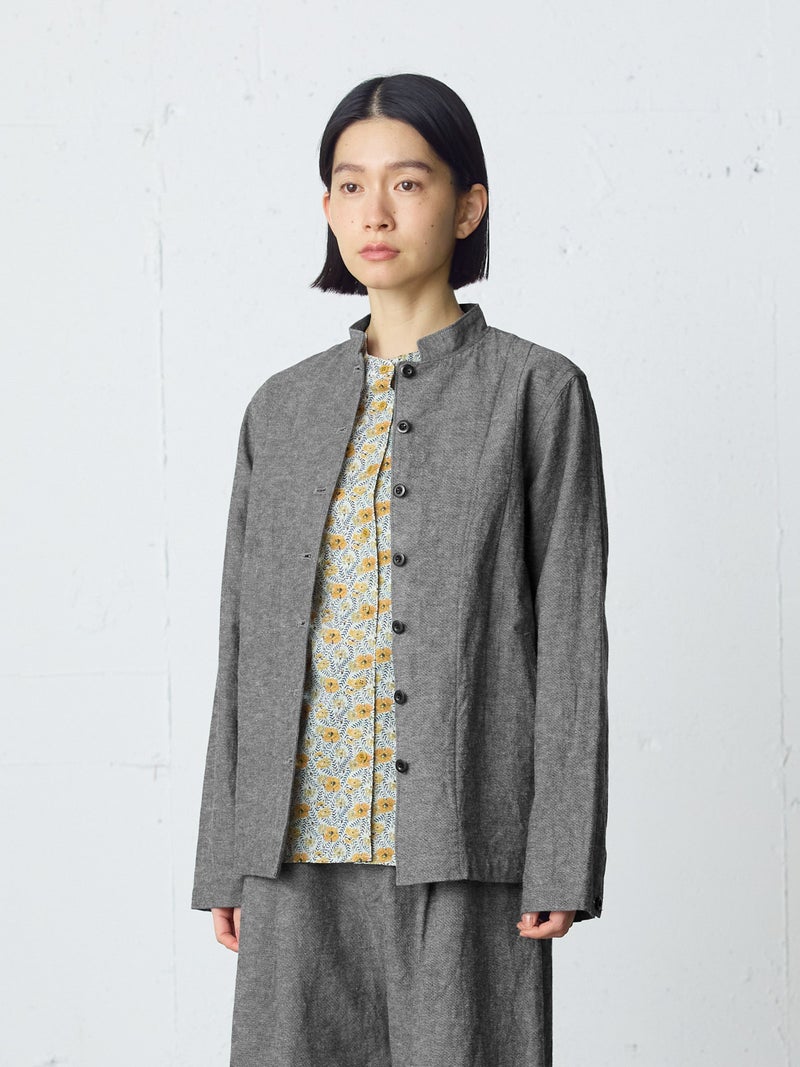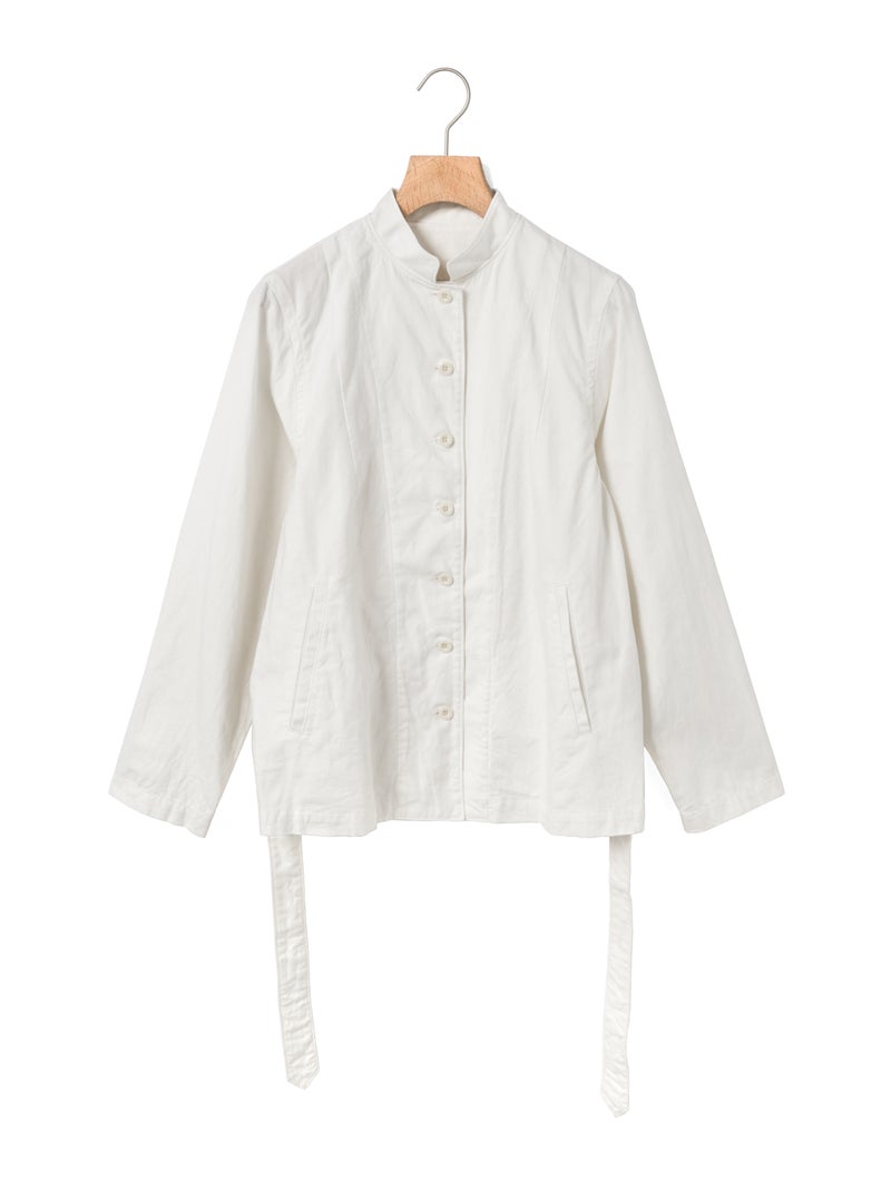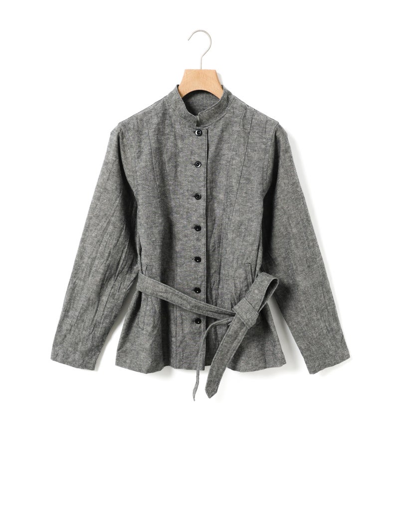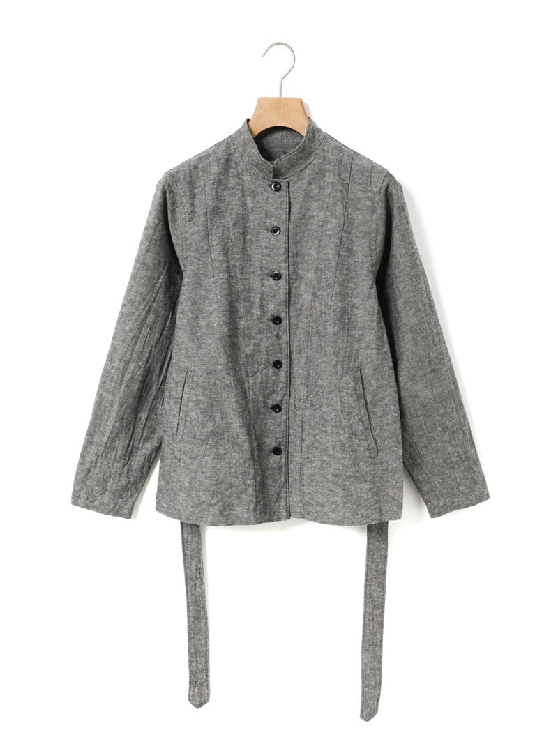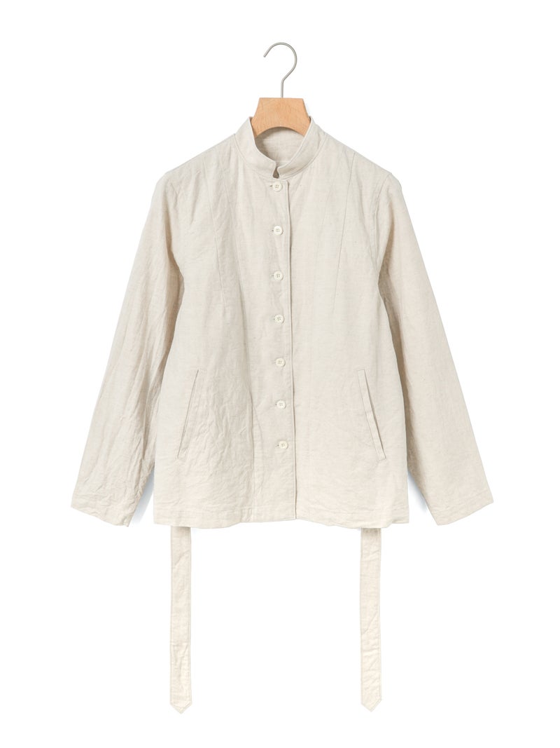コットンリネンの平織キャンバス地でデザインしたC/Lスタンドカラージャケットです。シリーズとして1-760147/C/Lタックショートパンツと1-730131/C/Lベストも展開。ヴィンテージ生地のように柔らかく、ナチュラルな風合いが特徴。女性物のワークウェアから着想を得たジャケットで、肩ダーツやウエストマークできるような仕様など、女性らしい雰囲気と素材の無骨さがマッチした大人女性に提案したいヴィンテージ風ジャケットに仕上げました。シャープさのあるスタンドネックからのフロントボタンやすっきりとしたシルエット、ウエストマークが可能なベルトが付いた雰囲気のあるデザインが魅力的です。