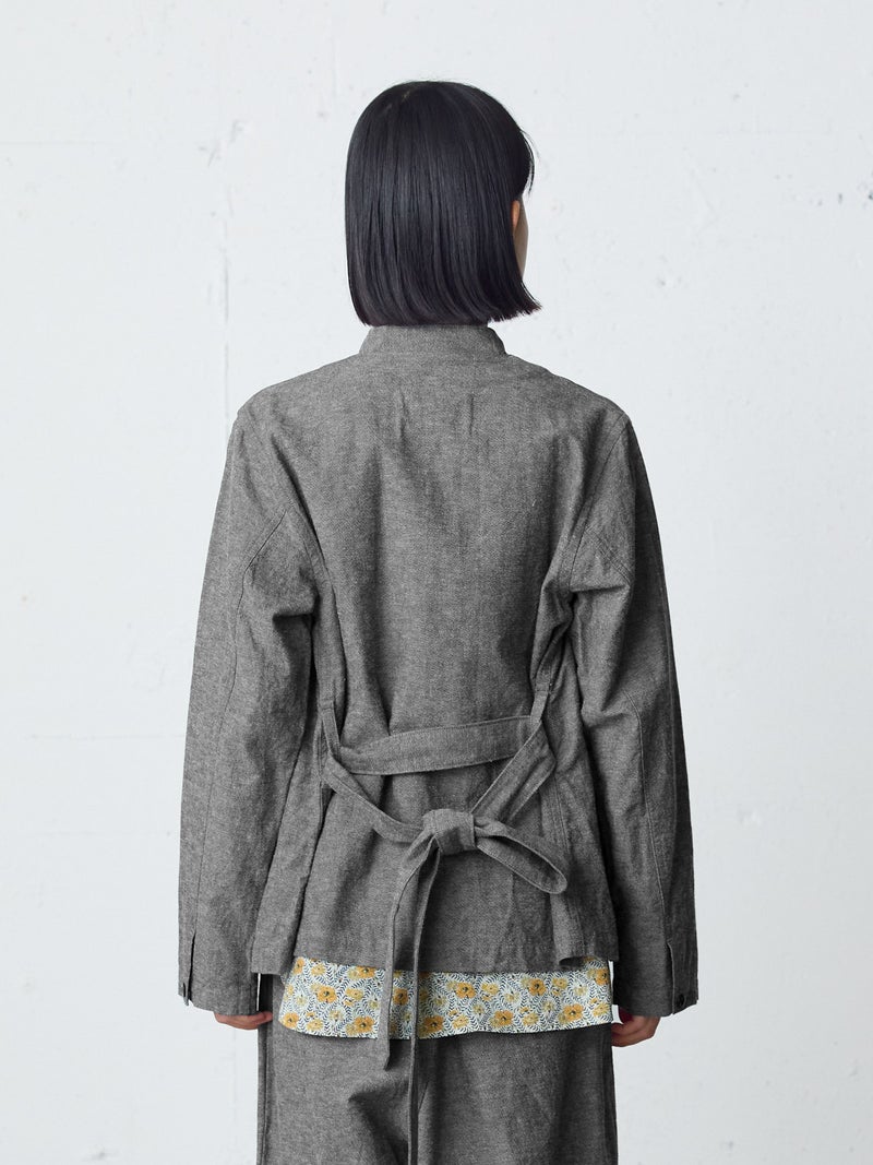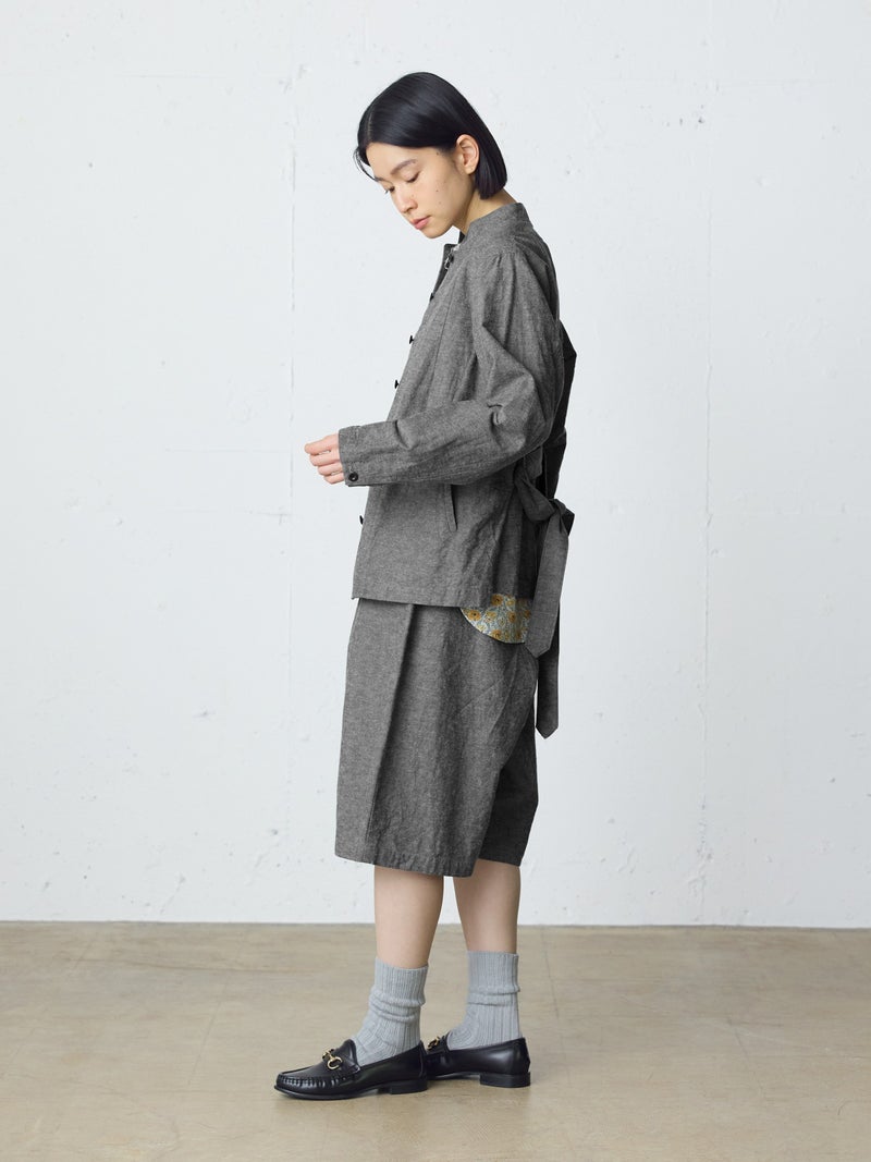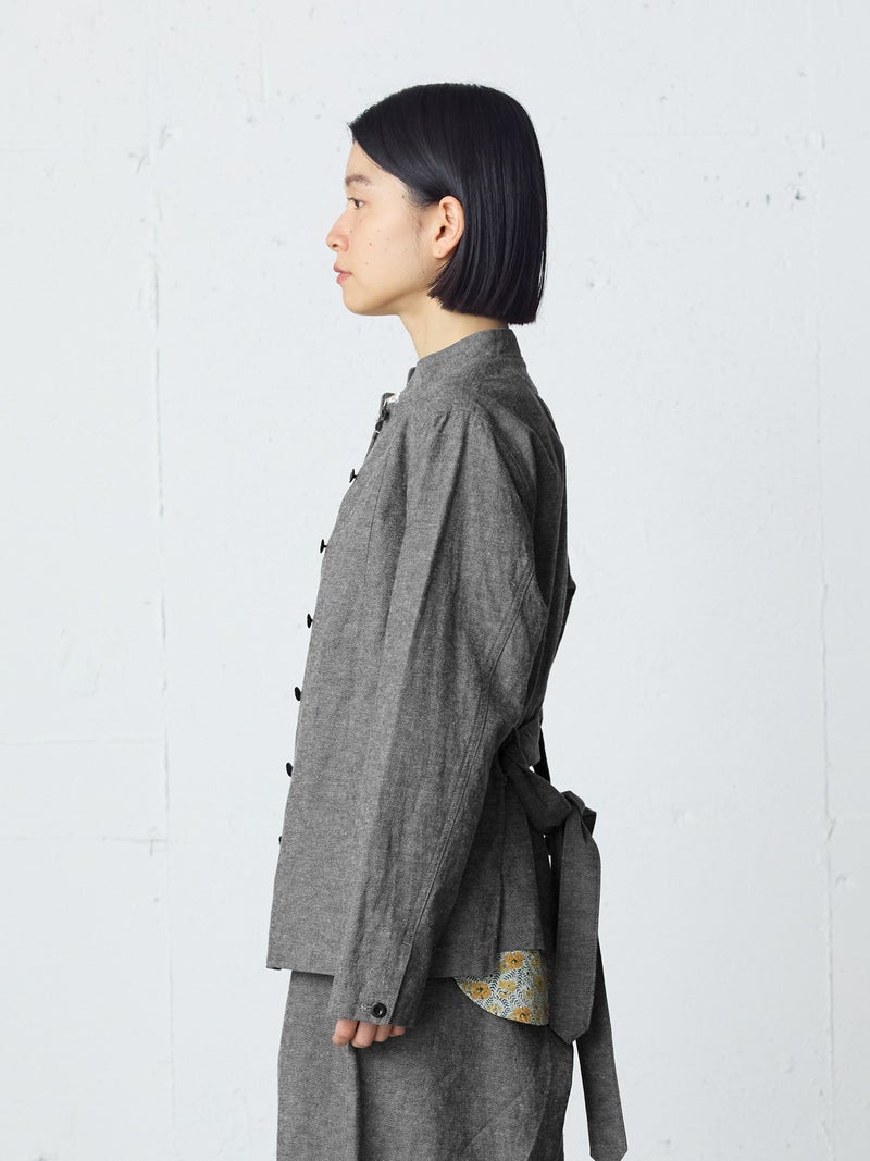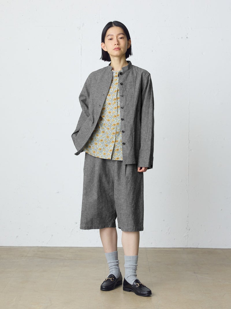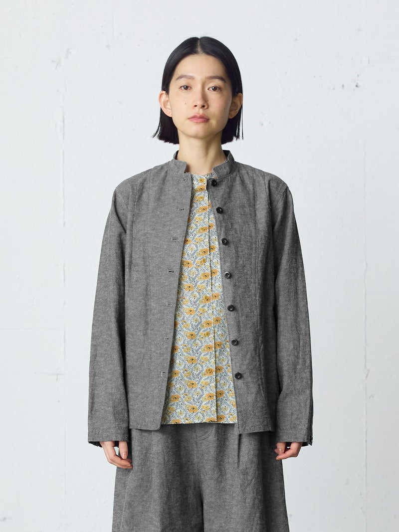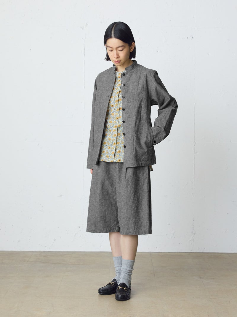 コットンリネンの平織キャンバス地でデザインしたC/Lスタンドカラージャケットです。シリーズとして1-760147/C/Lタックショートパンツと1-730131/C/Lベストも展開。ヴィンテージ生地のように柔らかく、ナチュラルな風合いが特徴。女性物のワークウェアから着想を得たジャケットで、肩ダーツやウエストマークできるような仕様など、女性らしい雰囲気と素材の無骨さがマッチした大人女性に提案したいヴィンテージ風ジャケットに仕上げました。シャープさのあるスタンドネックからのフロントボタンやすっきりとしたシルエット、ウエストマークが可能なベルトが付いた雰囲気のあるデザインが魅力的です。