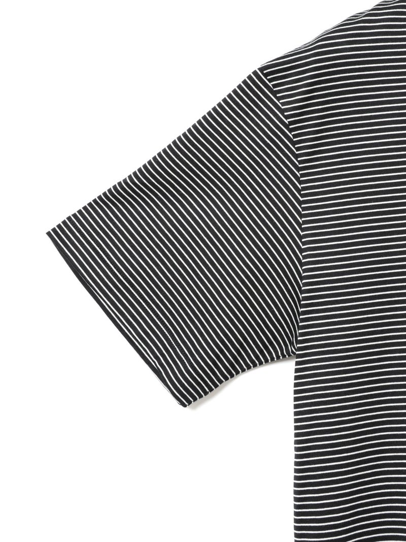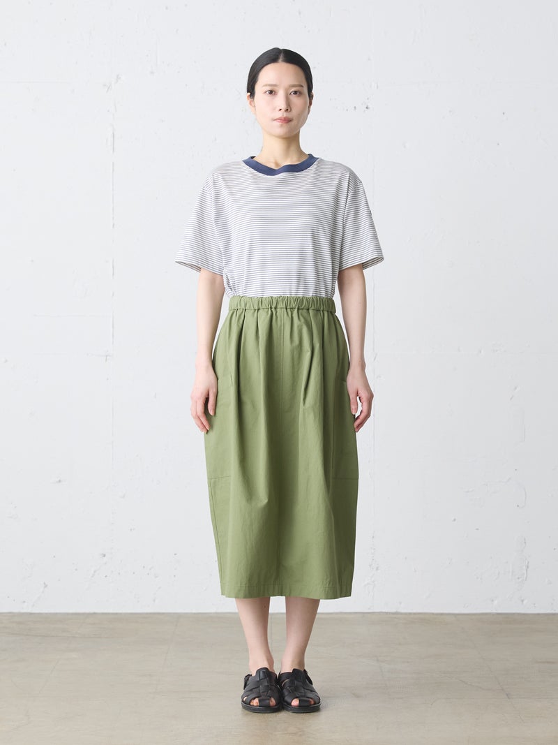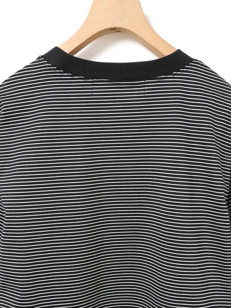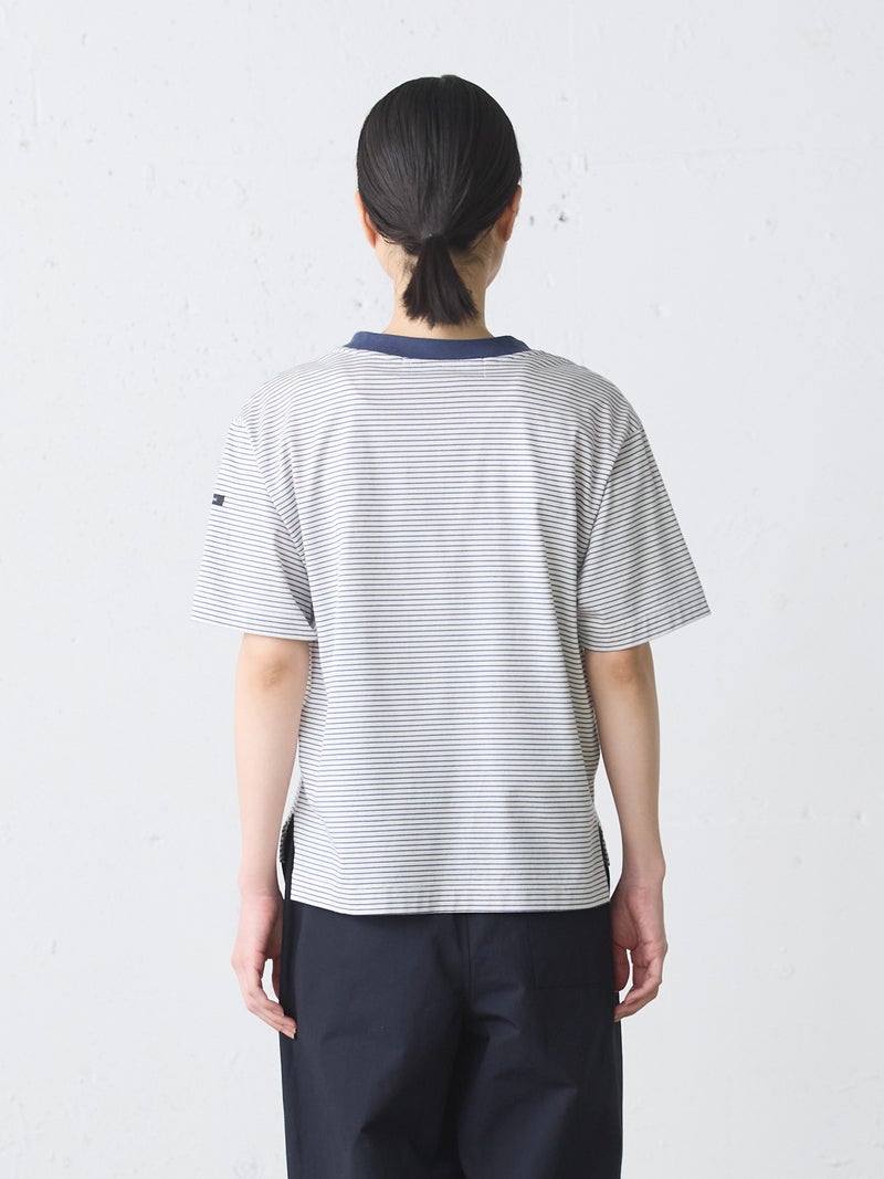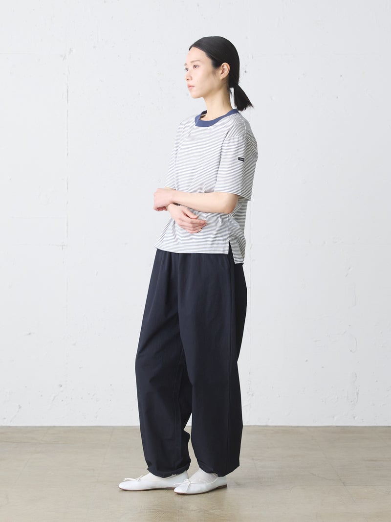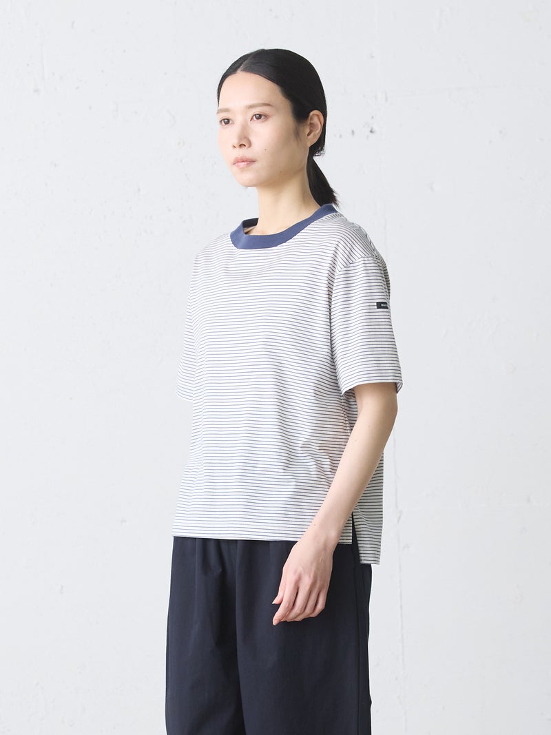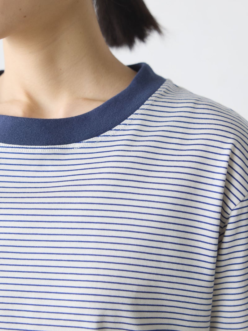 リサイクルコットンとオーガニックコットンをミックスしたサスティナブル素材で仕上げたベーシックボーダープルオーバーです。2025年に展開した2-719893や1-710161と同型のデザインで、天竺素材なのでキレイ目な雰囲気のTシャツです。少しコンパクトながら、やや肩がドロップした程よいサイジングのベーシックなボーダーTシャツです。左袖にブランドタグが付いています。裾は若干の前後差が付き。シンプルなデザインで、さまざまなコーディネートに取り入れやすい1枚です。