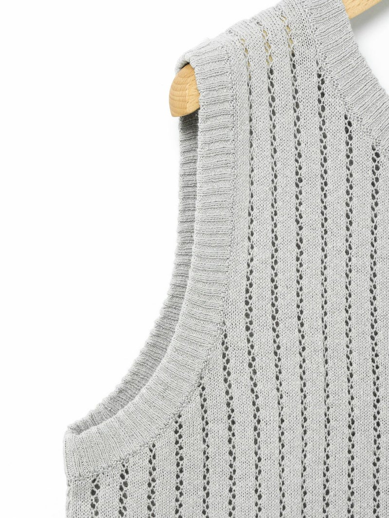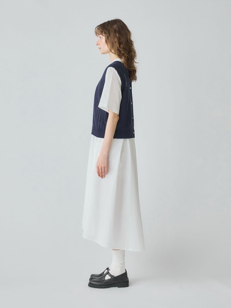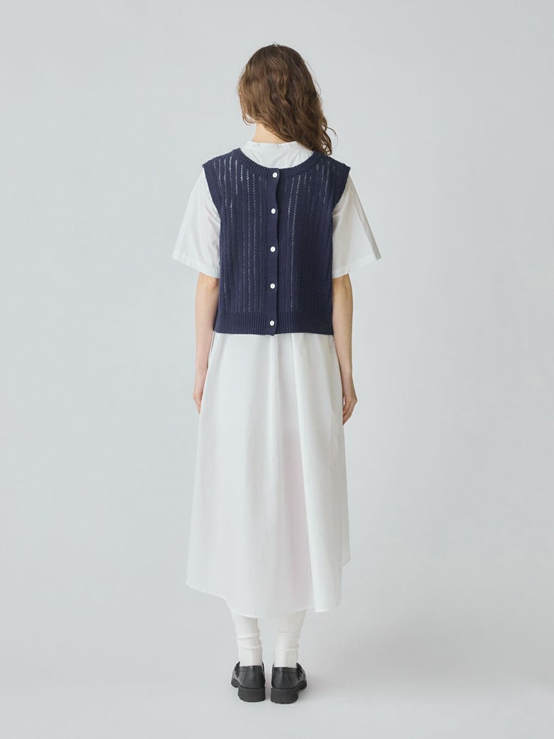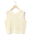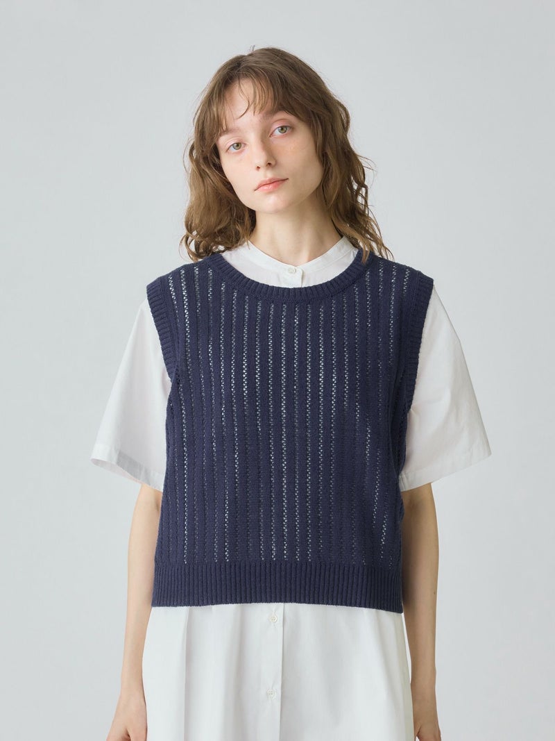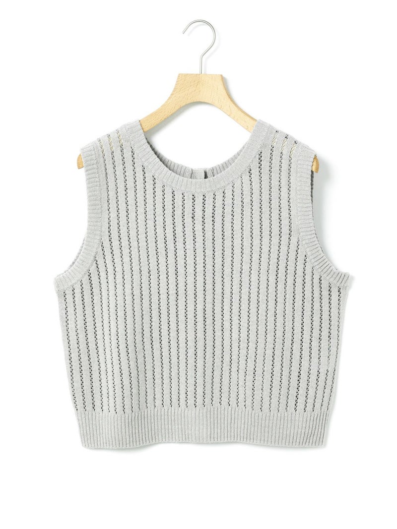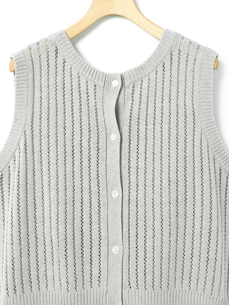レースタッチの編み柄ニット。前後どちらでも着用いただける2WAYベストになっています。麻綿素材のため透け感もあり清涼感を印象付けてくれます。色柄が透けてくれるので重ね着を楽しんでいただけます。コンパクトでスッキリとしており清楚に着こなしていただける1枚です。同シリーズ2-729852/模様編みニットポロも展開。