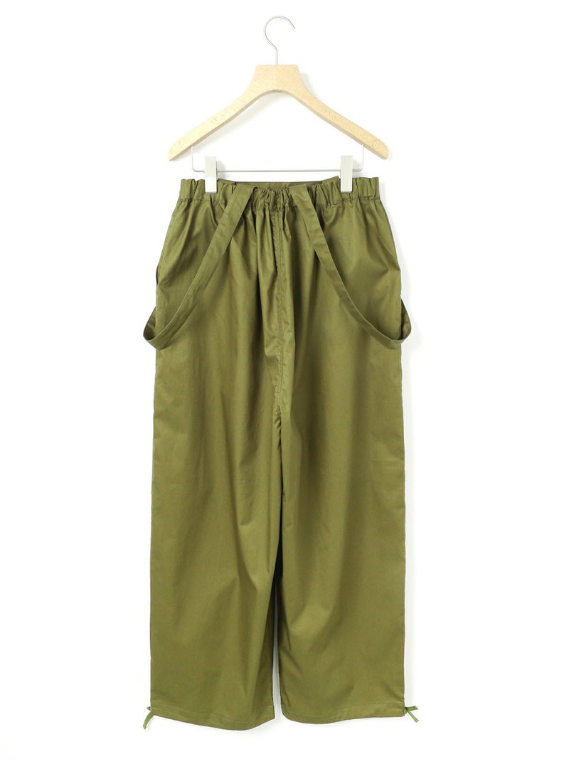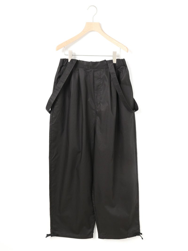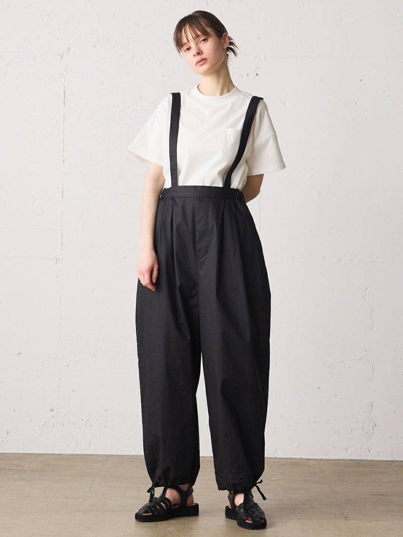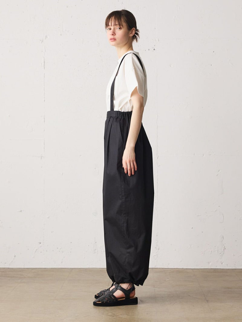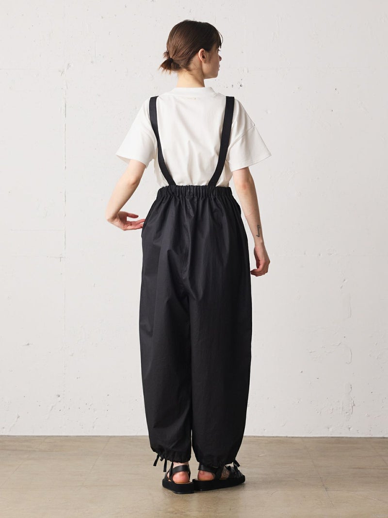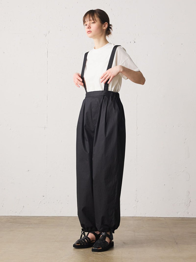 高密度に織られた微光沢感のあるツイル素材を使用したサスペンダー付きバルーンパンツです。丸みのあるシルエットのボリュームパンツ。洗いざらしで着用してもOK。サスペンダー付きで2wayの着こなしが可能。ウエストの内側に紐を付けたデザインです。サスペンダーを付けるとパンツ丈ジャストで穿いていただけます。サスペンダー無しで穿いていただくとよりボリューム感がでます。裾のドロストでシルエットをアレンジしていただけるので着こなしに変化も。サスペンダーは調整可能。カジュアルに着こなせる1枚です。