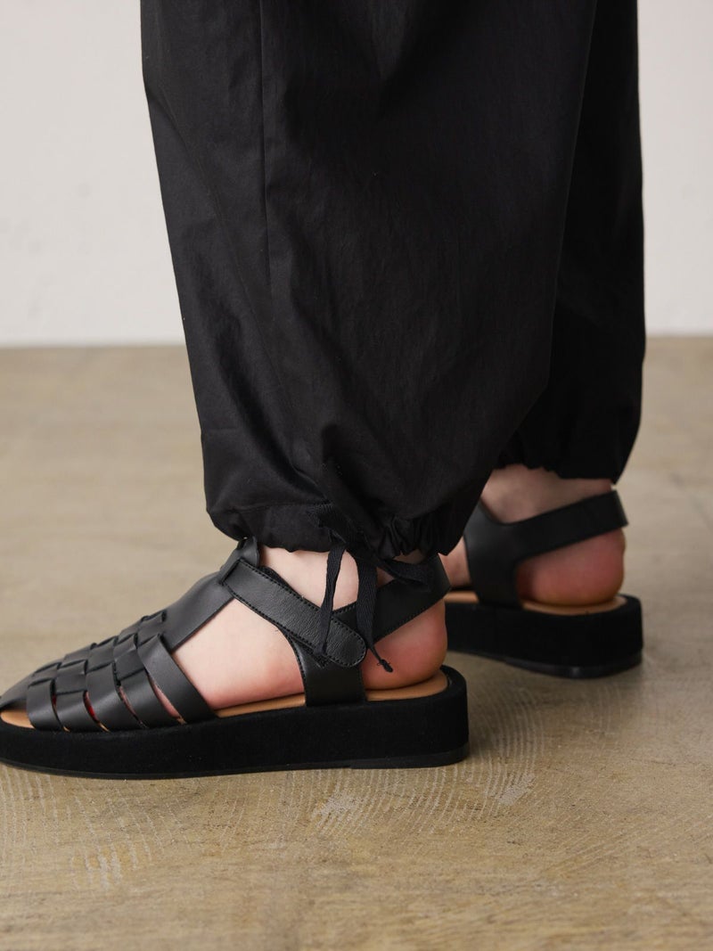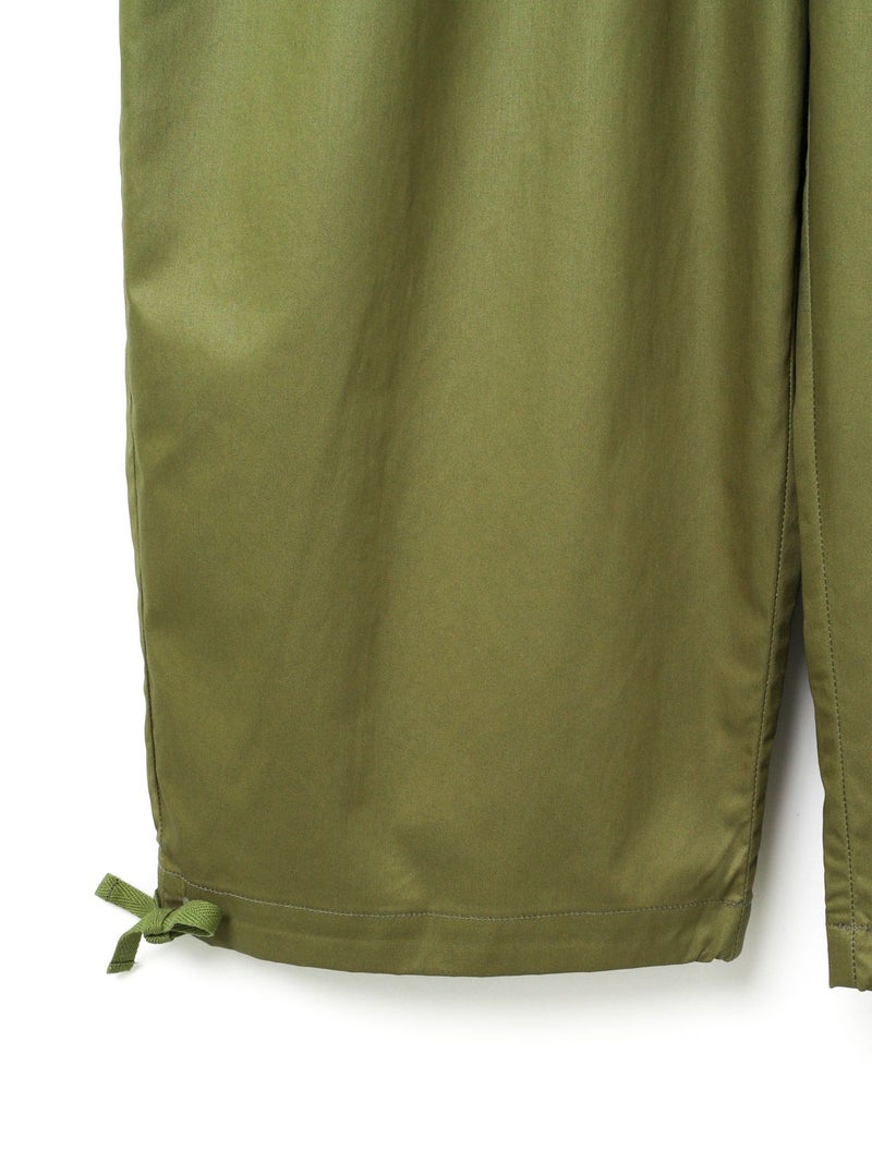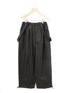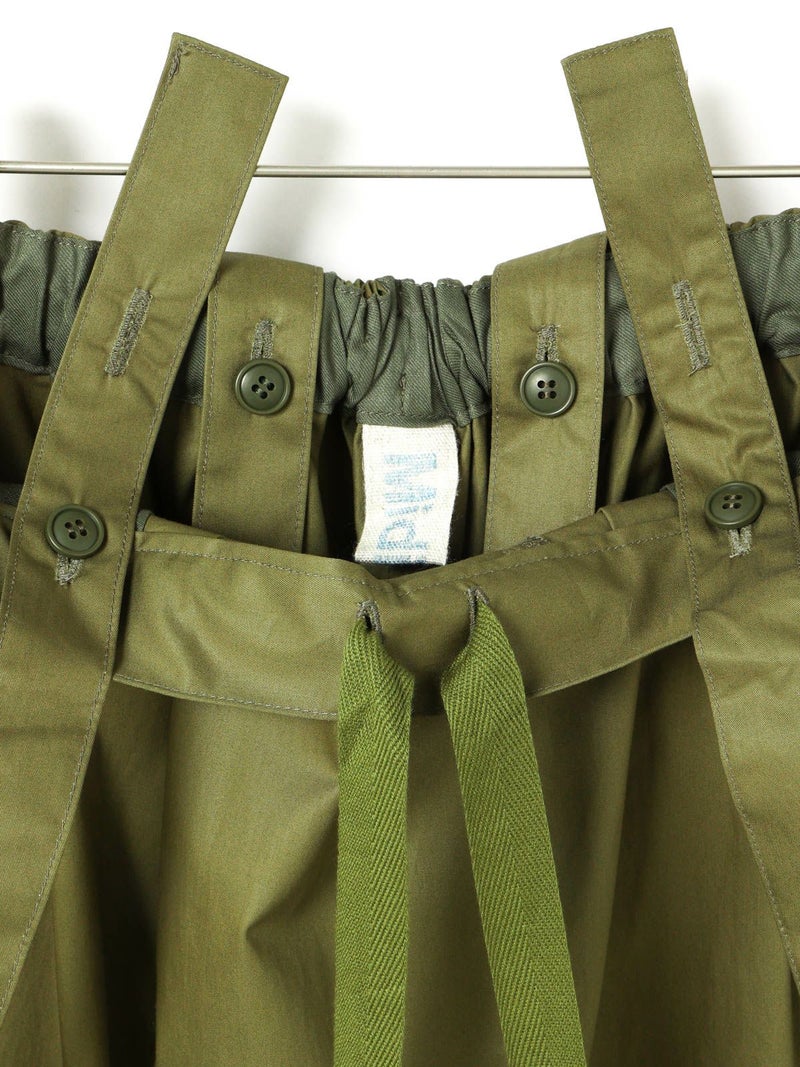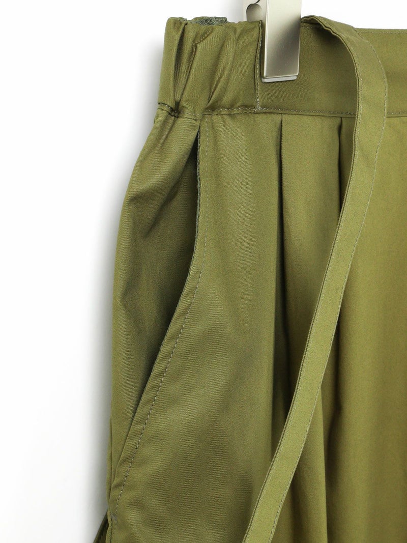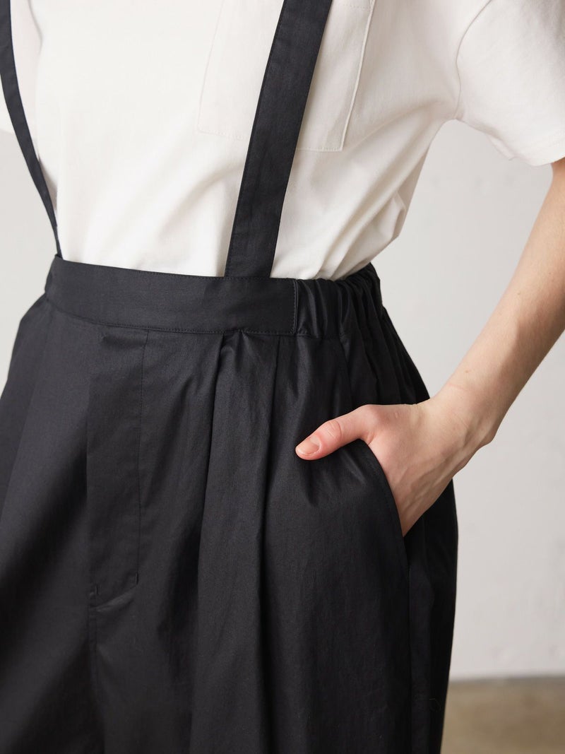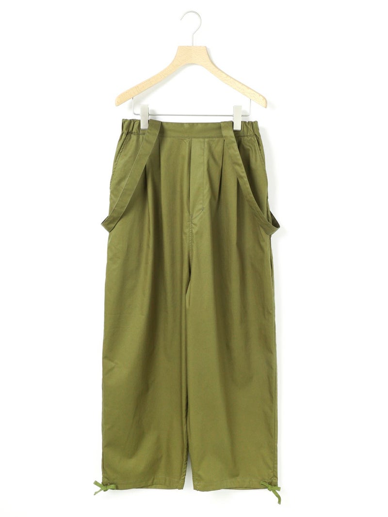 高密度に織られた微光沢感のあるツイル素材を使用したサスペンダー付きバルーンパンツです。丸みのあるシルエットのボリュームパンツ。洗いざらしで着用してもOK。サスペンダー付きで2wayの着こなしが可能。ウエストの内側に紐を付けたデザインです。サスペンダーを付けるとパンツ丈ジャストで穿いていただけます。サスペンダー無しで穿いていただくとよりボリューム感がでます。裾のドロストでシルエットをアレンジしていただけるので着こなしに変化も。サスペンダーは調整可能。カジュアルに着こなせる1枚です。