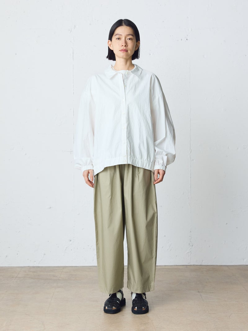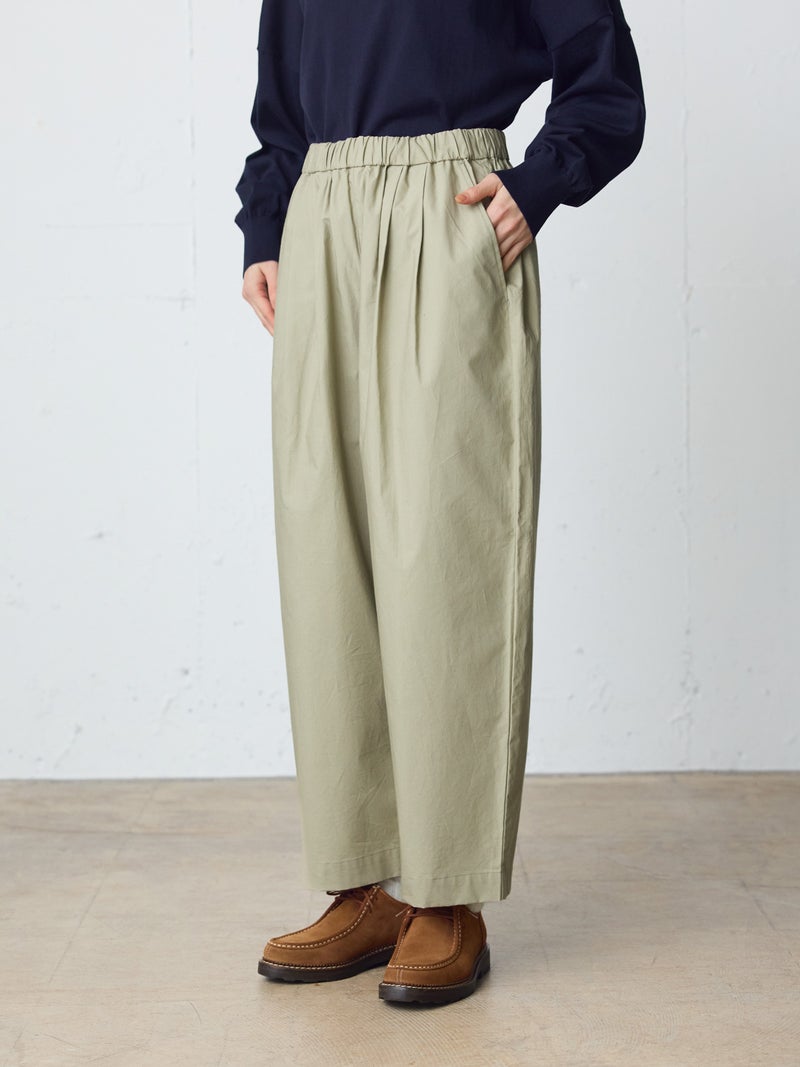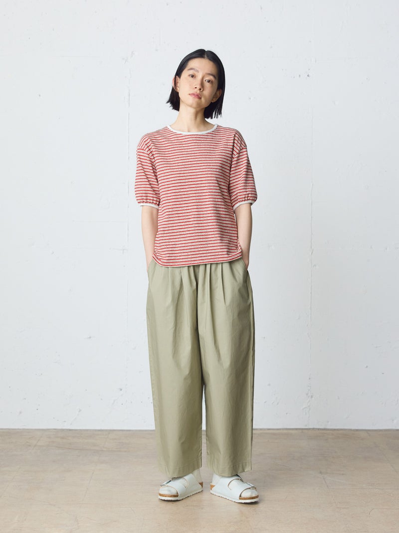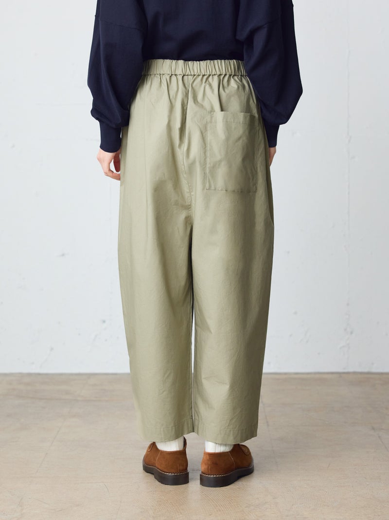 タイプライター素材を使用したワイドイージーパンツが今季新色のネイビーを追加して再入荷しました。生地は薄手で軽く、コシのある質感と繊維が密に詰まった独特の風合いが特徴。ウエストは幅広のゴムに加え調整可能な中紐付きです。サラッとした生地感で肌触りも快適でお洗濯もしやすく、ゆとりのあるワイドシルエットなので通気性もあり夏場にお勧め。少し短めの丈を表現しており小柄な方にもお勧めです。シンプルにベーシックな着こなしを演出できるMidiUmiの定番型ボトムアイテムです。