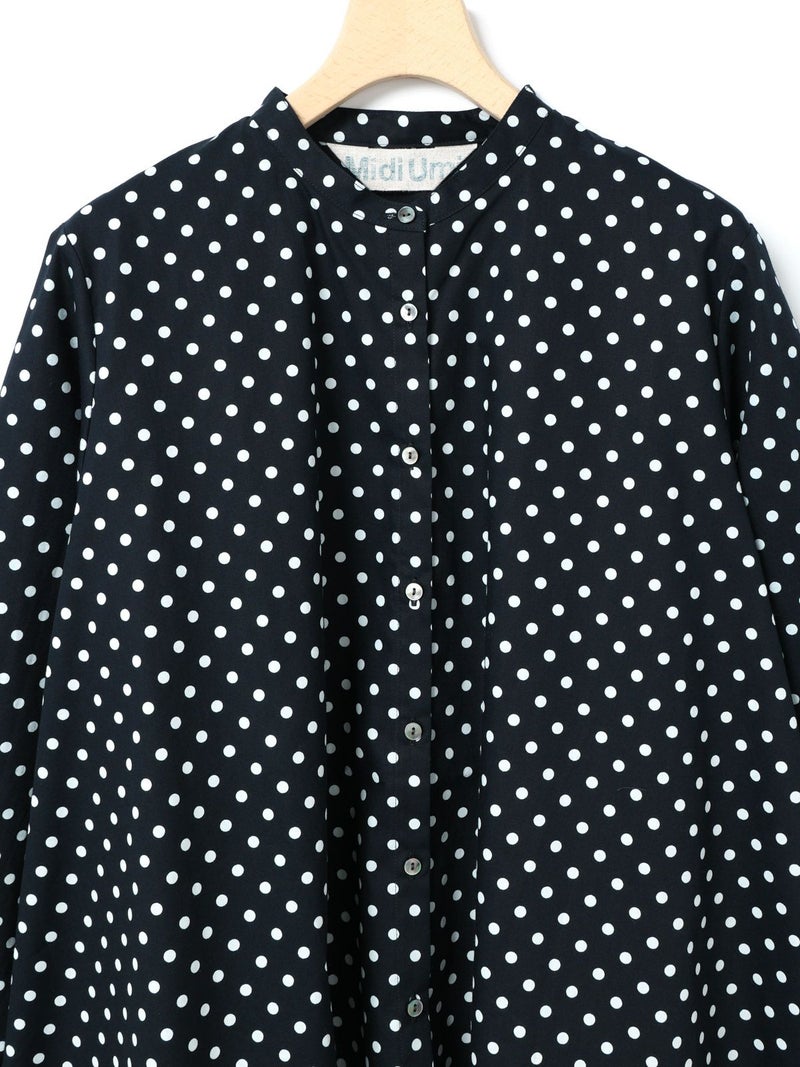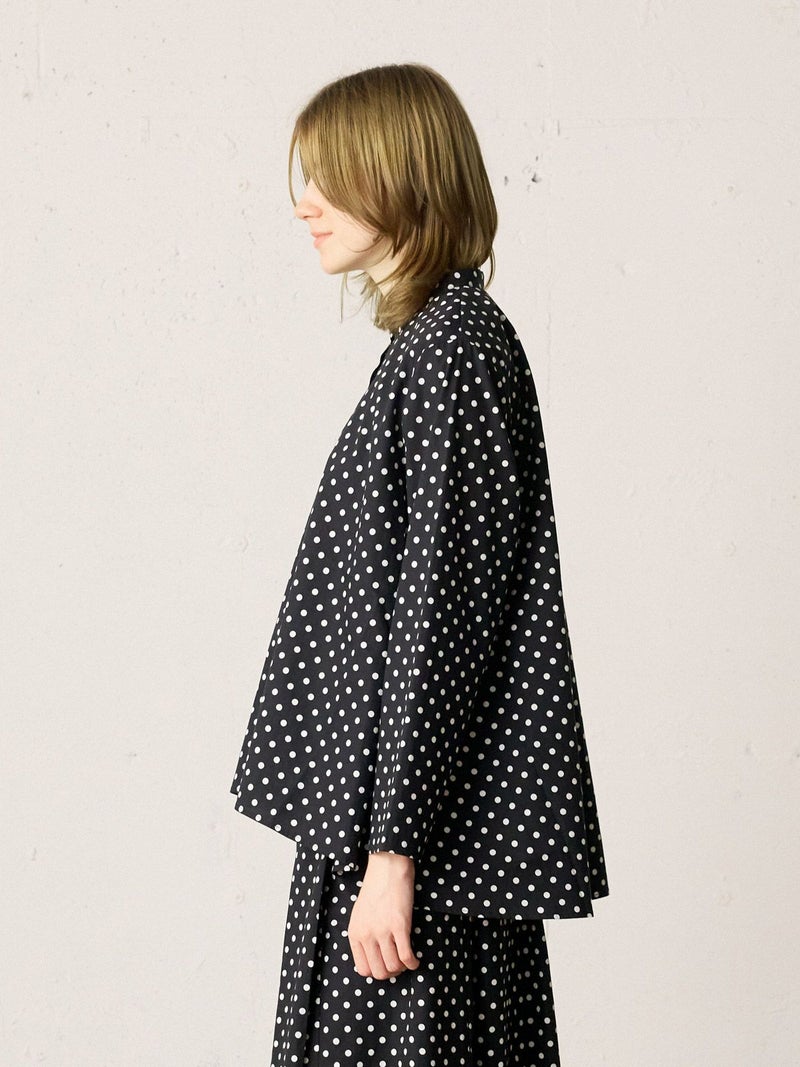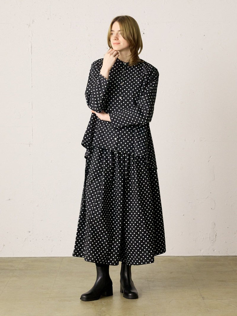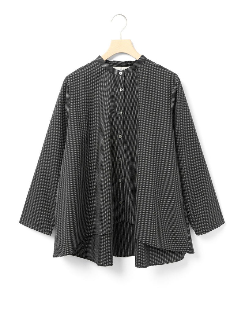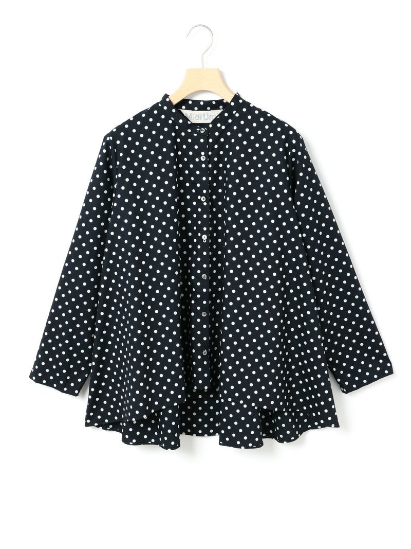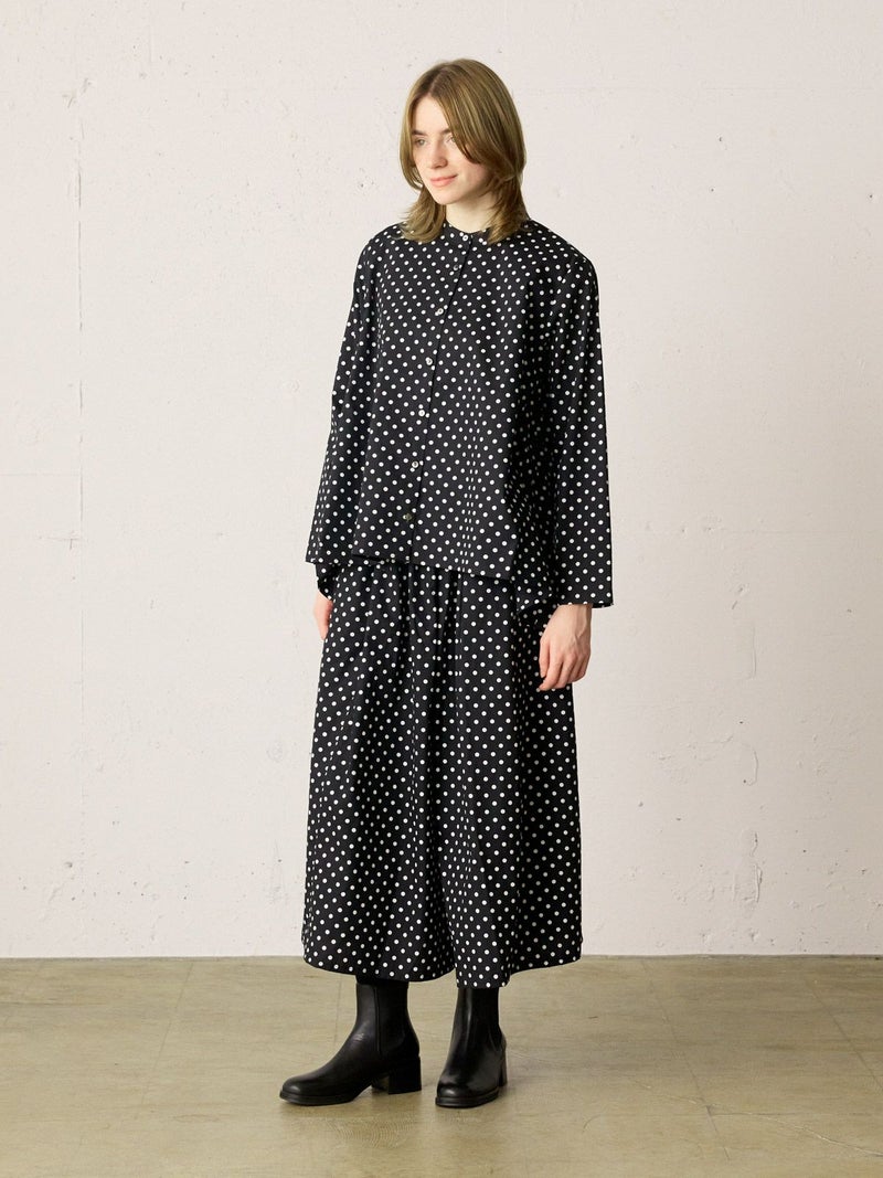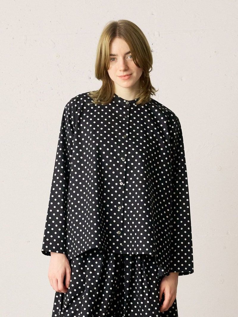 ドット柄のブロード素材を使用したドットシャツです。3-769627/ドットボリュームパンツとシリーズ。白ドットの映えるカラー展開で異なるドットサイズでデザインしました。Aラインシルエットのワイドなサイズ感と緩やかに前後差をつけた滑らかな裾ラインを表現。襟元はバンドカラーですっきりしたデザインです。ドットアイテムはシーズン通しても大変人気なアイテムとなっております。この秋おすすめの1枚です。