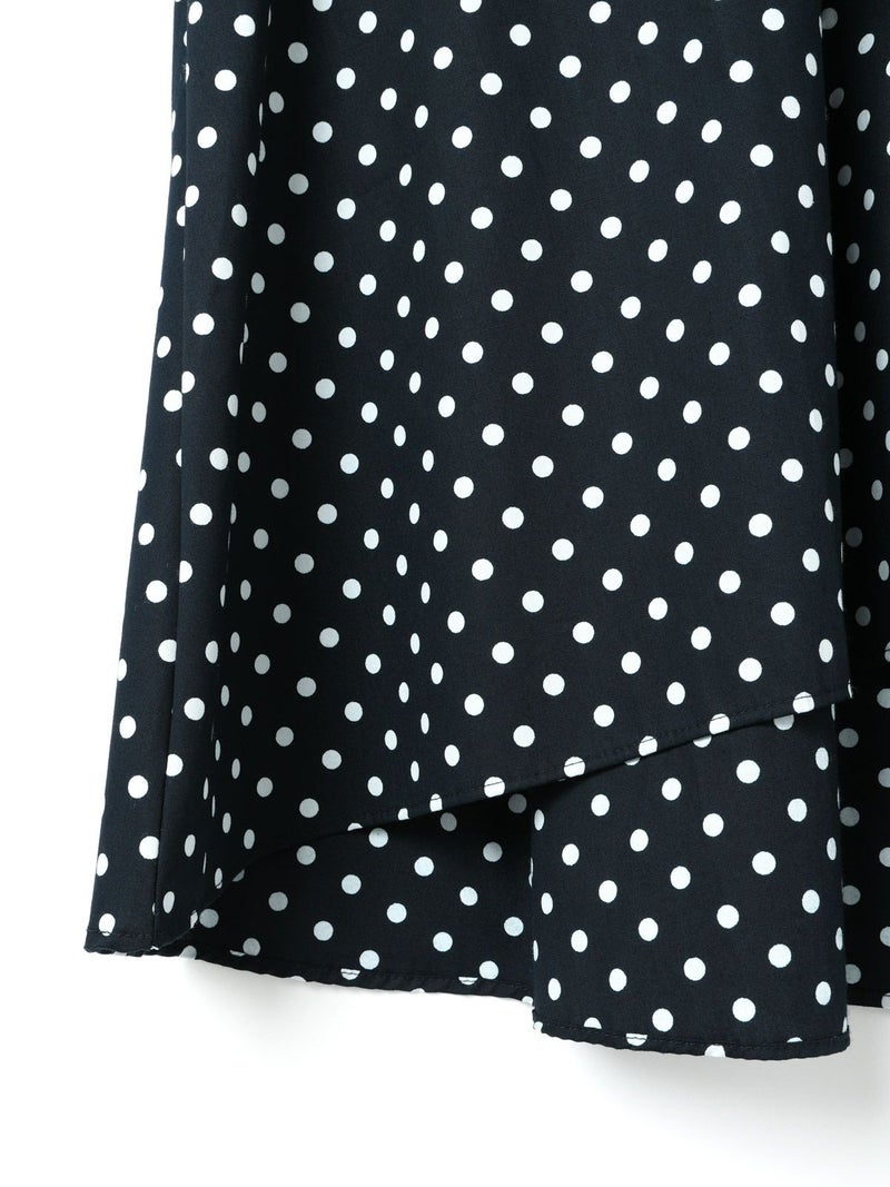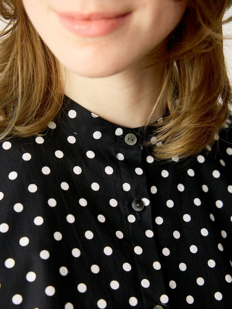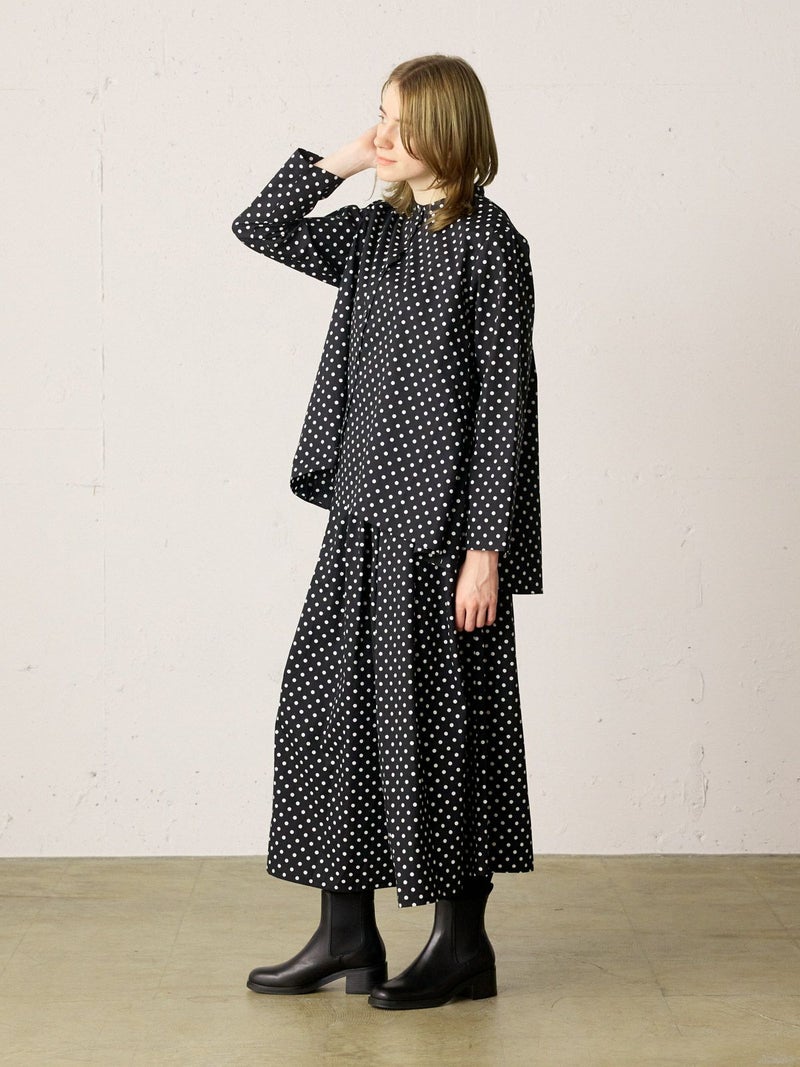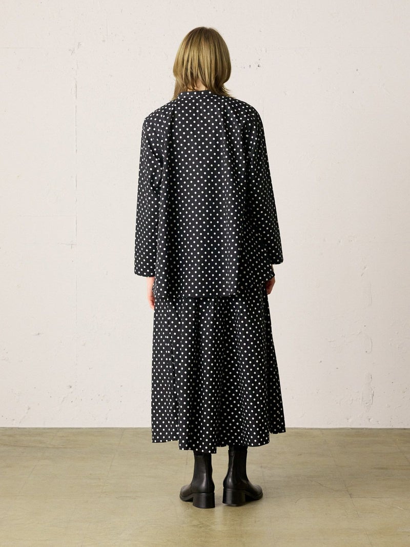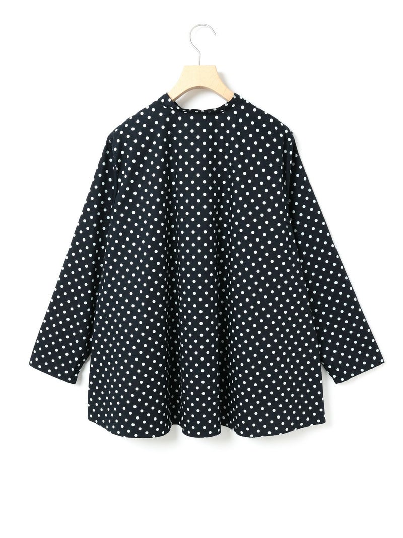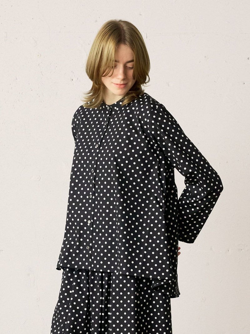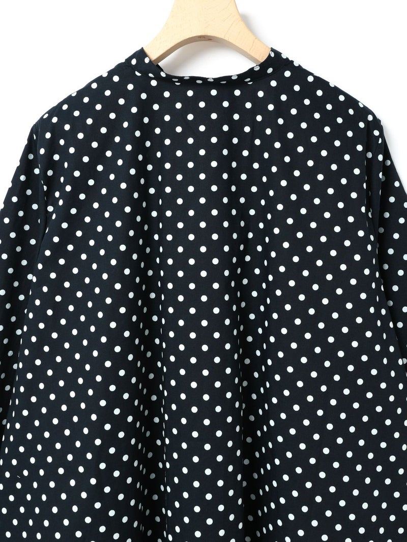 ドット柄のブロード素材を使用したドットシャツです。3-769627/ドットボリュームパンツとシリーズ。白ドットの映えるカラー展開で異なるドットサイズでデザインしました。Aラインシルエットのワイドなサイズ感と緩やかに前後差をつけた滑らかな裾ラインを表現。襟元はバンドカラーですっきりしたデザインです。ドットアイテムはシーズン通しても大変人気なアイテムとなっております。この秋おすすめの1枚です。