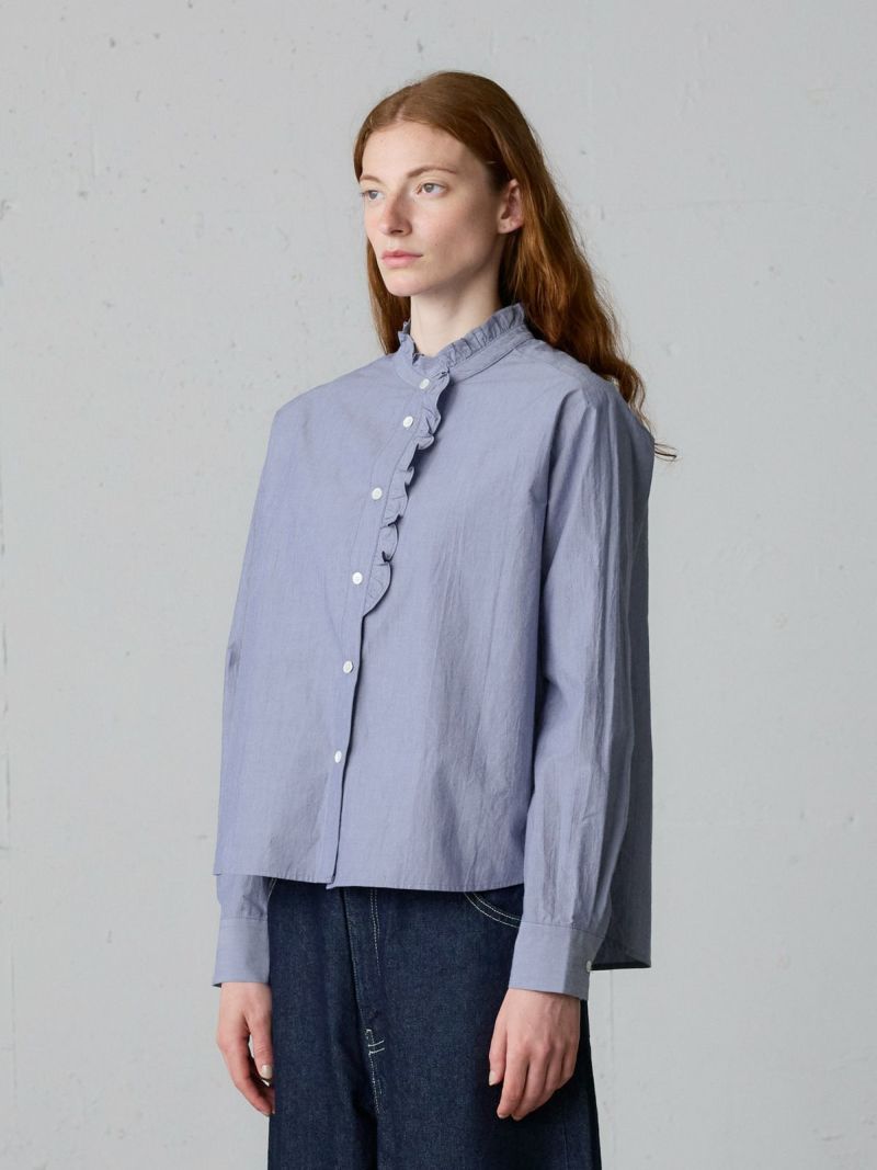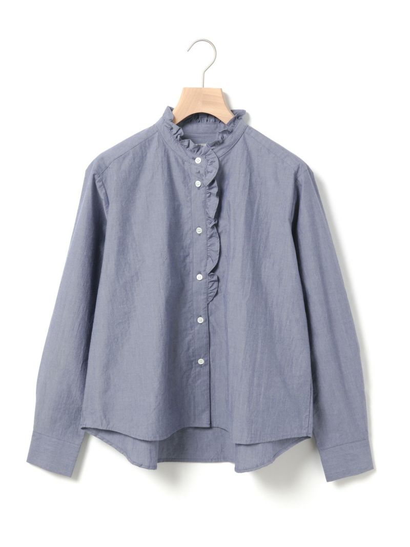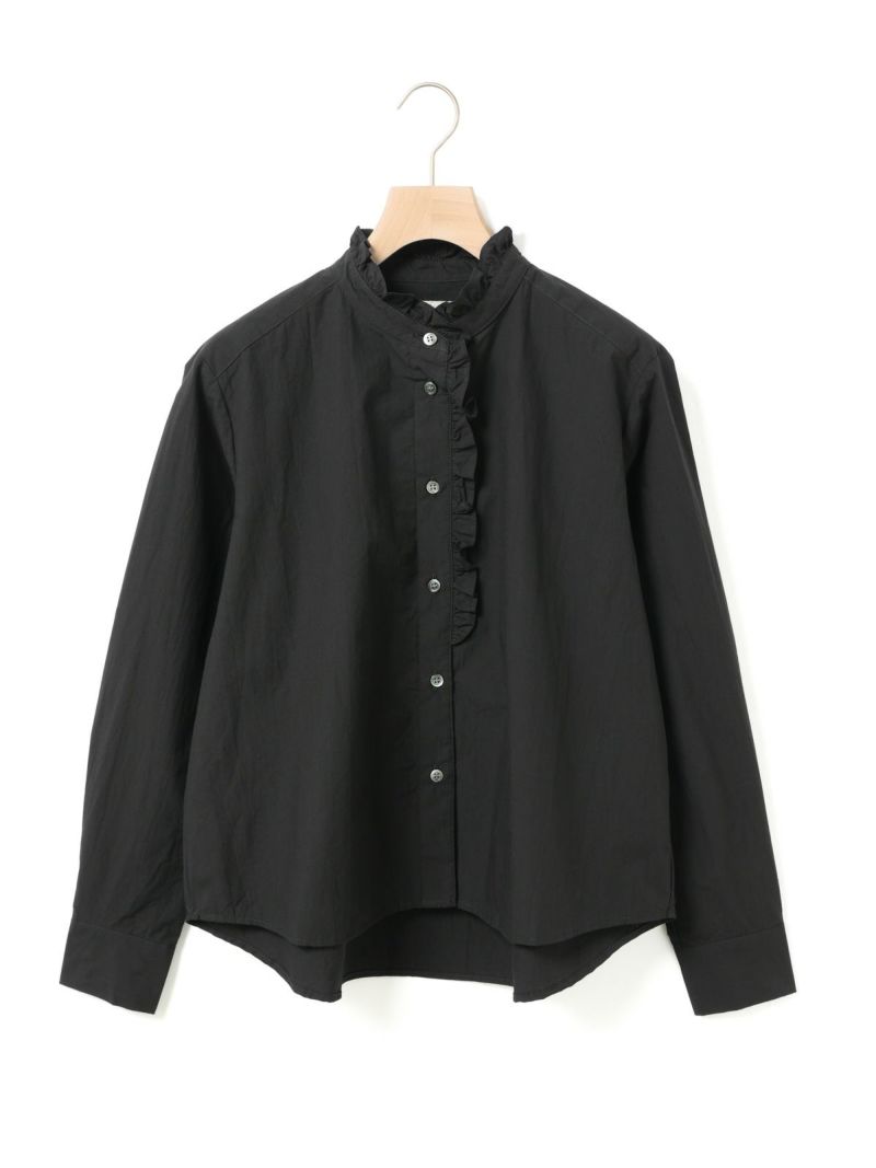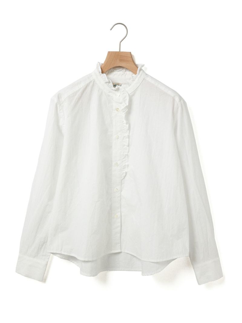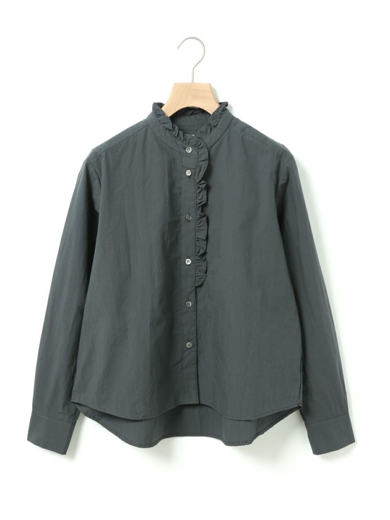 襟元、前立てにヴィンテージシャツのようなフリルをあしらったフロントハーフフリルシャツです。裾のラウンドヘム、少し細めのカフスが甘すぎない雰囲気に仕上がっています。洗いのかかったヴィンテージ感のあるタイプライターを使用。季節の変わり目に1枚でベーシックに着こなしても素敵ですが、重ね着でもフリルが目立つようデザインされており、女性らしい首元を演出してくれます。ニットのインナー使いにもお勧め。4色の落着きのあるベーシックカラーなので合わせやすいシャツです。