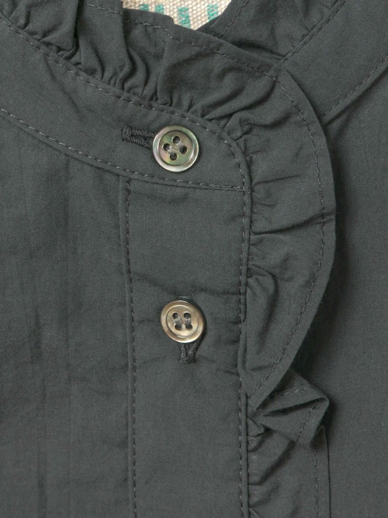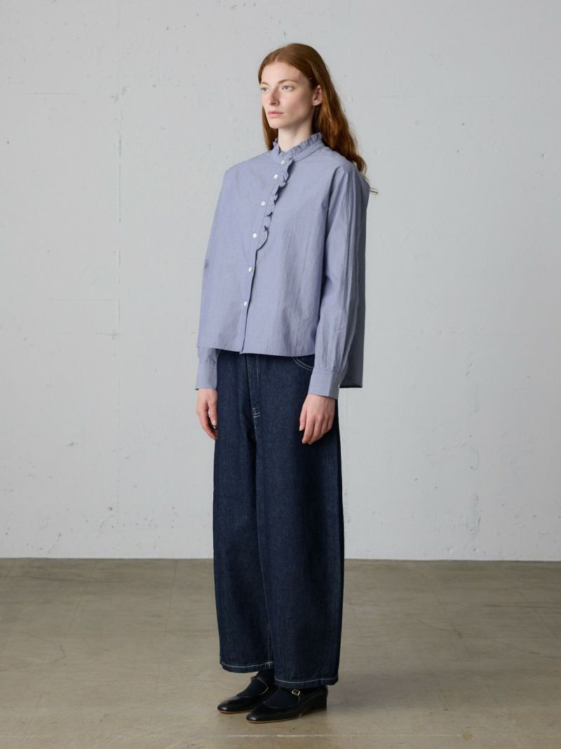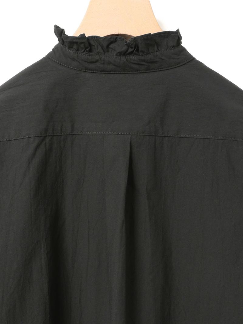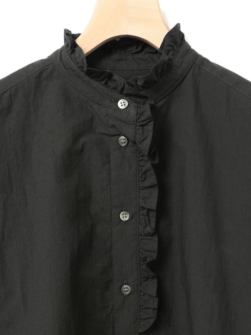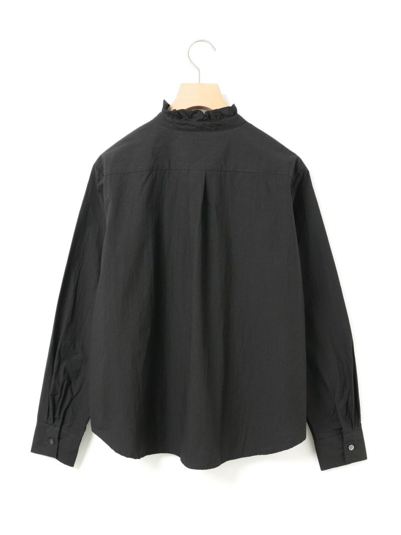襟元、前立てにヴィンテージシャツのようなフリルをあしらったフロントハーフフリルシャツです。裾のラウンドヘム、少し細めのカフスが甘すぎない雰囲気に仕上がっています。洗いのかかったヴィンテージ感のあるタイプライターを使用。季節の変わり目に1枚でベーシックに着こなしても素敵ですが、重ね着でもフリルが目立つようデザインされており、女性らしい首元を演出してくれます。ニットのインナー使いにもお勧め。4色の落着きのあるベーシックカラーなので合わせやすいシャツです。