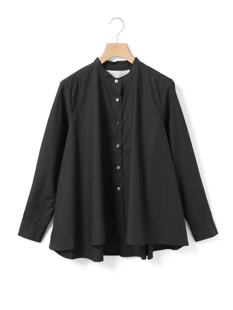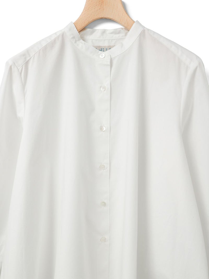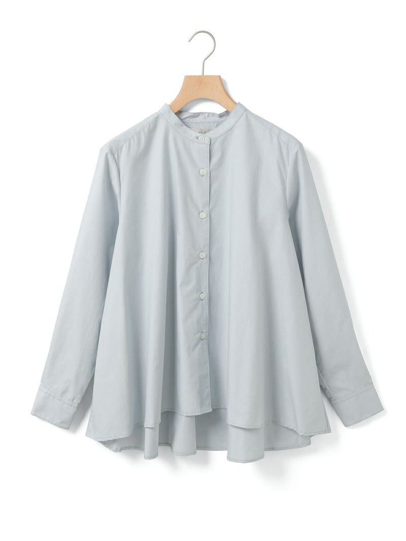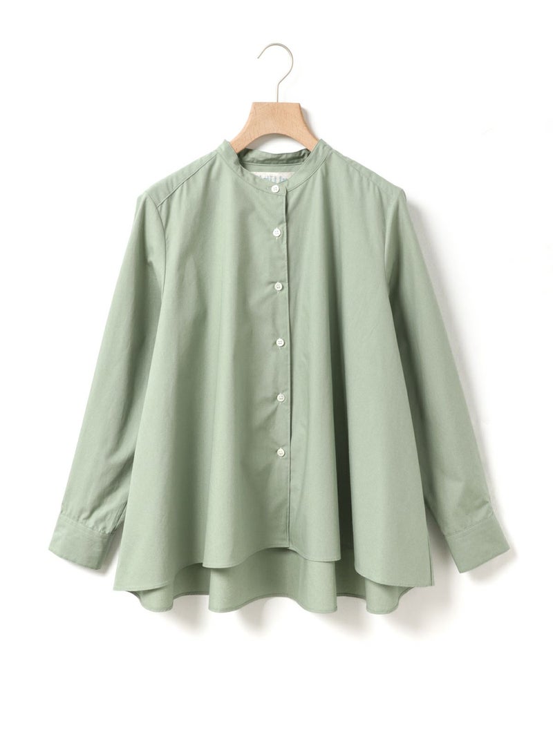 50タイプライター生地を使用した、MidiUmi定番のAラインバンドカラーシャツ。今季新色として落ち着きのあるグリーンを取り入れた清楚な1枚です。前振りの肩ライン、狭めの細めヨークにすることで肩回りをすっきり見せ、華奢見えします。滑らかな裾ラインは前後差が付いておりしなやかなドレープラインを演出します。程よいハリ感と軽やかな着心地で、美しいシルエットが際立つお勧めのシャツです。