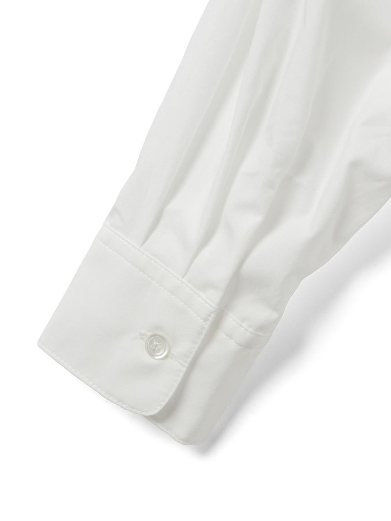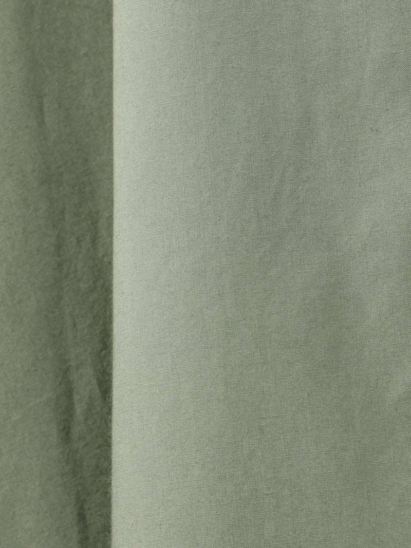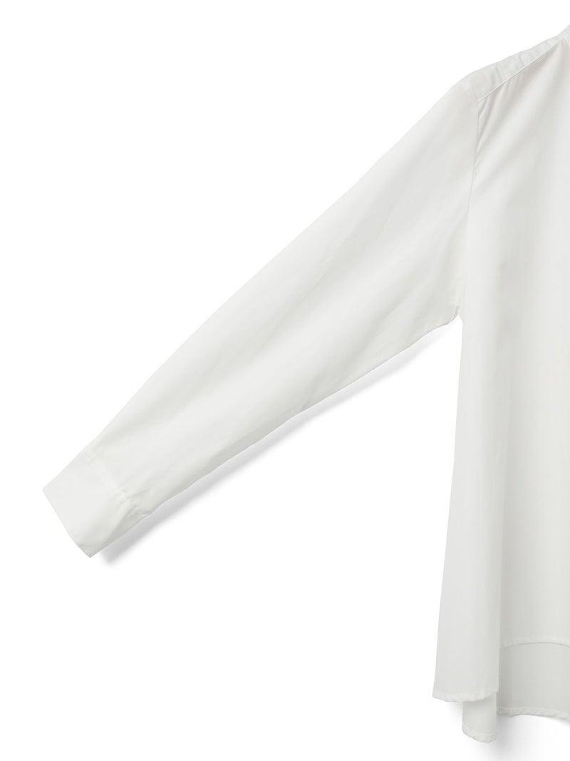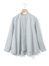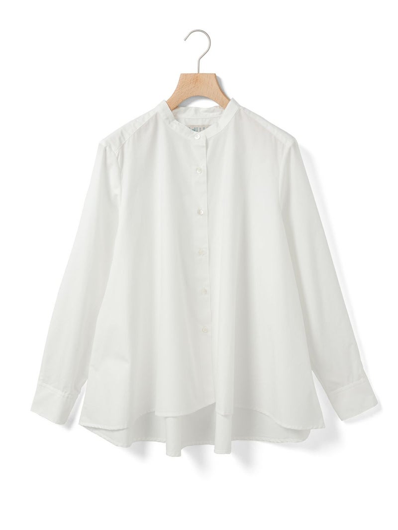 50タイプライター生地を使用した、MidiUmi定番のAラインバンドカラーシャツ。今季新色として落ち着きのあるグリーンを取り入れた清楚な1枚です。前振りの肩ライン、狭めの細めヨークにすることで肩回りをすっきり見せ、華奢見えします。滑らかな裾ラインは前後差が付いておりしなやかなドレープラインを演出します。程よいハリ感と軽やかな着心地で、美しいシルエットが際立つお勧めのシャツです。