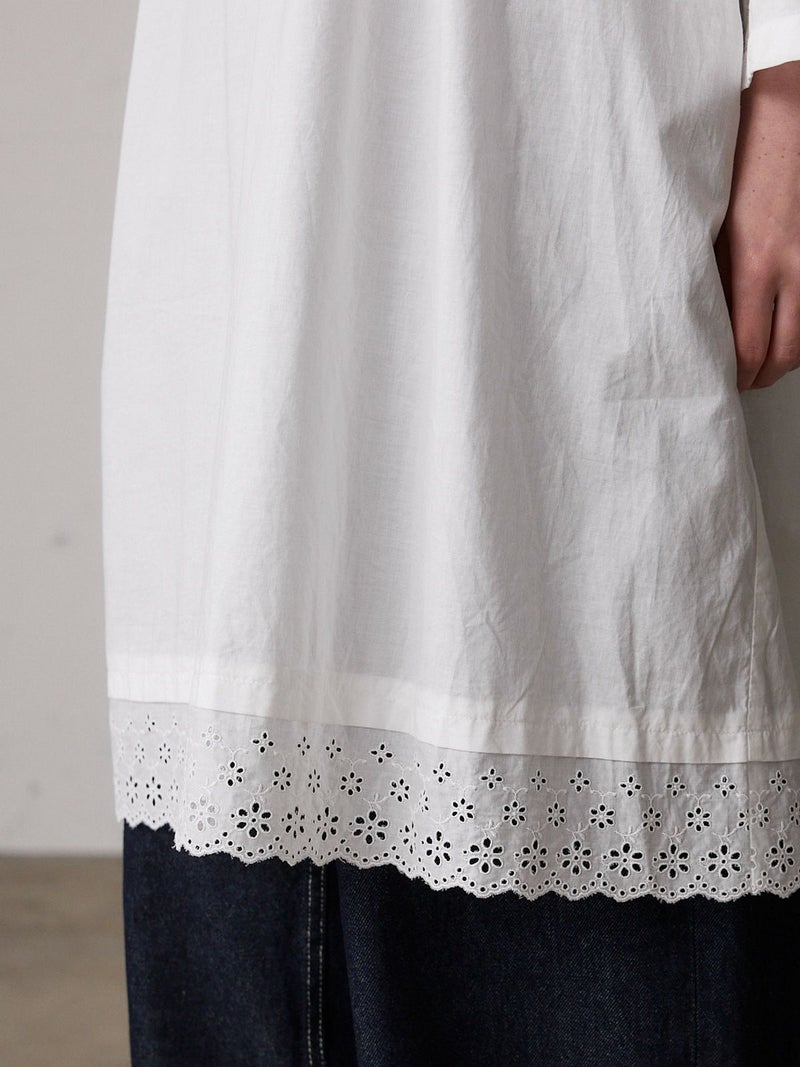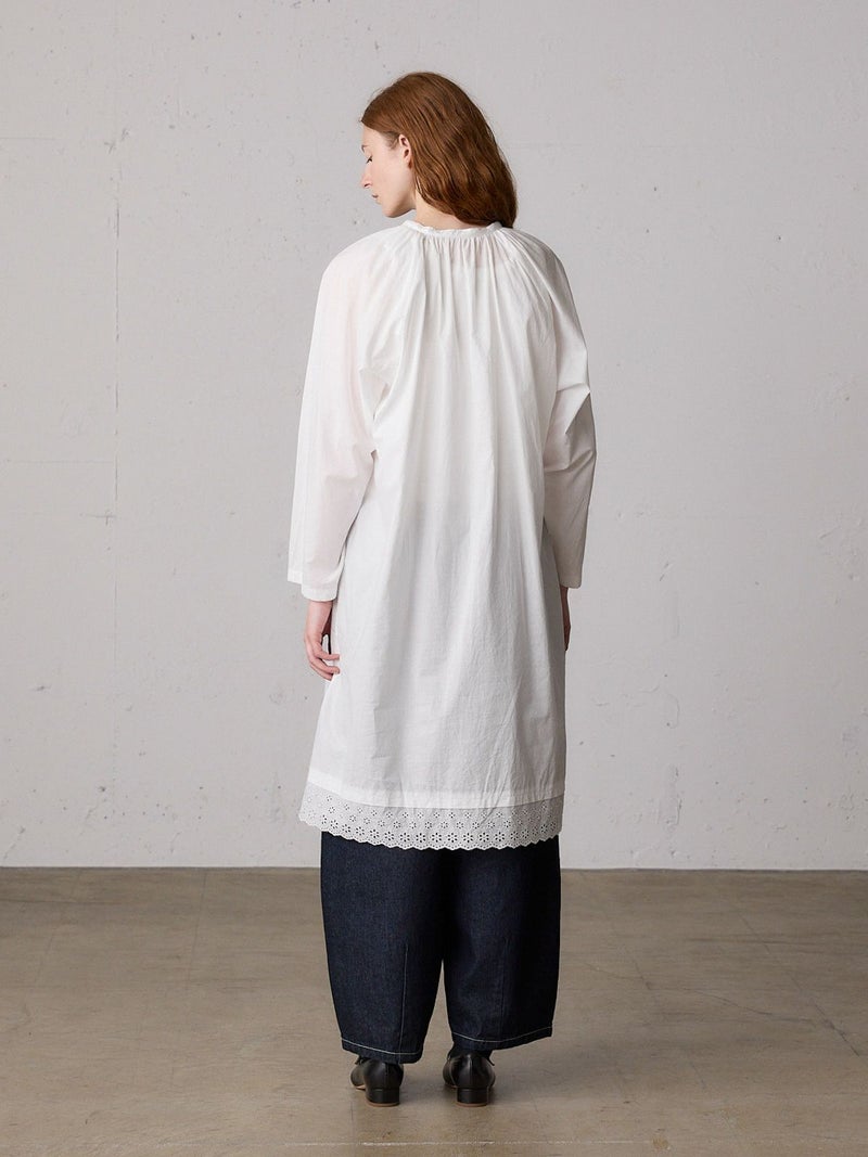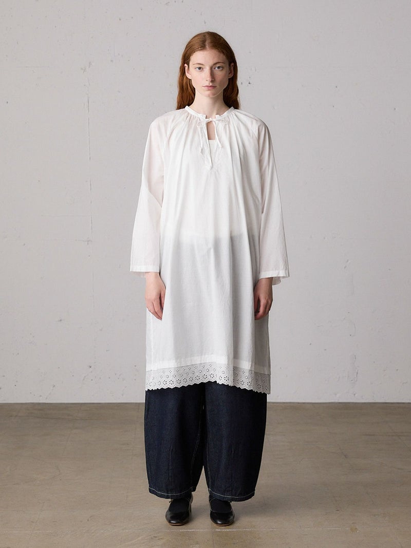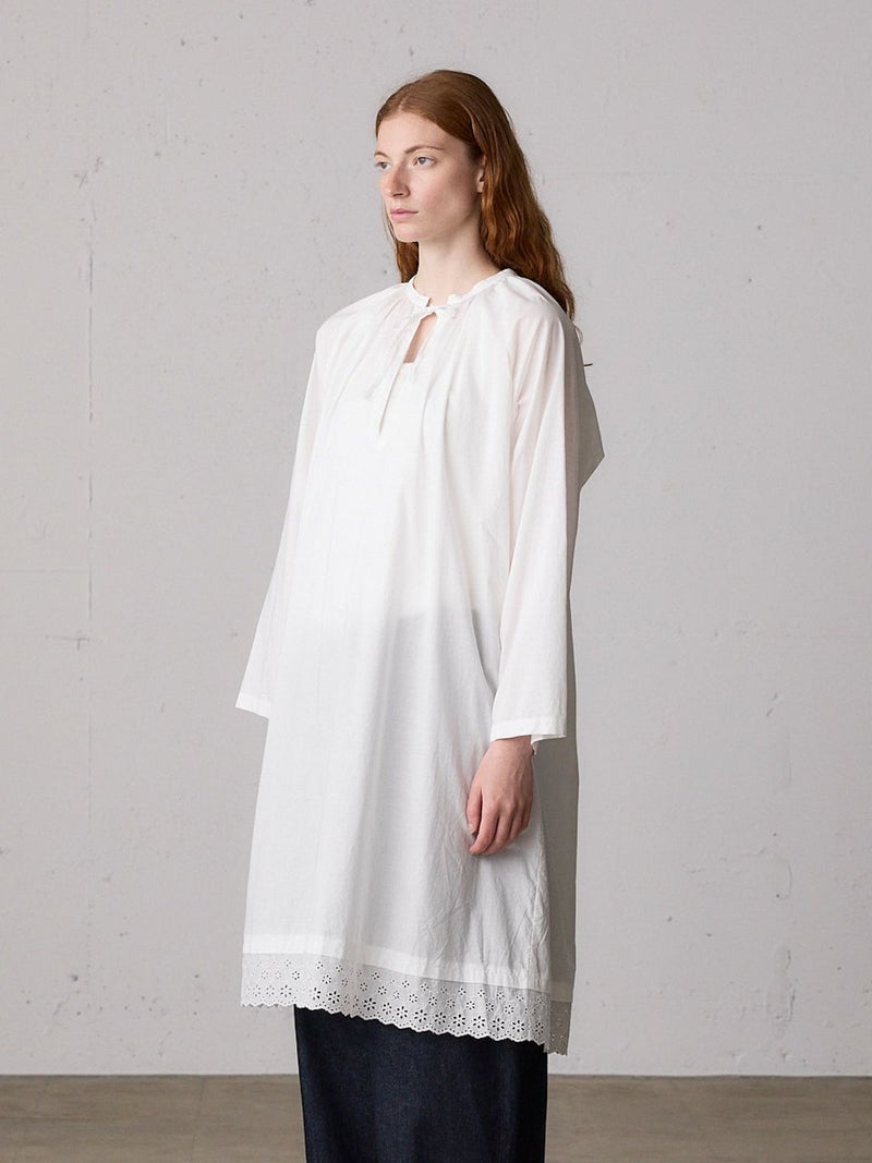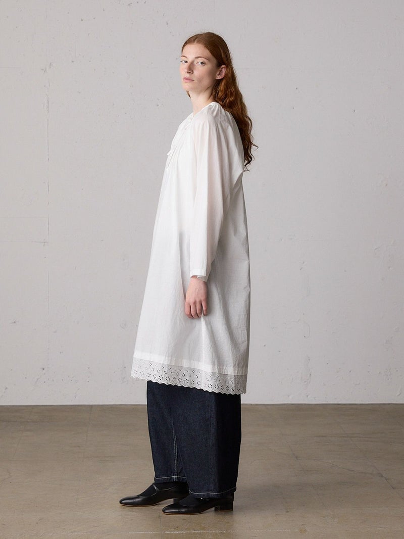 上品なレースの60ローンエンブロイダリーを使用したヘムレーススモックワンピースです。洗い加工を施したことでヴィンテージ感のあるデザインに仕上げました。裾にレースをあしらっています。透け感があり晩夏から秋~冬にかけ長く愛用していただけます。上からニットを着るレイヤードもおすすめです。