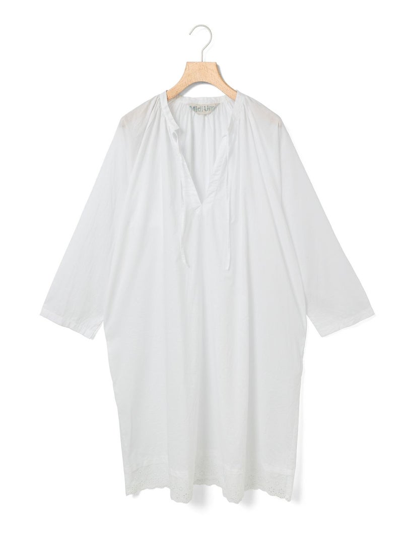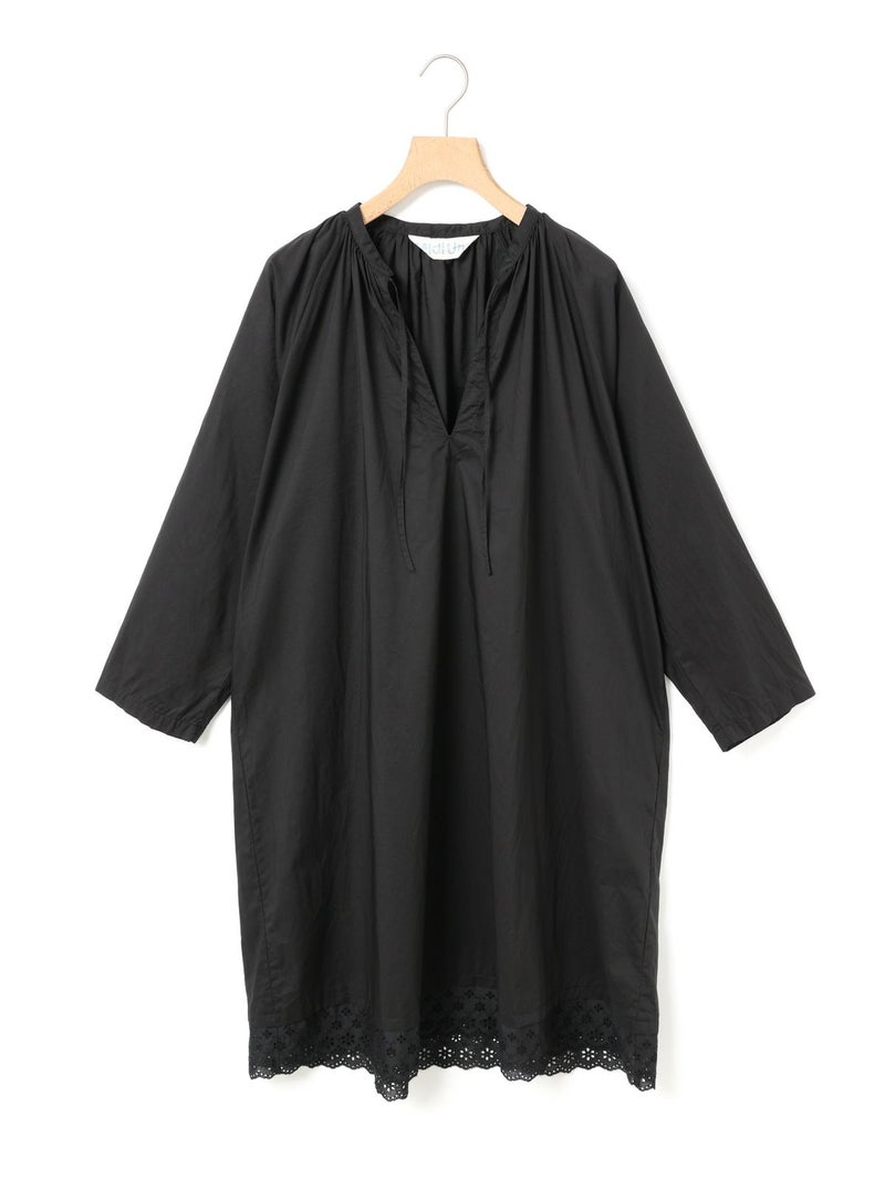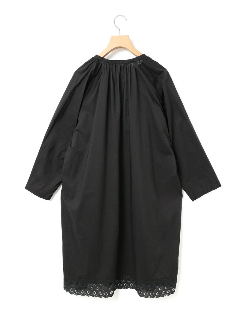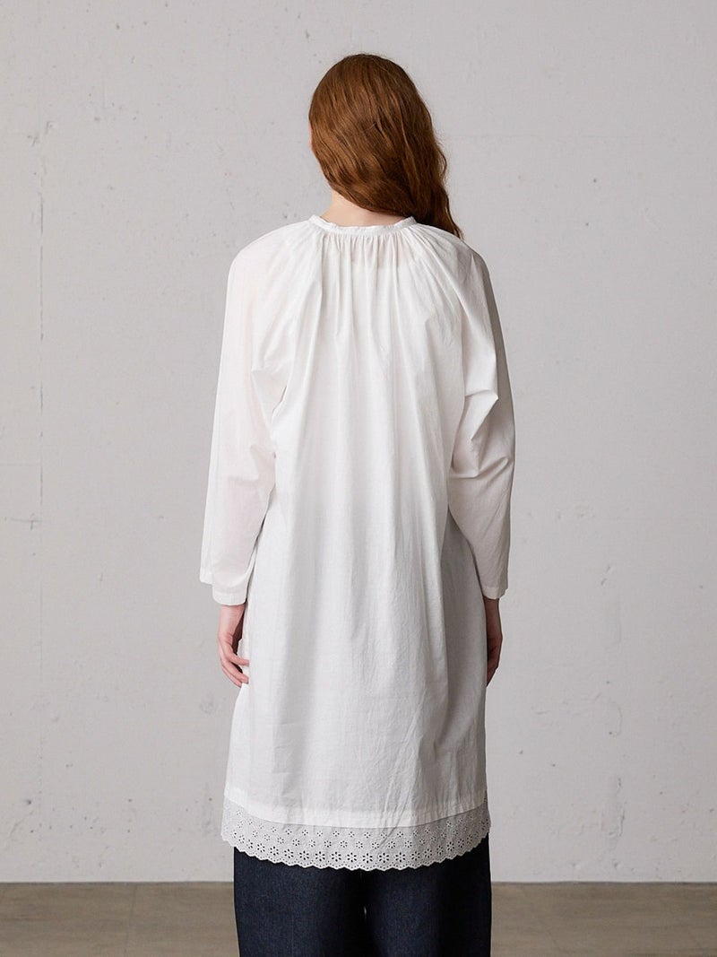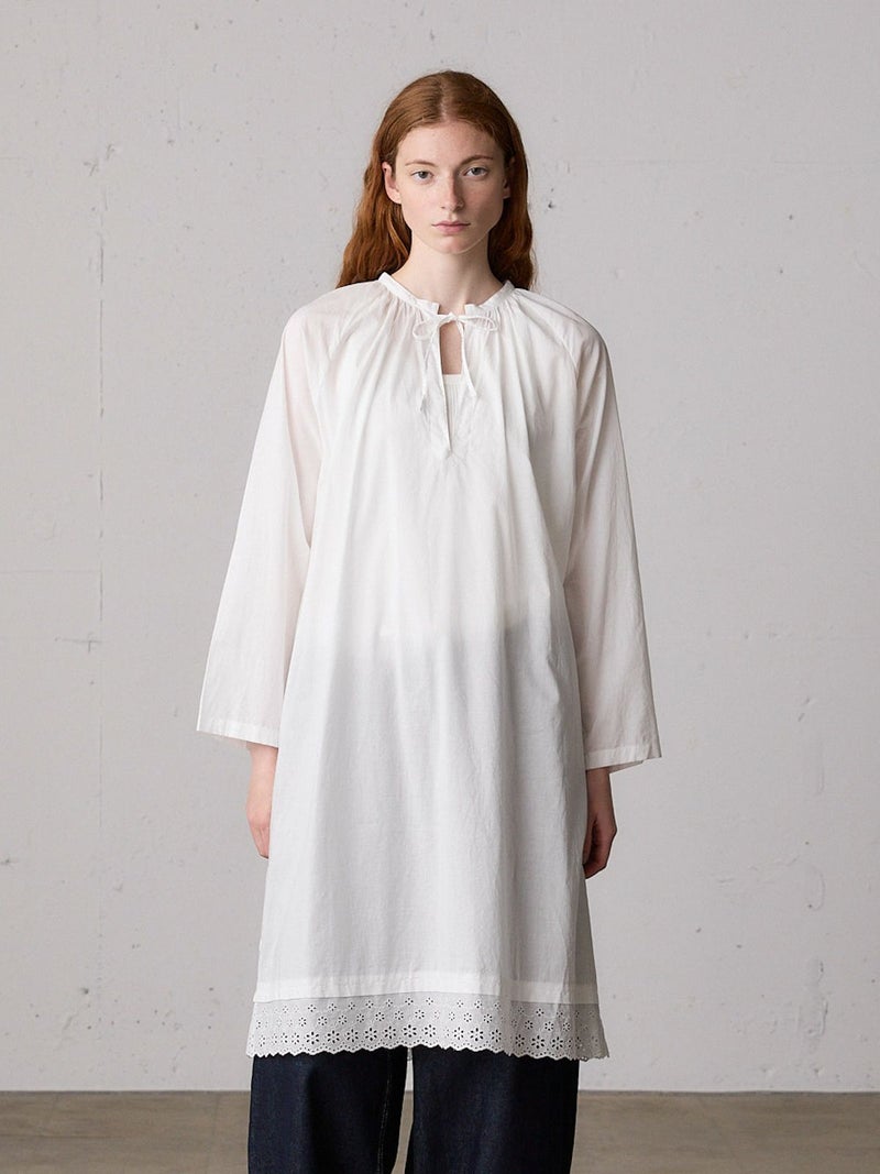 上品なレースの60ローンエンブロイダリーを使用したヘムレーススモックワンピースです。洗い加工を施したことでヴィンテージ感のあるデザインに仕上げました。裾にレースをあしらっています。透け感があり晩夏から秋~冬にかけ長く愛用していただけます。上からニットを着るレイヤードもおすすめです。