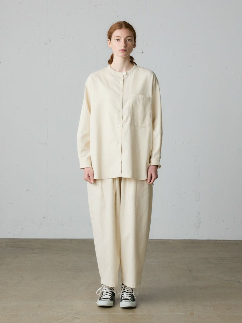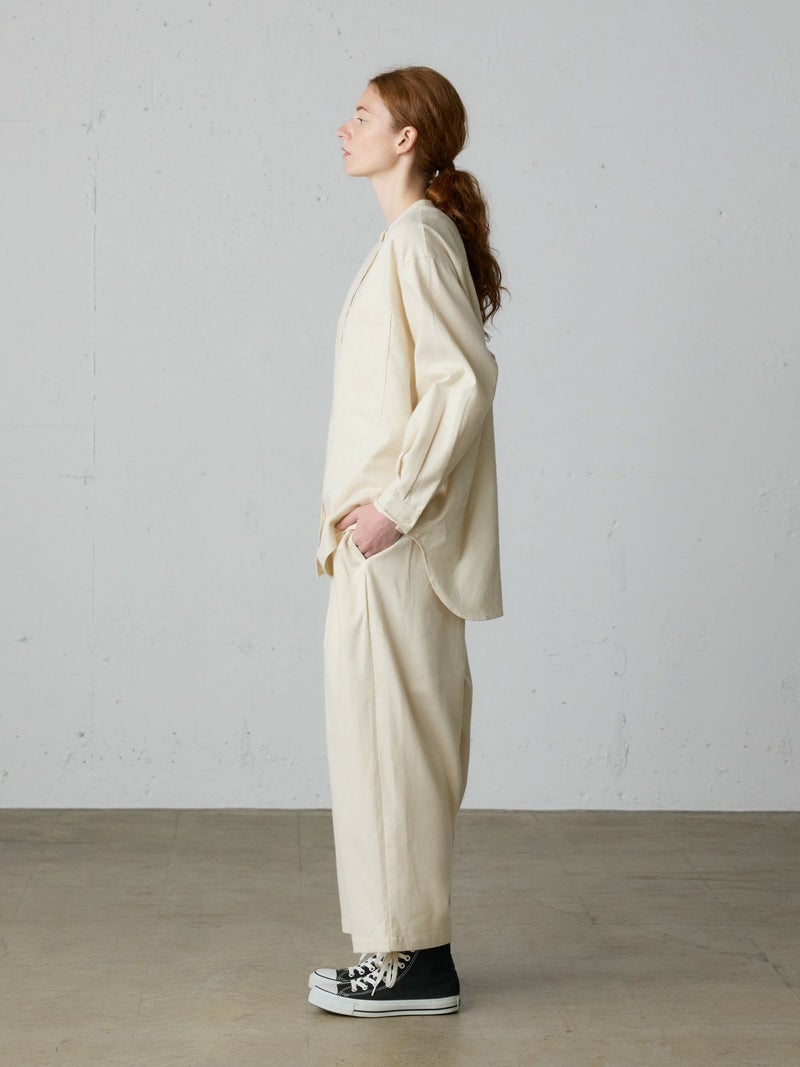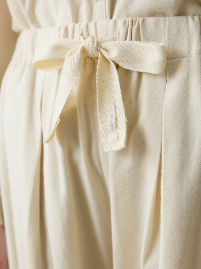 空気を含み、暖かく着用できる微起毛のネル素材を使用したHOMEコクーンパンツです。丸みのあるコクーンシルエットが特徴。ウエストはリラックス感のあるゴム使用と大きなリボンがポイント。オーガニックコットンネルを使用しているのでアイボリーも暖か味がございます。3-731030/HOMEバンドカラーシャツと合わせるとオールインワンのように着用いただけます。※着心地を重視する為にブランドネームは外側(ウエスト紐)につきます。
