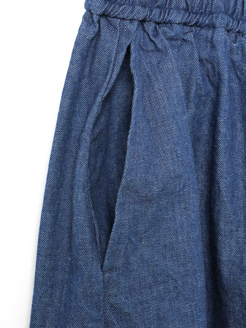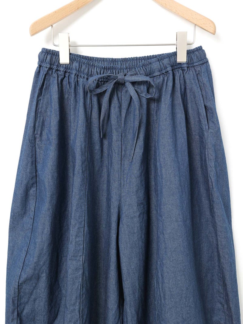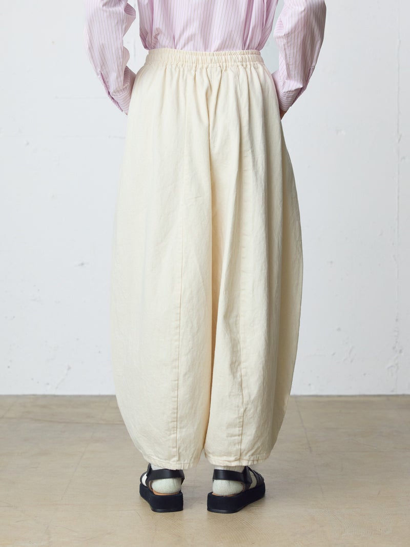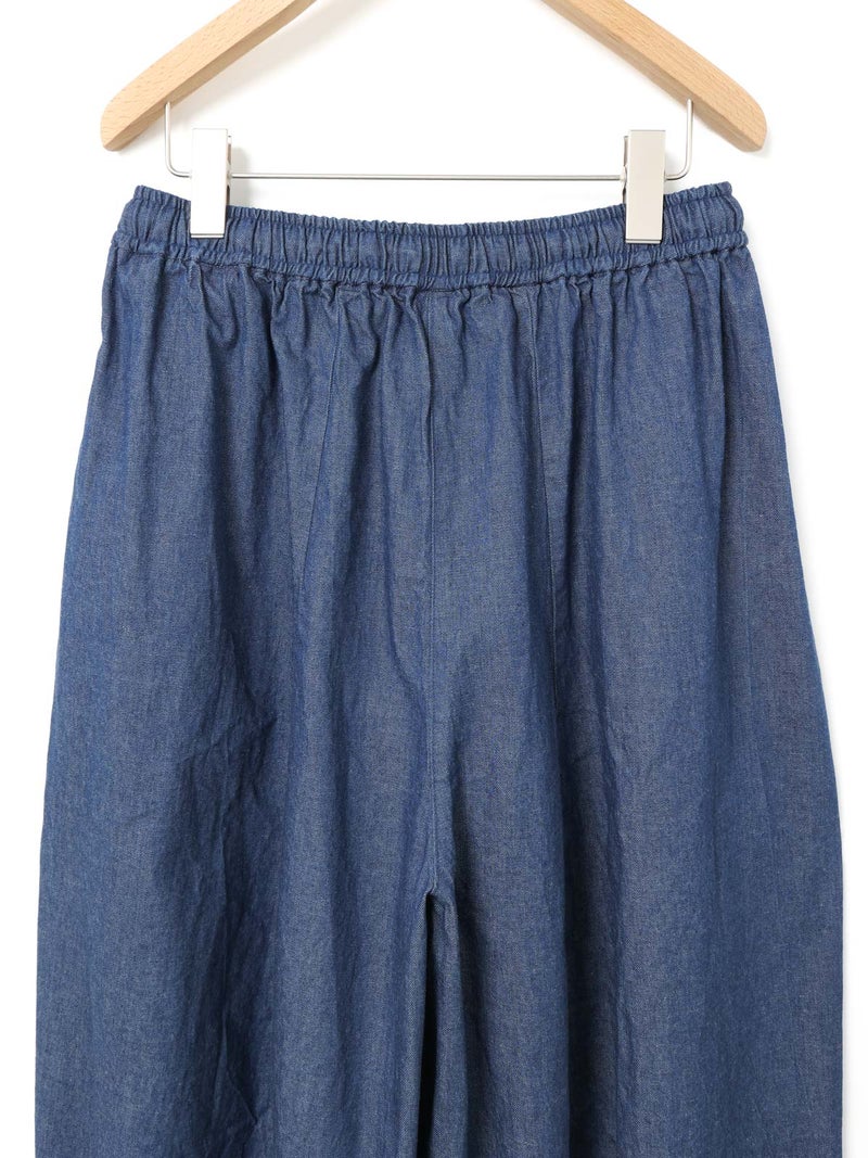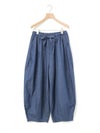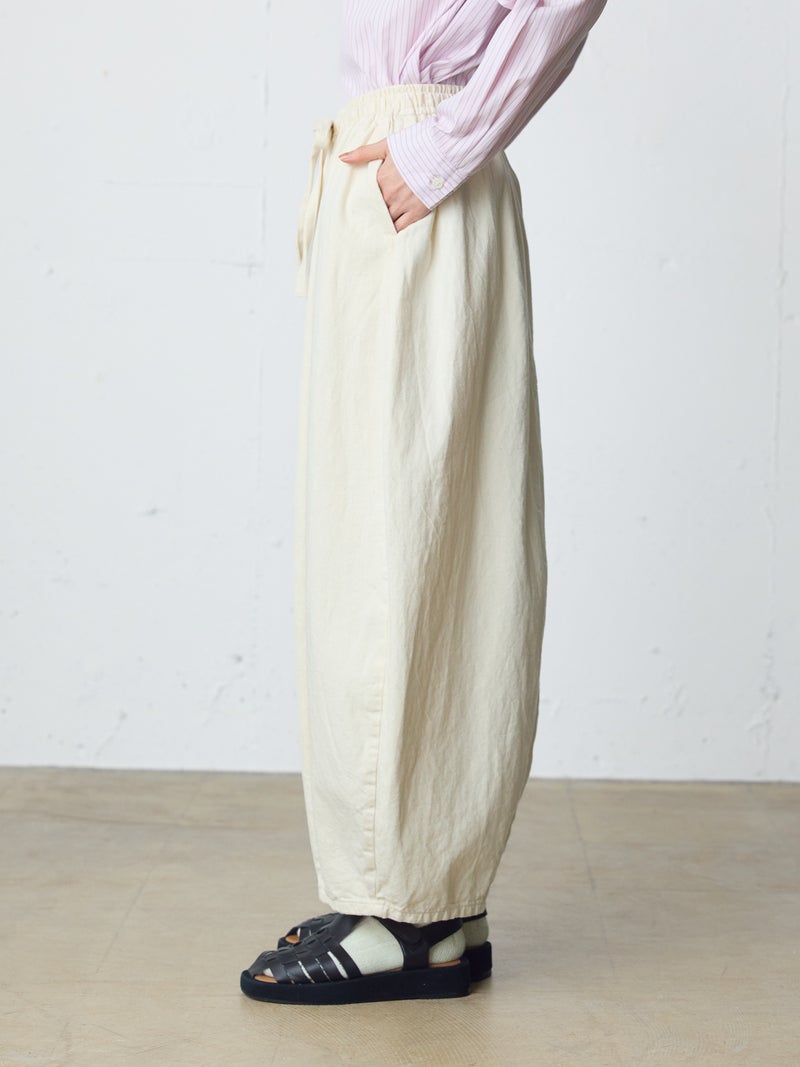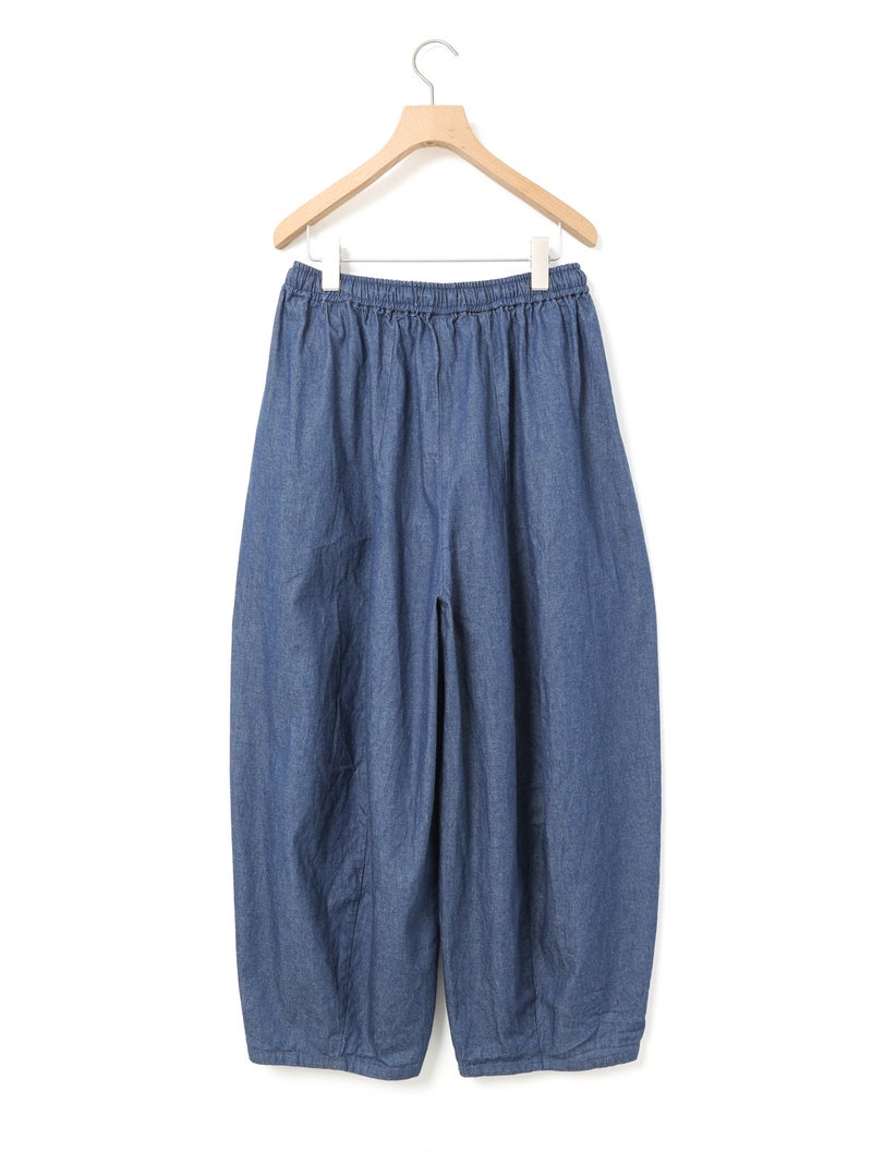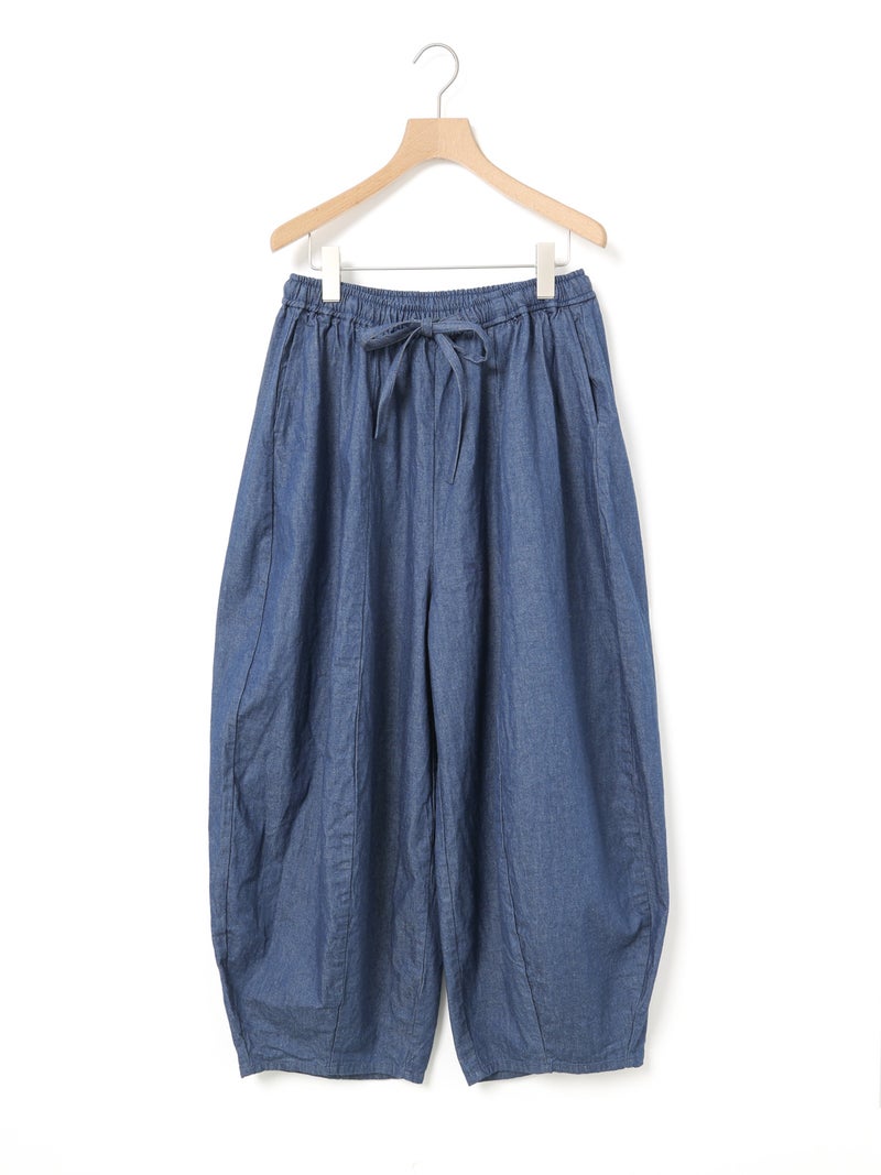 8ozのデニムを使用したデニムコクーンイージーパンツが今季も再入荷しました。通年着用いただける素材を使用しているため長く愛用いただける1枚。大胆なボリュームシルエットを表現した新鮮なサーカスパンツのデザインが魅力的。ひざ下から丸みのある形になっており、足元で溜まるデザインがポイントです。股上が深めのハイウエスト仕上げで、調整紐付きなので腰で落としてシルエットを変化させても素敵です。ショート丈トップスと好相性で、バランスよく着こなしていただけます。カジュアルに決まるボトムアイテムです。