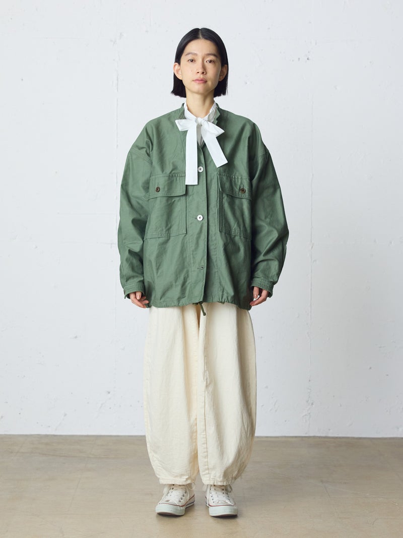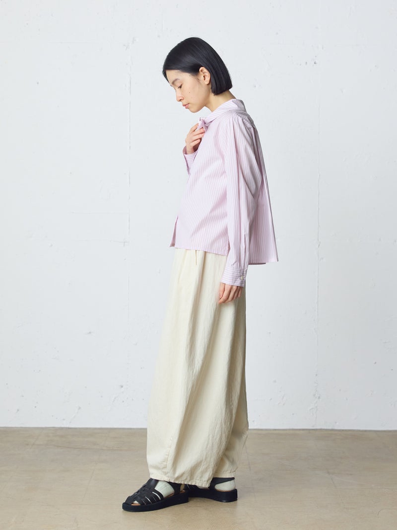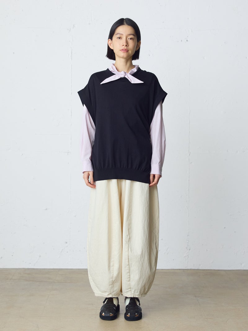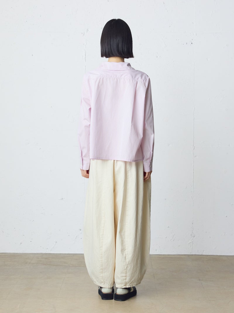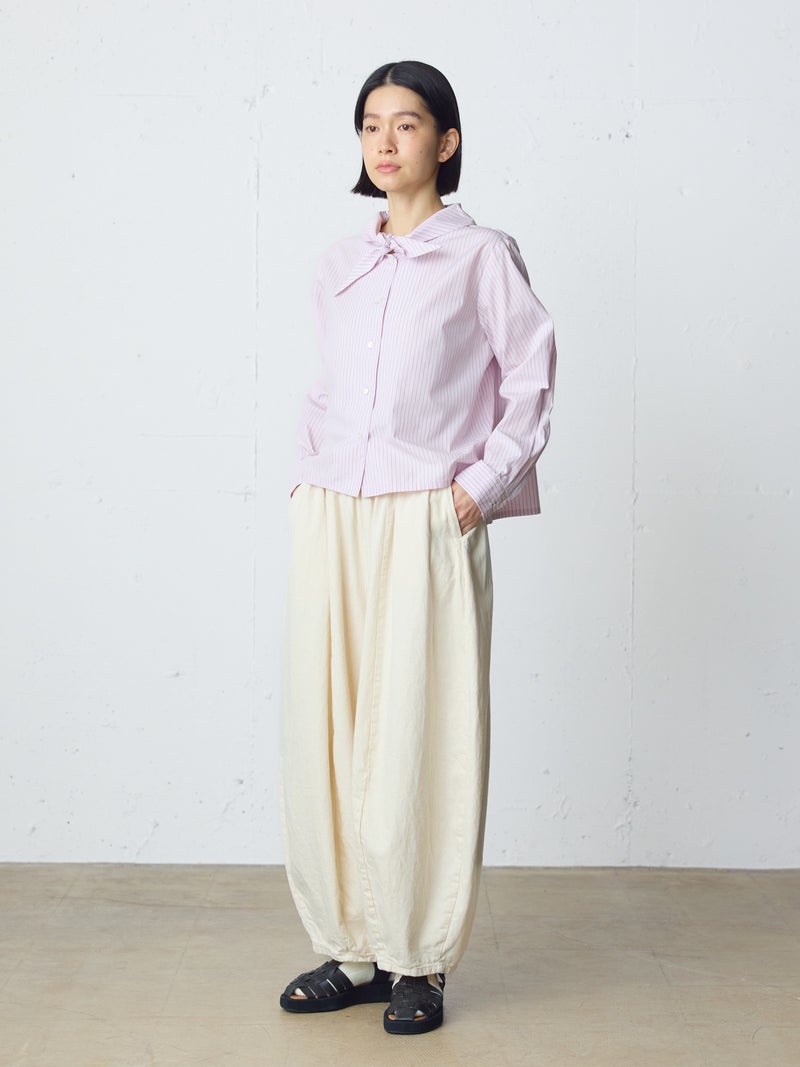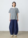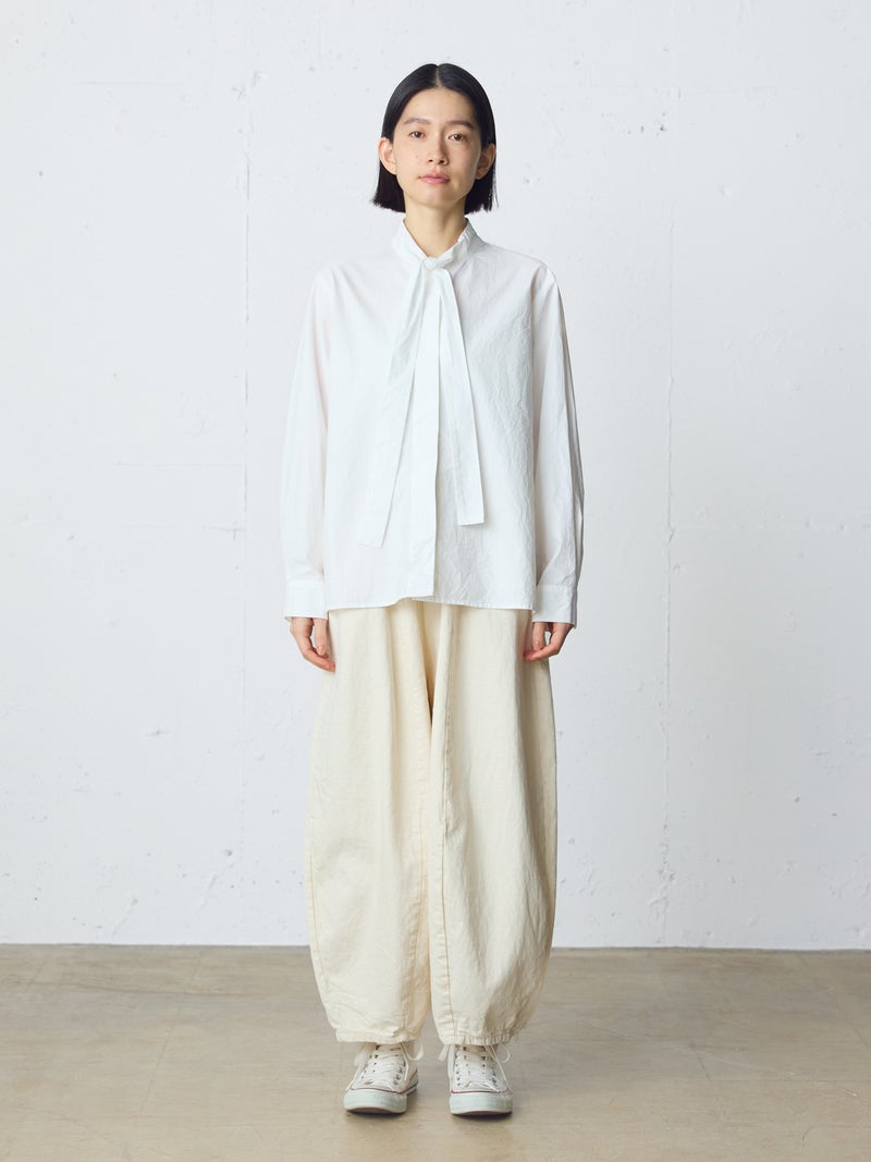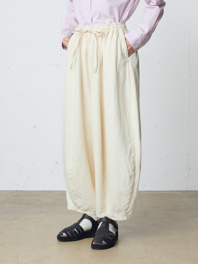 8ozのデニムを使用したデニムコクーンイージーパンツが今季も再入荷しました。通年着用いただける素材を使用しているため長く愛用いただける1枚。大胆なボリュームシルエットを表現した新鮮なサーカスパンツのデザインが魅力的。ひざ下から丸みのある形になっており、足元で溜まるデザインがポイントです。股上が深めのハイウエスト仕上げで、調整紐付きなので腰で落としてシルエットを変化させても素敵です。ショート丈トップスと好相性で、バランスよく着こなしていただけます。カジュアルに決まるボトムアイテムです。