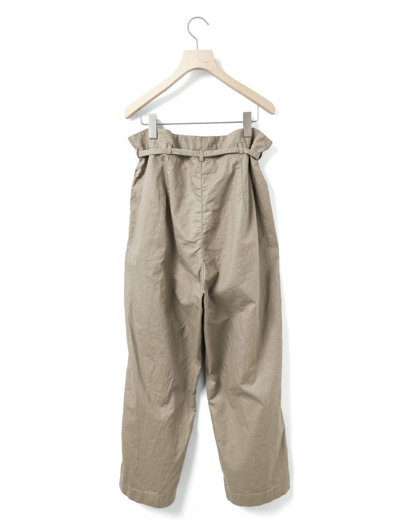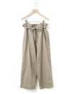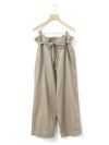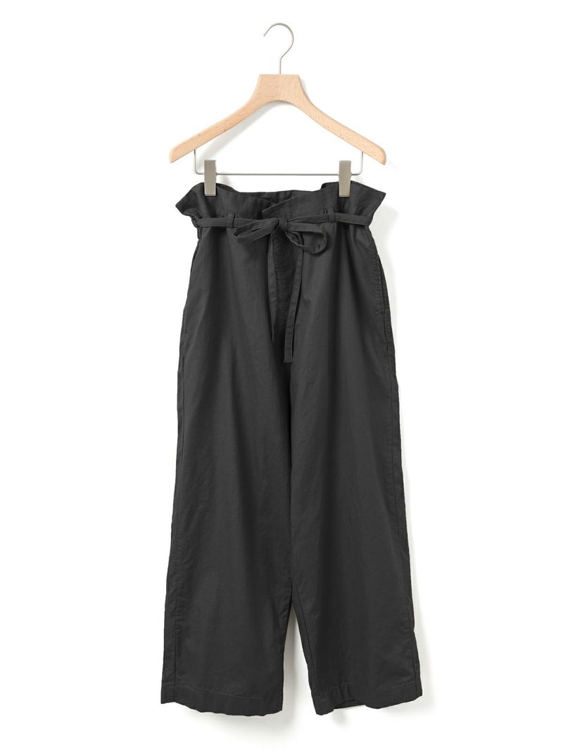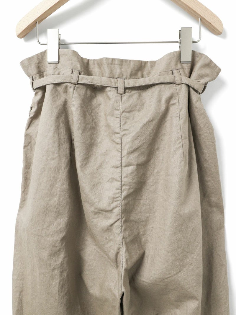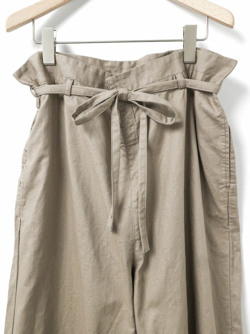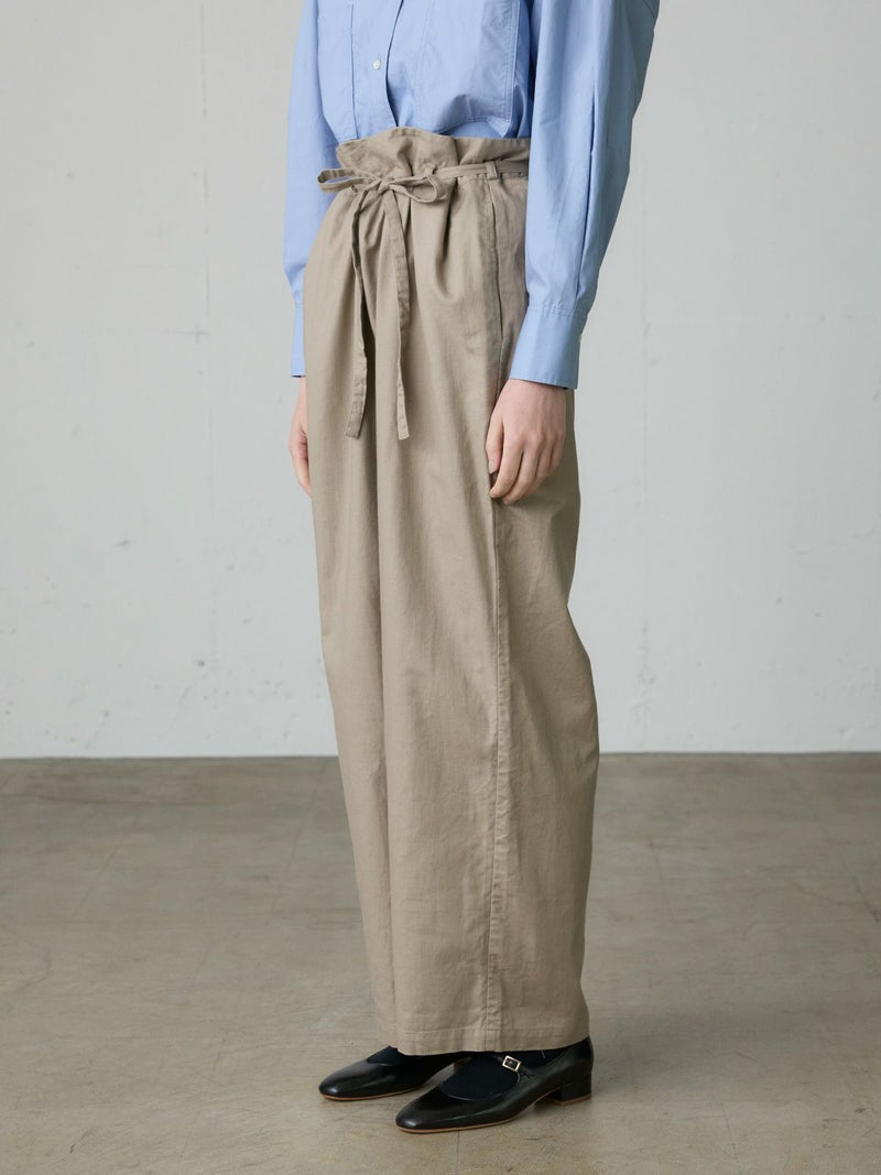 コットンリネンのサージ組織素材を使用したコットンリネンワイドボリュームパンツです。麻混ならではシルエットの粗野感がありながら品のある艶感のある素材が特徴的。ヴィンテージのホスピタルパンツから着想を得た、ウエストでゆったり紐を絞るタイプのワイドパンツで、メンズライクなデザインが印象的。ウエストにはドロスト付きでハイウエストギャザー仕上げ。折り込んでスッキリと着用できる1枚です。※ホスピタルパンツとは…軍施設などでケガや入院した兵士が着用するために採用されたパンツ。同シリーズ3-739969/ コットンリネンワイドベストとのセットアップも可能。