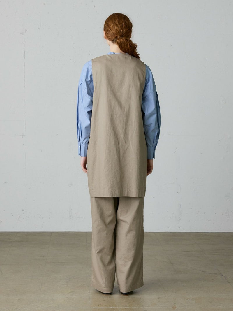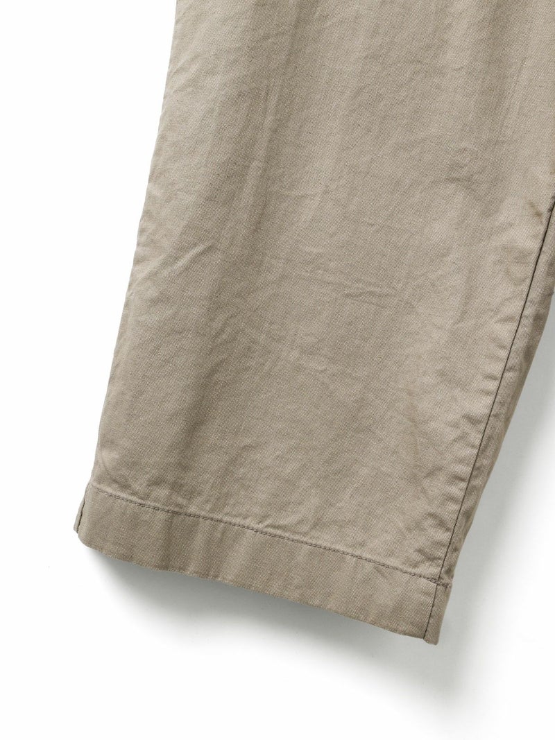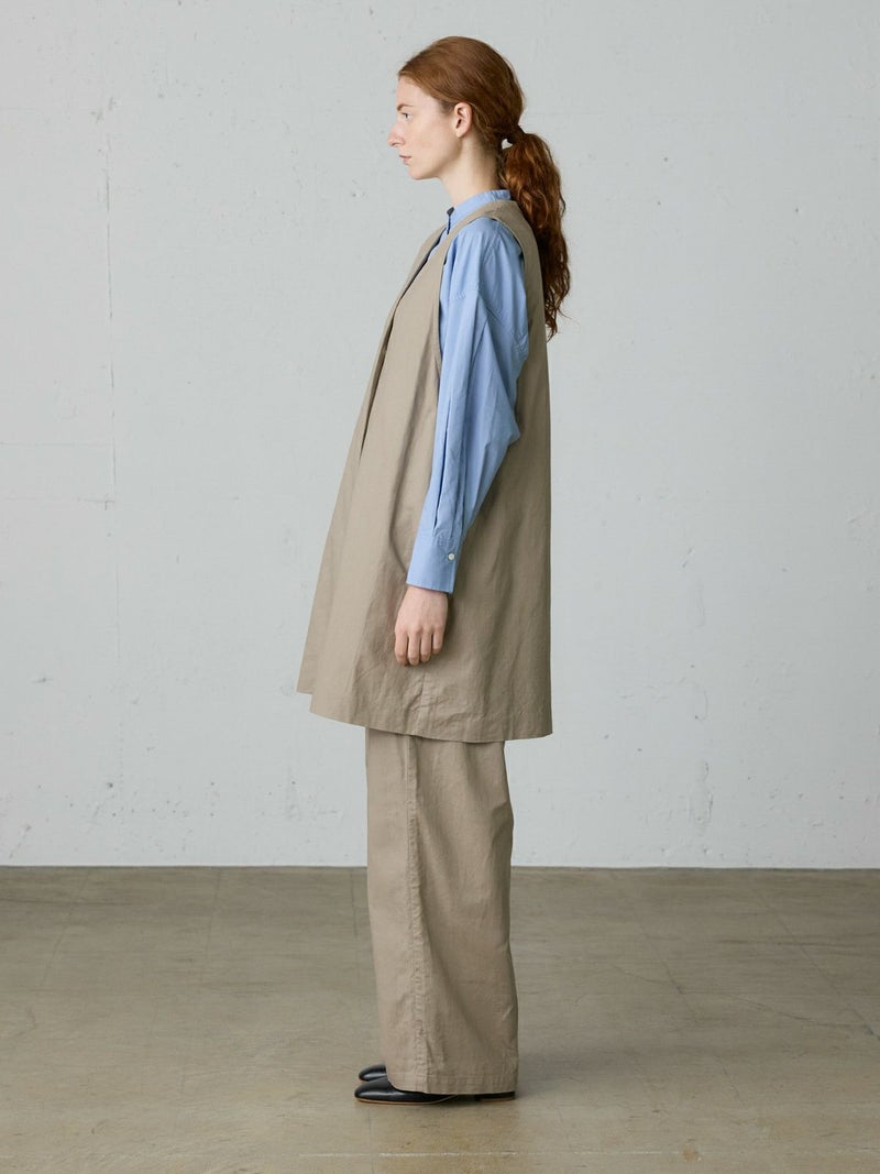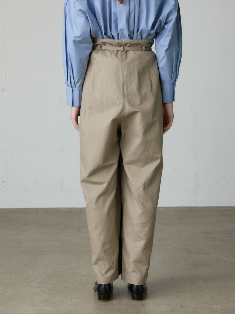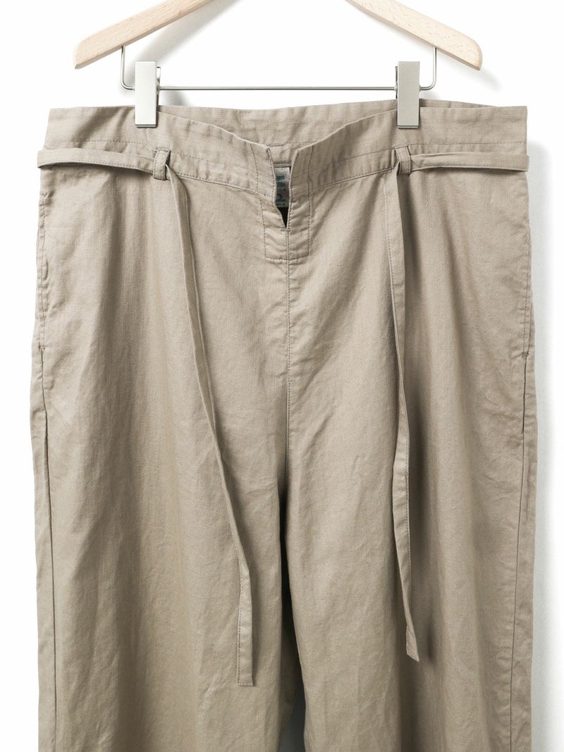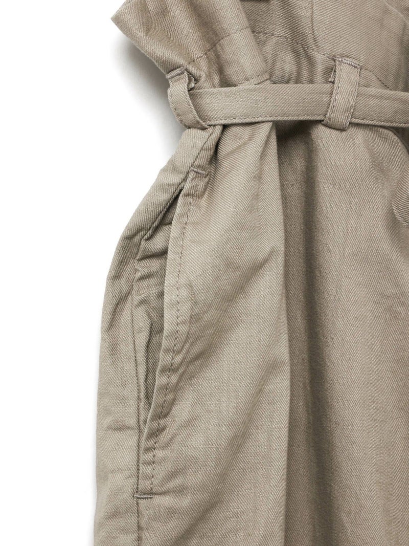 コットンリネンのサージ組織素材を使用したコットンリネンワイドボリュームパンツです。麻混ならではシルエットの粗野感がありながら品のある艶感のある素材が特徴的。ヴィンテージのホスピタルパンツから着想を得た、ウエストでゆったり紐を絞るタイプのワイドパンツで、メンズライクなデザインが印象的。ウエストにはドロスト付きでハイウエストギャザー仕上げ。折り込んでスッキリと着用できる1枚です。※ホスピタルパンツとは…軍施設などでケガや入院した兵士が着用するために採用されたパンツ。同シリーズ3-739969/ コットンリネンワイドベストとのセットアップも可能。