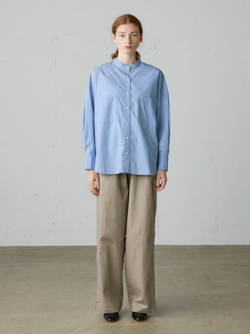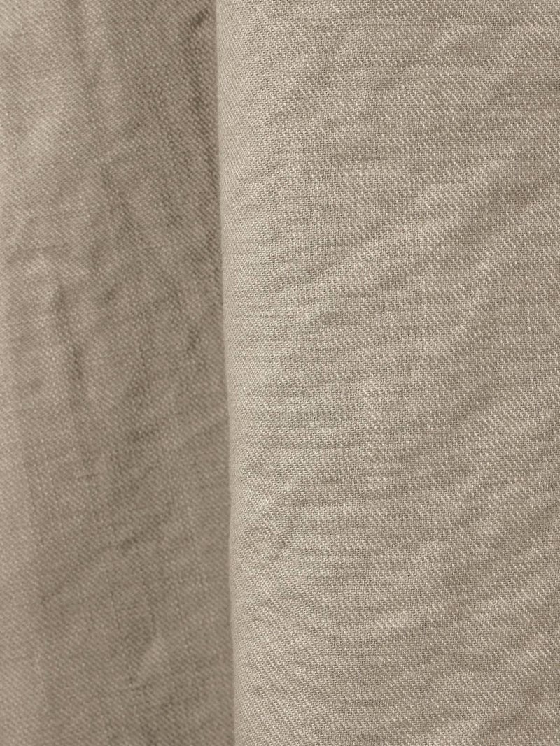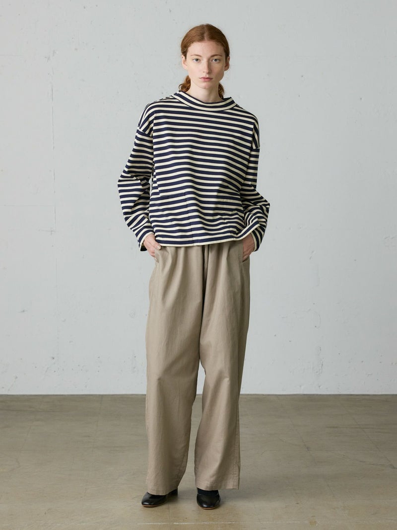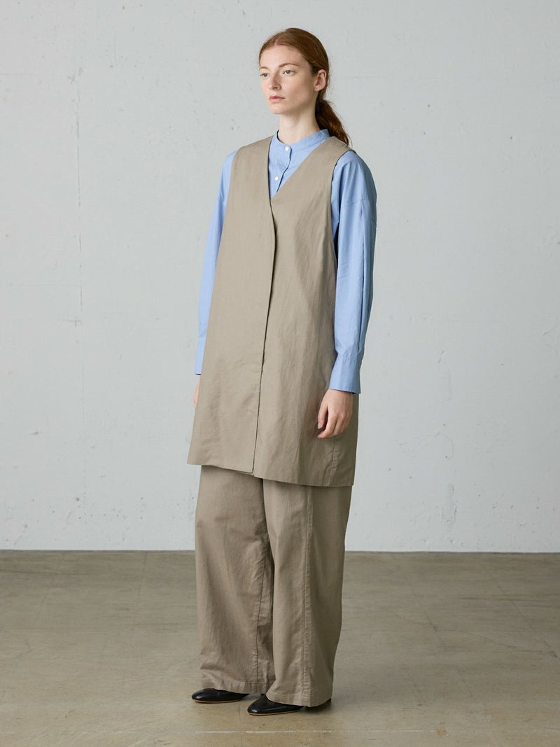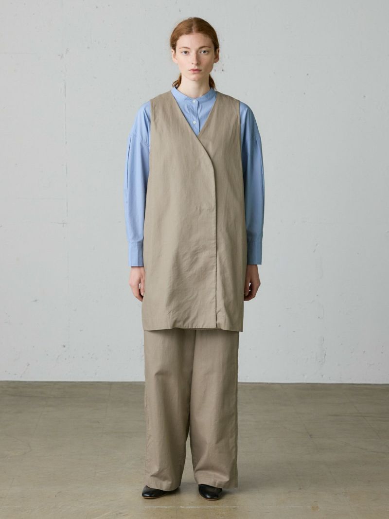 コットンリネンのサージ組織素材を使用したコットンリネンワイドボリュームパンツです。麻混ならではシルエットの粗野感がありながら品のある艶感のある素材が特徴的。ヴィンテージのホスピタルパンツから着想を得た、ウエストでゆったり紐を絞るタイプのワイドパンツで、メンズライクなデザインが印象的。ウエストにはドロスト付きでハイウエストギャザー仕上げ。折り込んでスッキリと着用できる1枚です。※ホスピタルパンツとは…軍施設などでケガや入院した兵士が着用するために採用されたパンツ。同シリーズ3-739969/ コットンリネンワイドベストとのセットアップも可能。