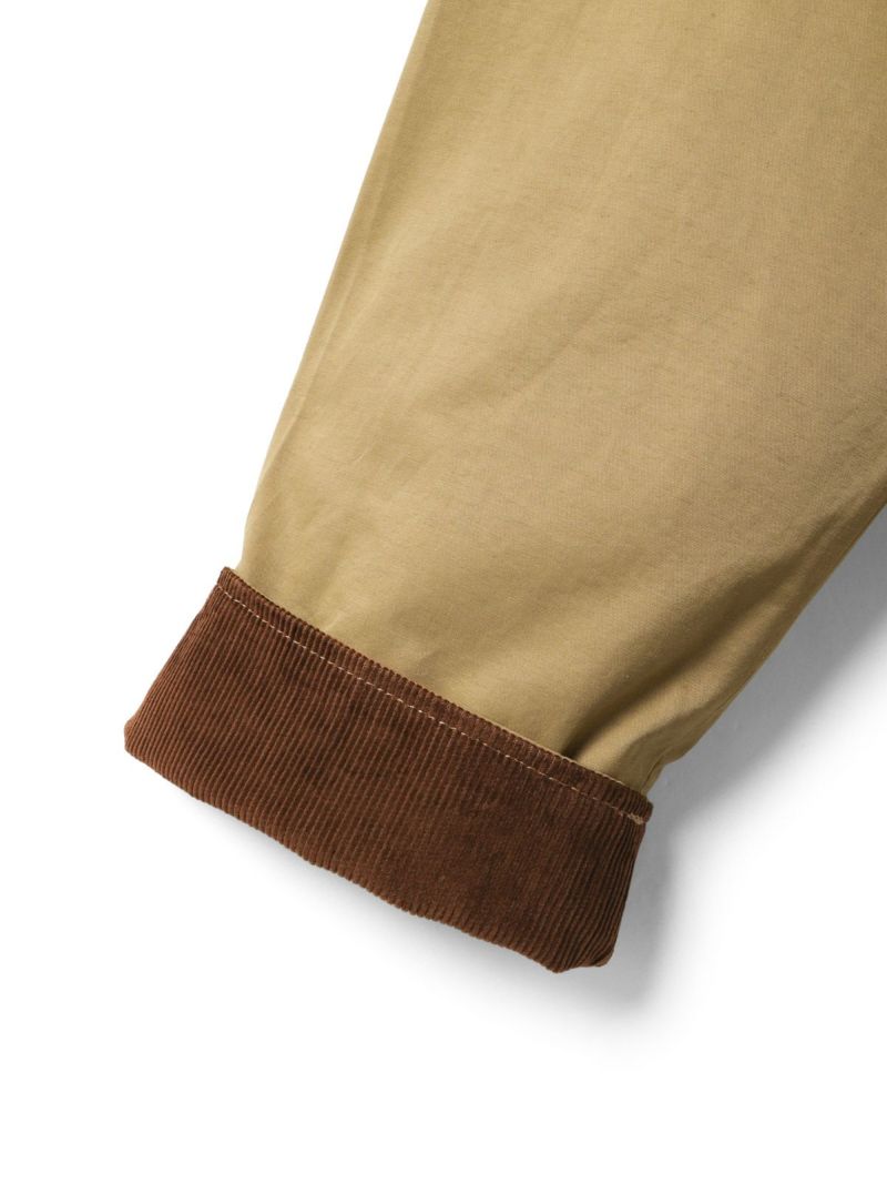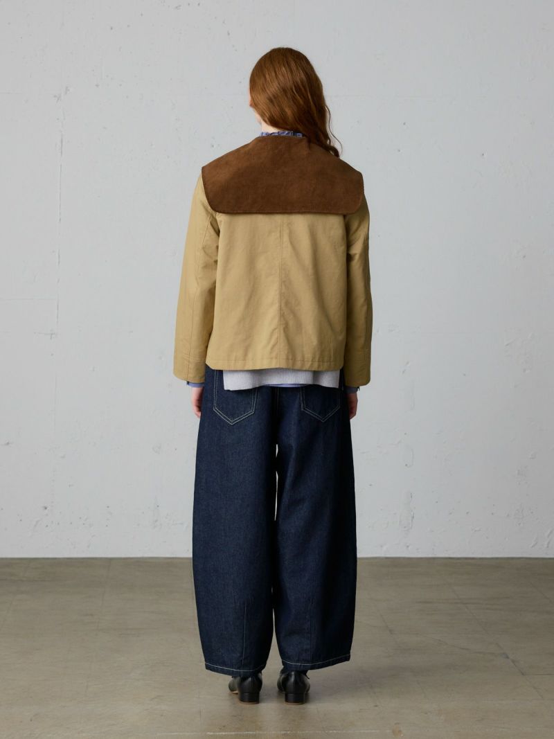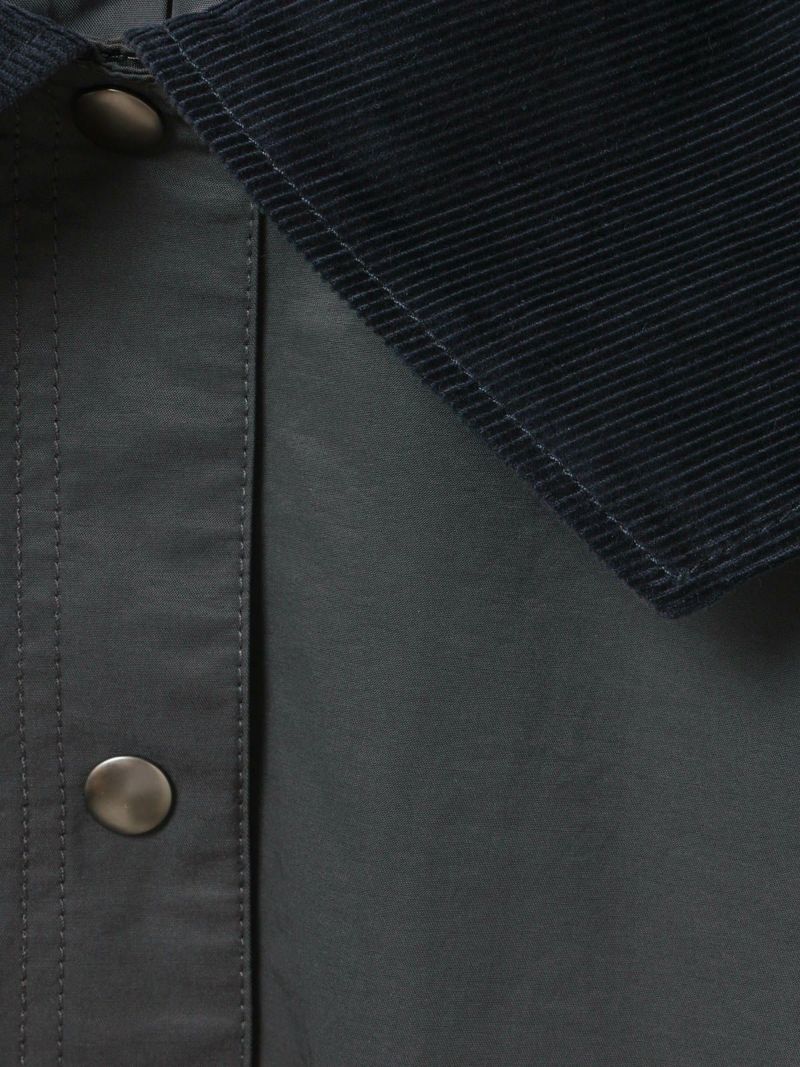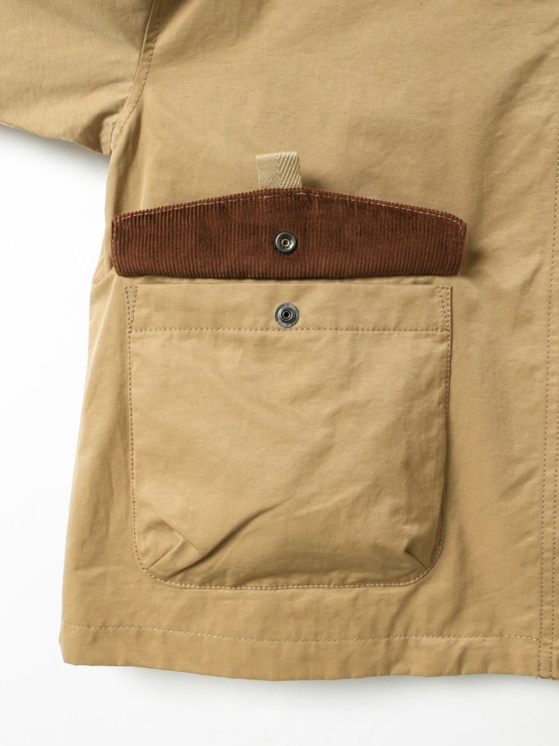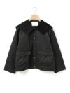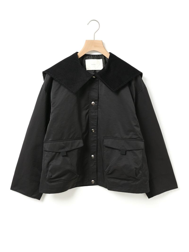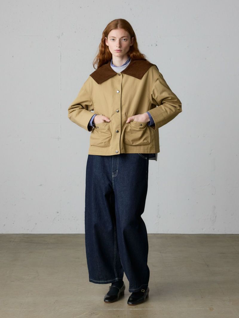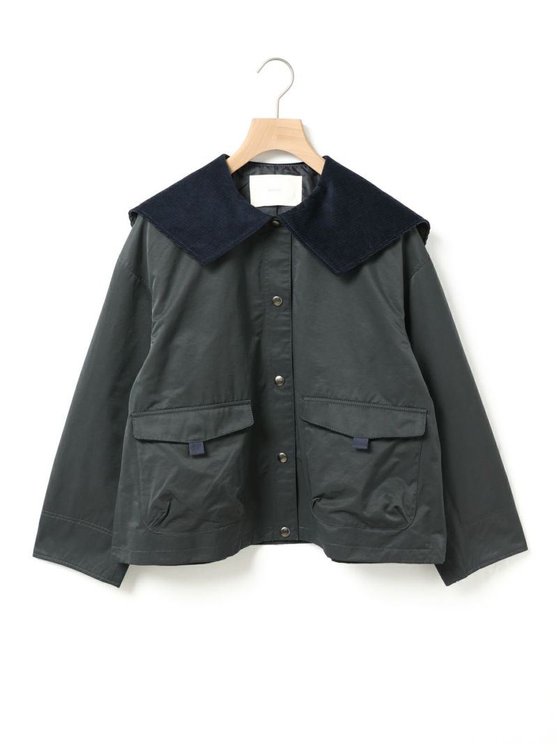 コットンポリエステルのタフタ素材とポイントでコーデュロイを使用したハンティングジャケットです。軽量感があるアウターです。セーラーカラーのデザインが特徴的。ふくらみのあるポケットもアクセントになっています。ショート丈なのでスカートと合わせやすく、女性らしくもありカジュアルな着こなしを提案します。ゆったりとしたサイズ感なので中にも着こめるのもポイントです。同シリーズ3-779937/ハンティングロングコートも展開。