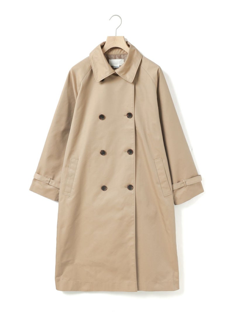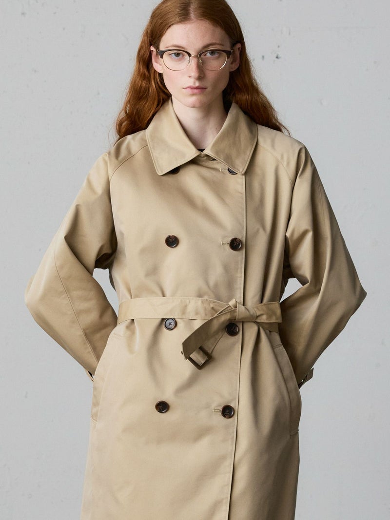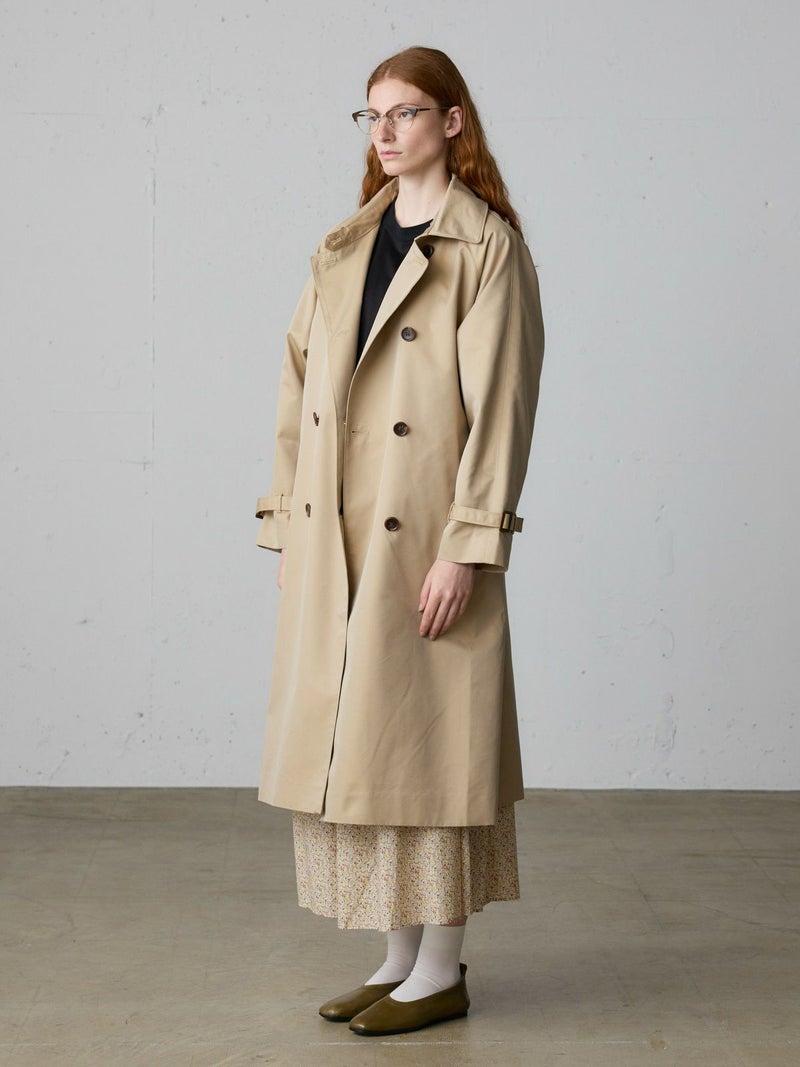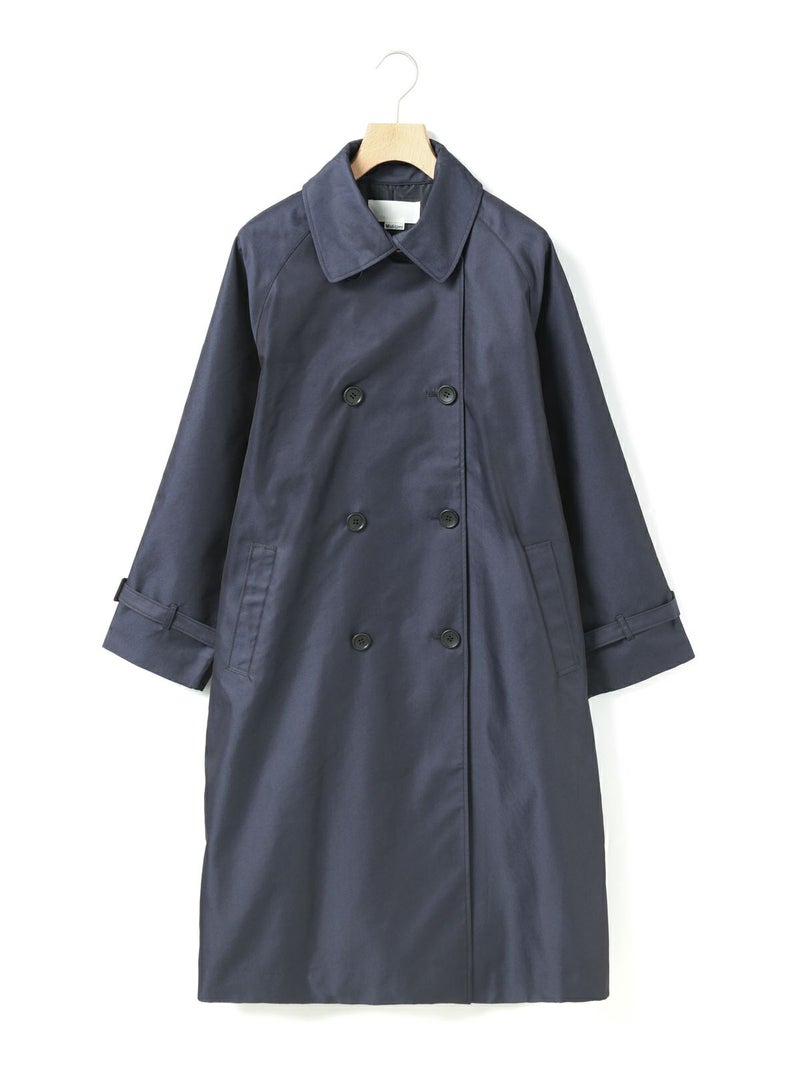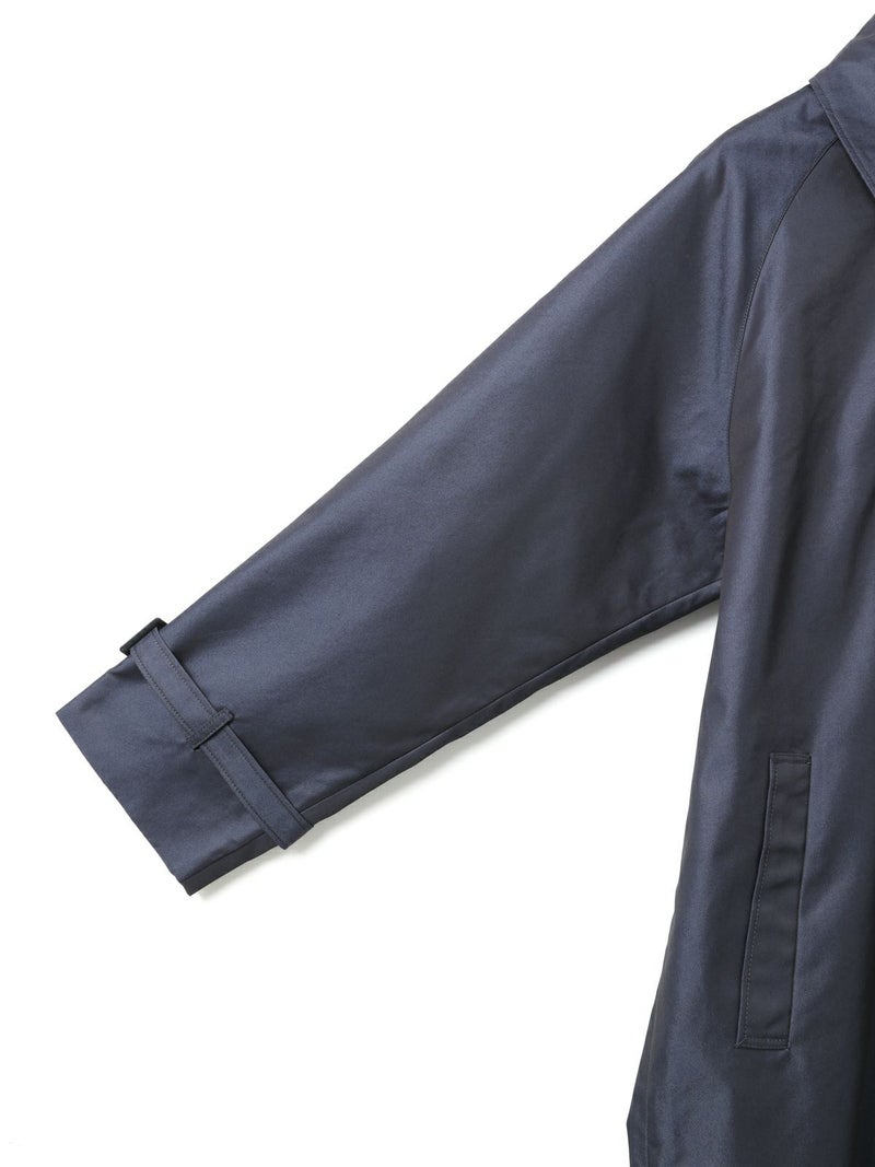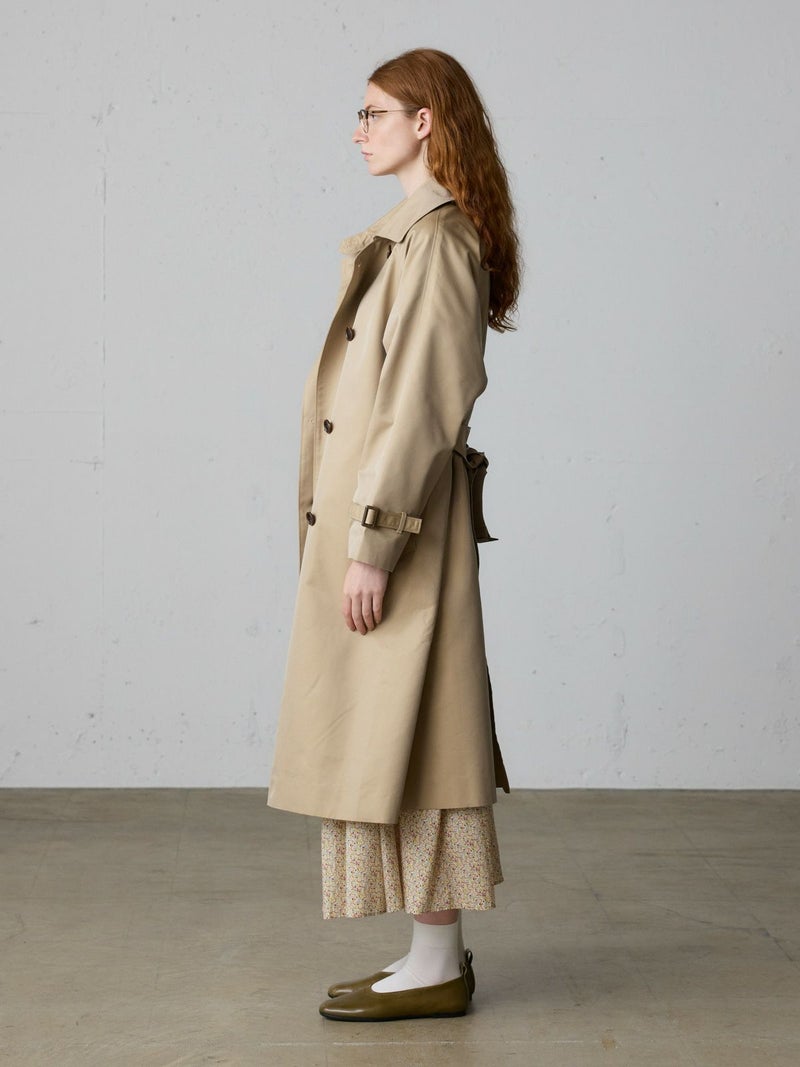 軍用コートから民間へファッションアイコンが着用していたトレンチコートらしさのあるデザインを表現したトレンチコート。シルエットと襟を現代で使いやすいデザインに仕上げています。玉虫調の素材を使用。立ち襟にしたり、ベルト使いで変化を付けたりとアレンジのきくデザインです。ネイビーとベージュの定番色で展開。長く愛用していただけるアウターです。