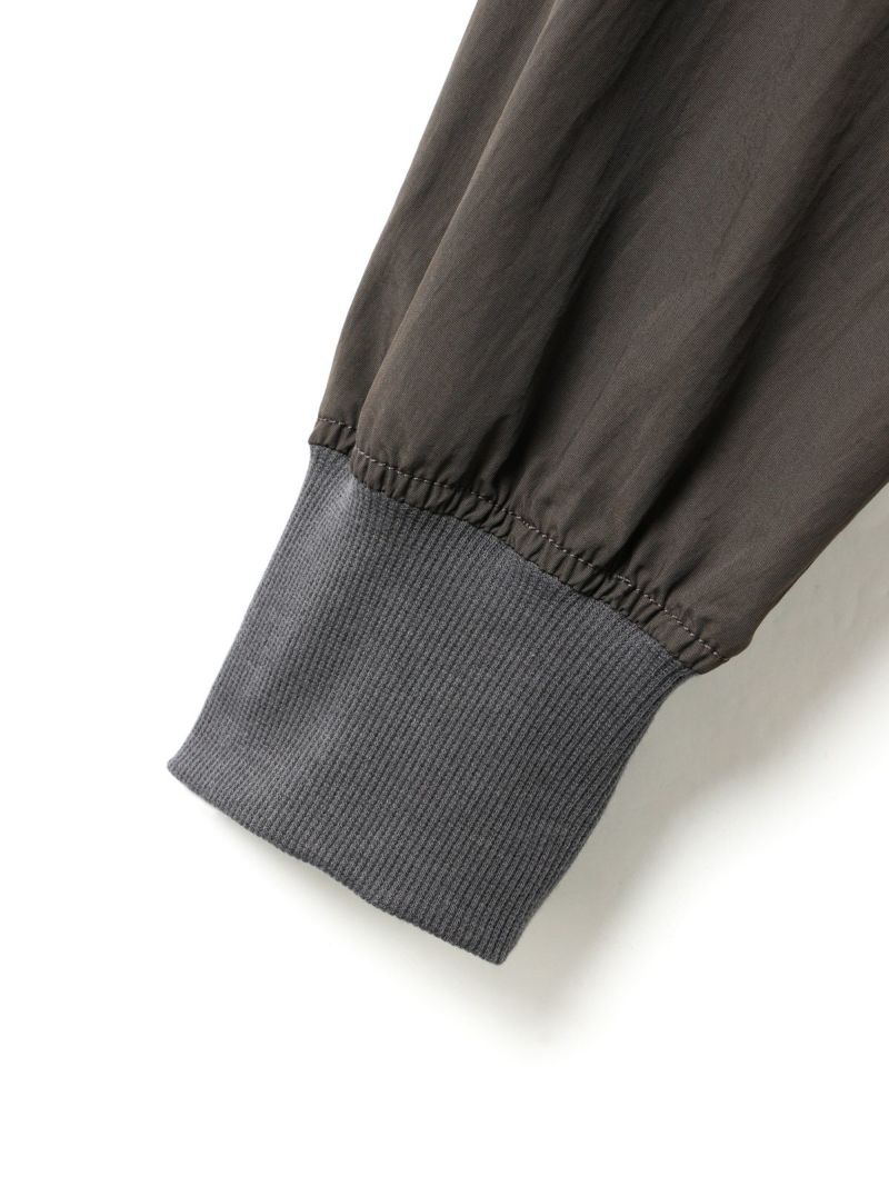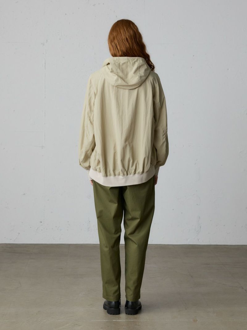 タスラン糸を使用したフード付きブルゾンです。タスラン糸は、ナイロンを高圧の空気で撚り合わせることで、コットンのような柔らかな風合いとナイロン特有の耐久性を兼ね備えた高品質な素材です。軽量でありながら強度が高く、風を通しにくい特性を持ち、軽い雨からも身を守る耐水性があります。Wファスナー仕様で、前を開けて着たり、リブを生かして裾をブラウジングしたりと、着こなしの幅が広がります。後ろに丸みを持たせたコクーンシルエットが、かわいらしい印象を演出。袖口と裾にはリブを施し、フィット感を高めています。コンパクトにたたんで持ち運びもできるため、急な寒さ対策にも便利です。落ち着きのある優しいカラー展開で、デイリーコーディネートに自然に馴染む一着です。ワイドパンツやスカートとのナチュラルスタイルや、ワンピースの上に軽く羽織るレイヤードスタイルなど、さまざまな着こなしを楽しめます。