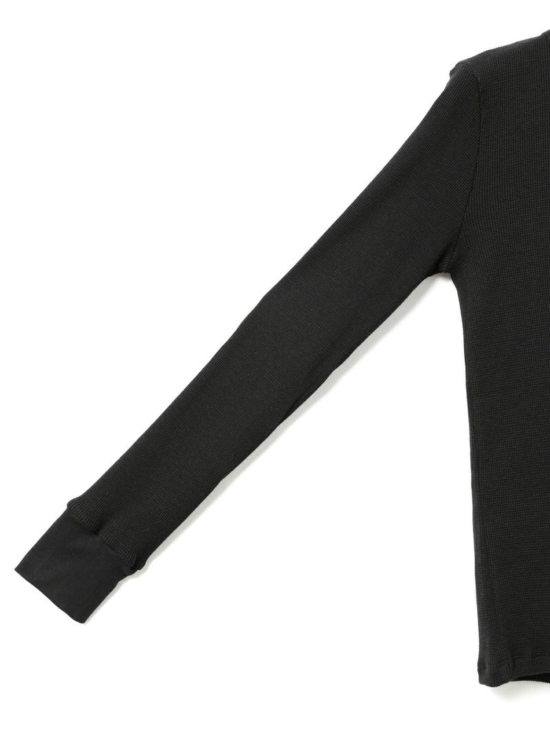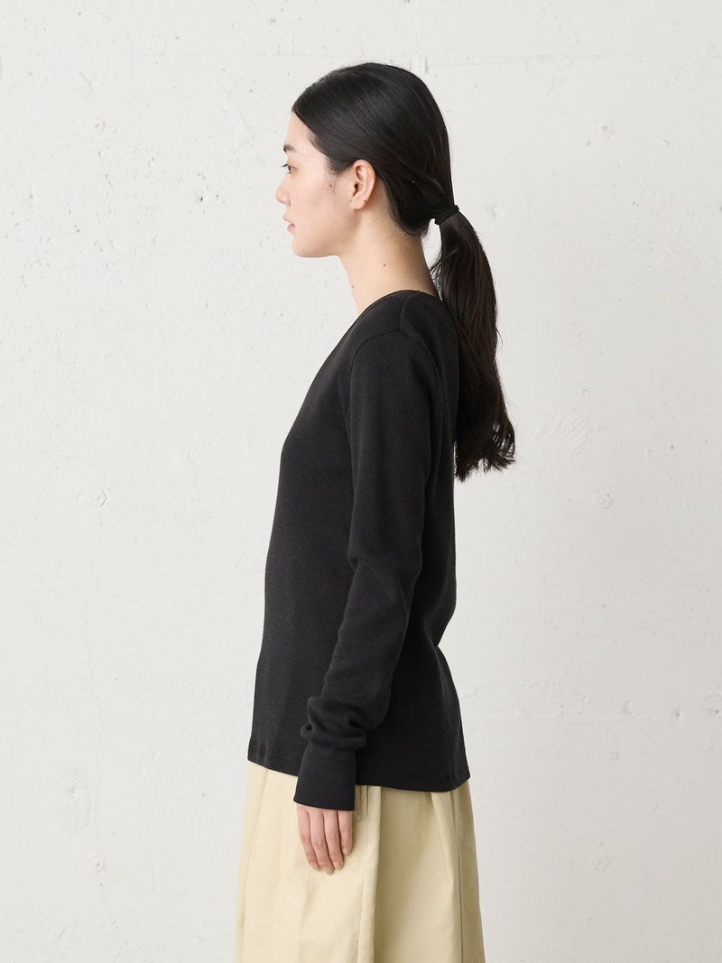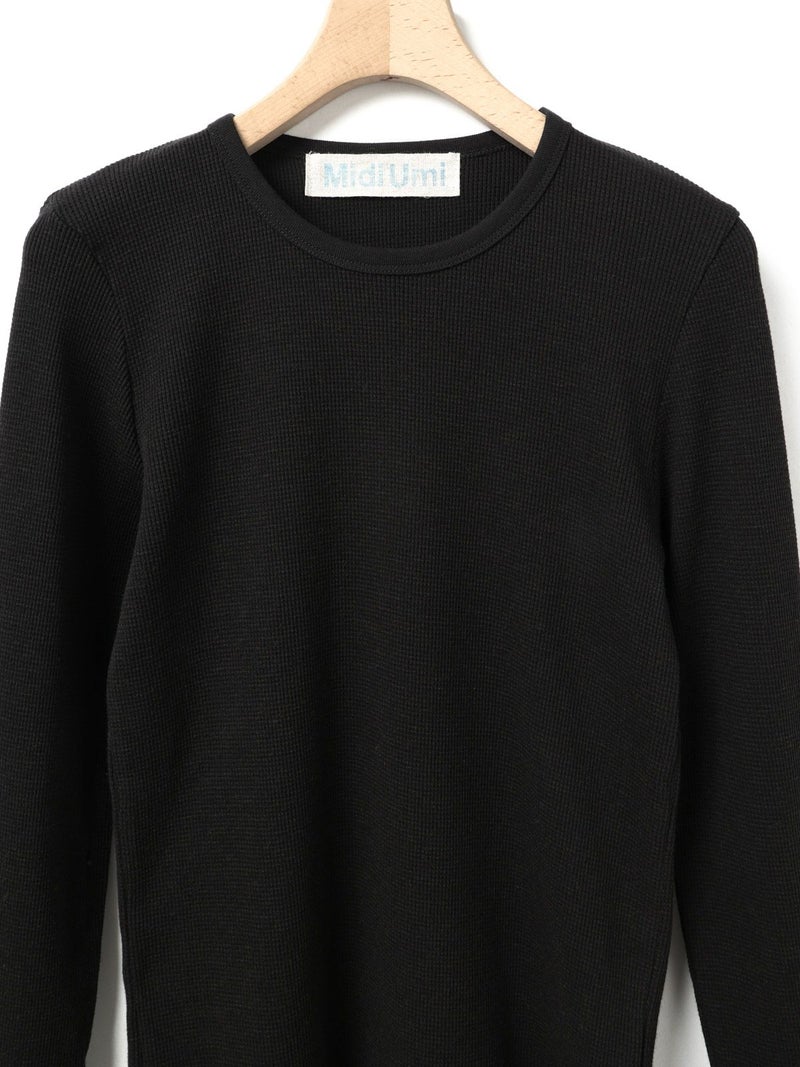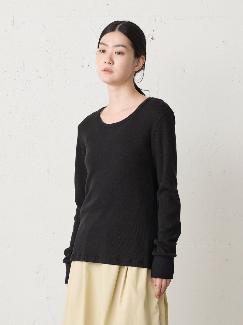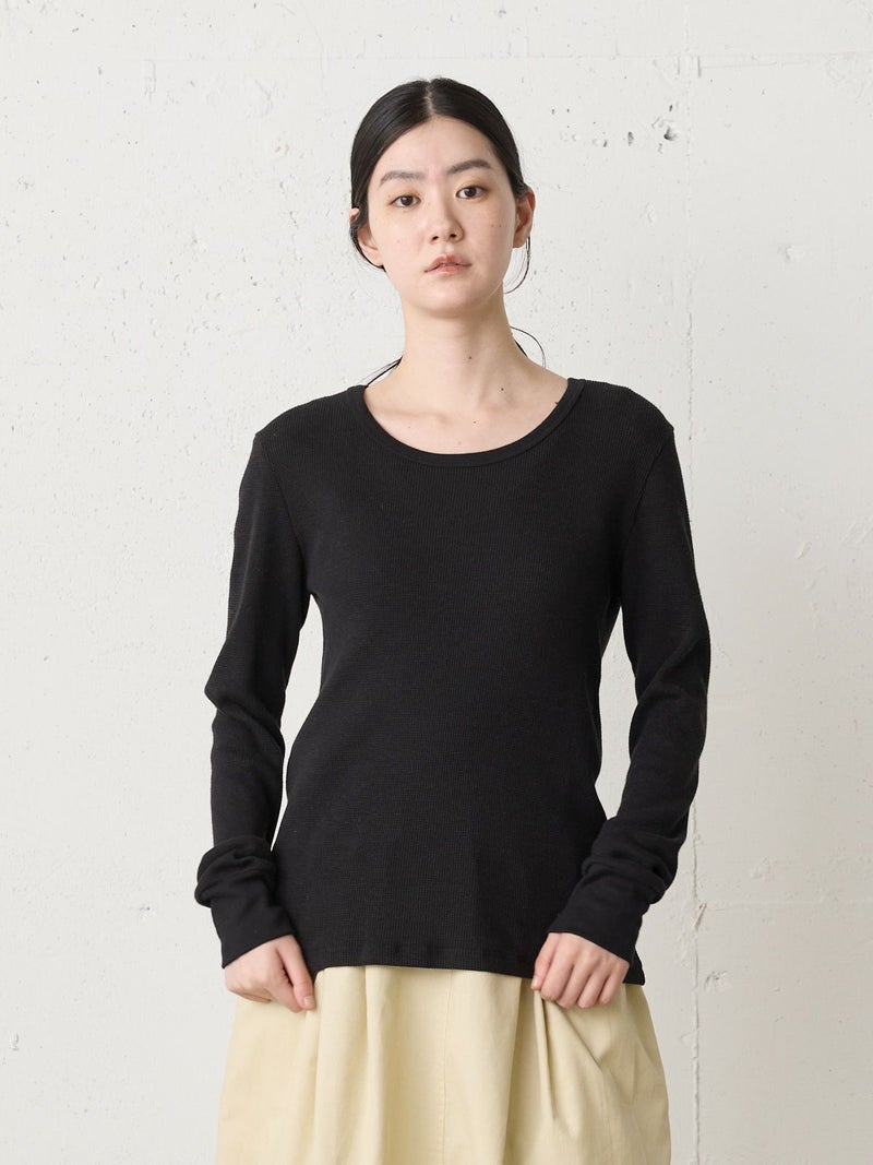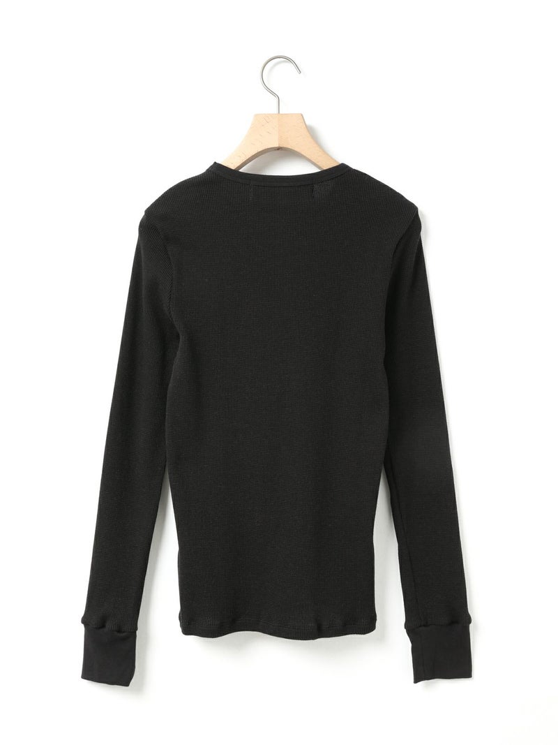 コットンウールのワッフル素材を使用したワッフルクルーネックプルオーバーです。凹凸の空気層をつくり保温性が保てる薄くて軽いワッフル素材です。シンプルなクルーネックインナーで細身のシルエットが特徴。ヒップに掛かるほどの丈感でレイヤードアイテムとしてインナー使いに役立つ1枚。カジュアルベーシックなアイテムなので長く愛用できるのもポイントです。同シリーズ4-710011/ワッフルヘンリーネックプルオーバーも展開。