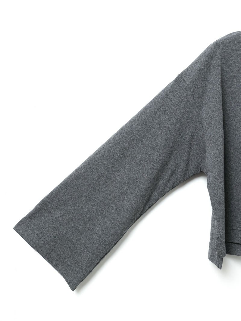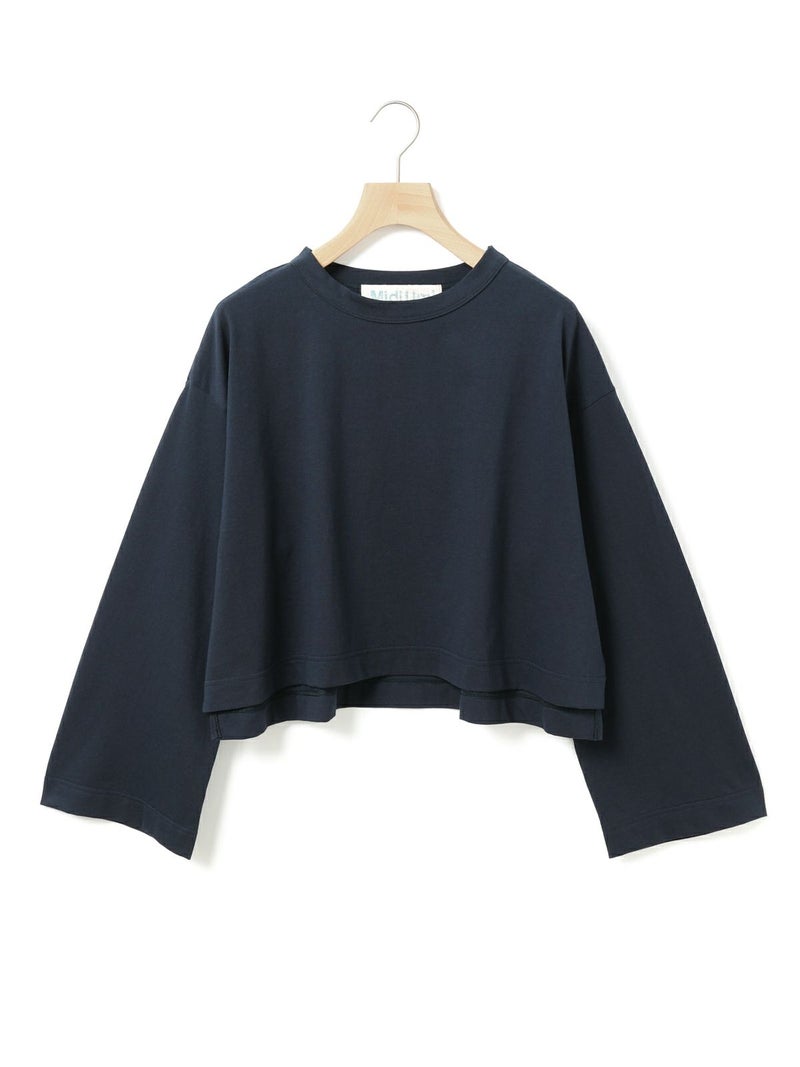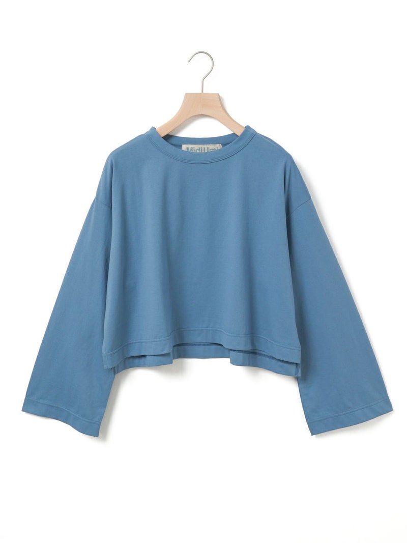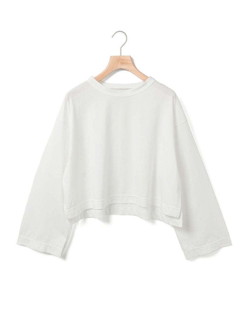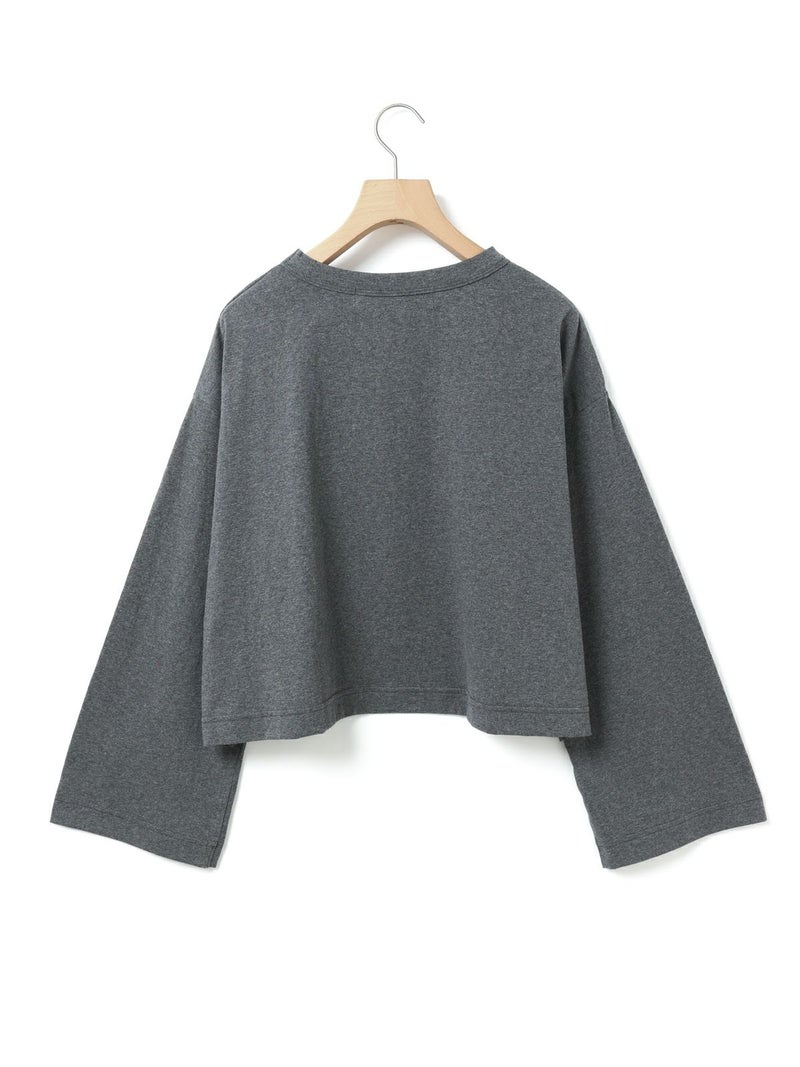 袖幅の広いデザインが特徴のフレアスリーブプルオーバーです。ショート丈のすっきりとした丈とのデザインバラインのとれたカットソーに仕上がっています。長めのインナーを合わせてレイヤードしても素敵です。若干の前後差を付けサイドスリットが入っています。お洗濯もしやすく春先にも重宝できるアイテムでシンプルに着こなせる1枚です。