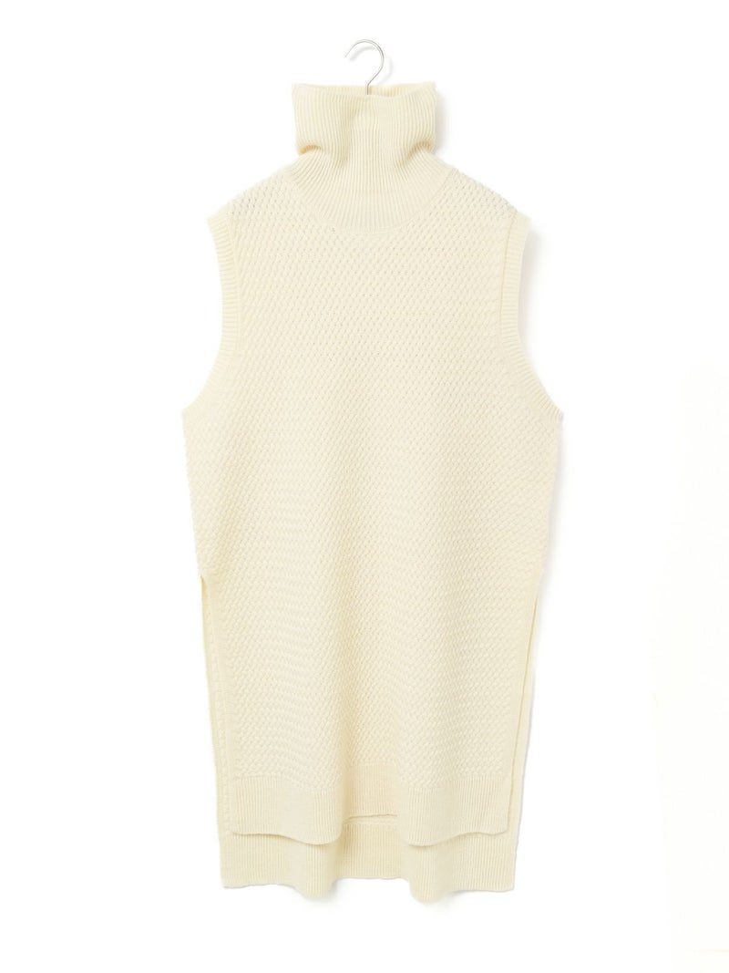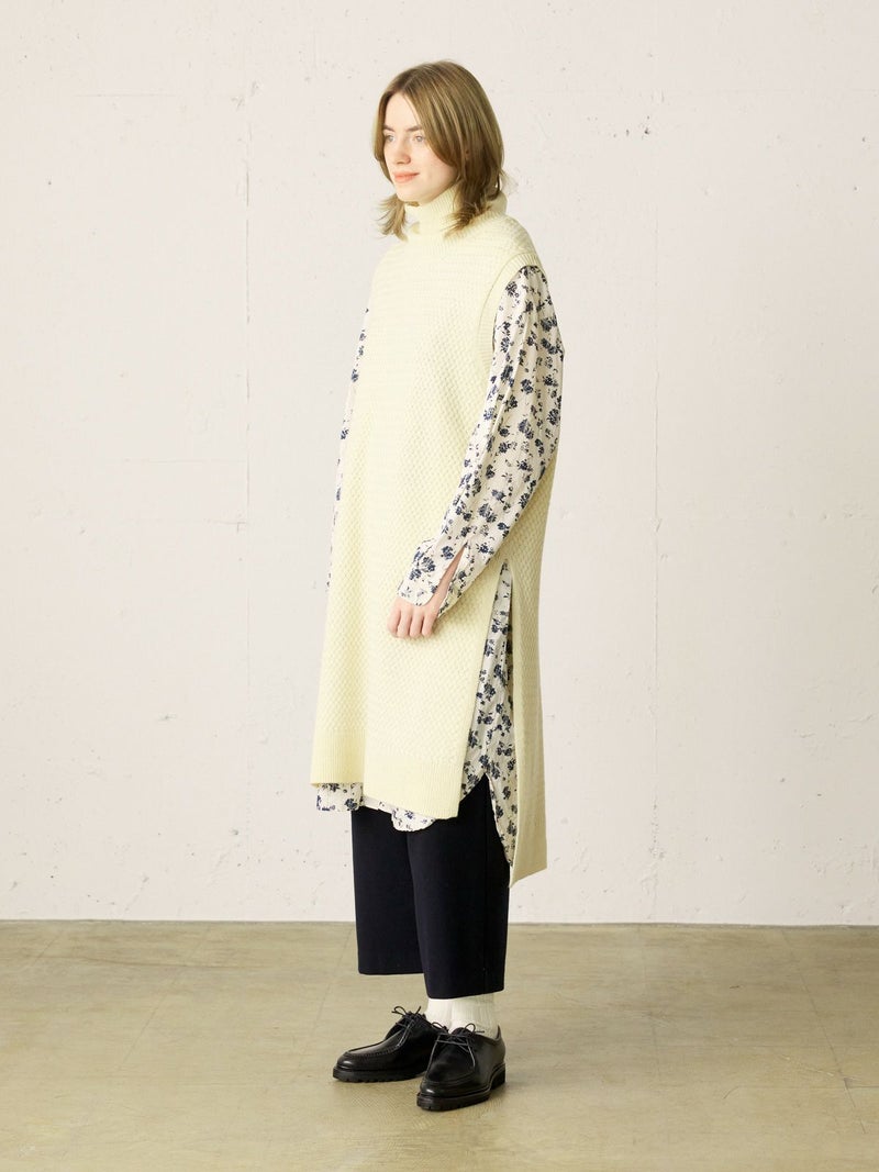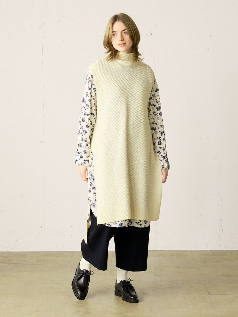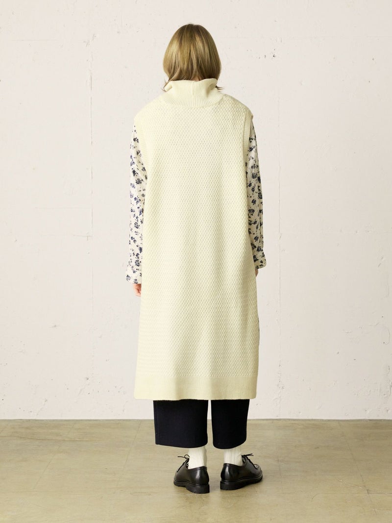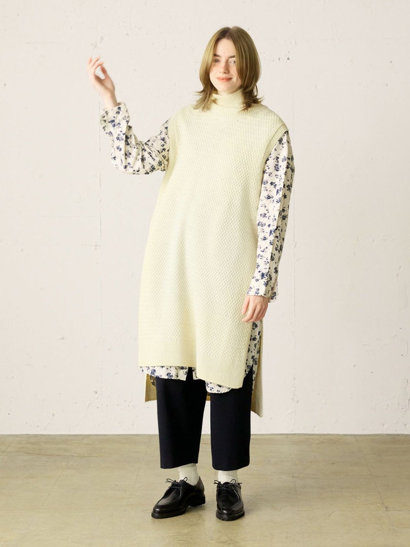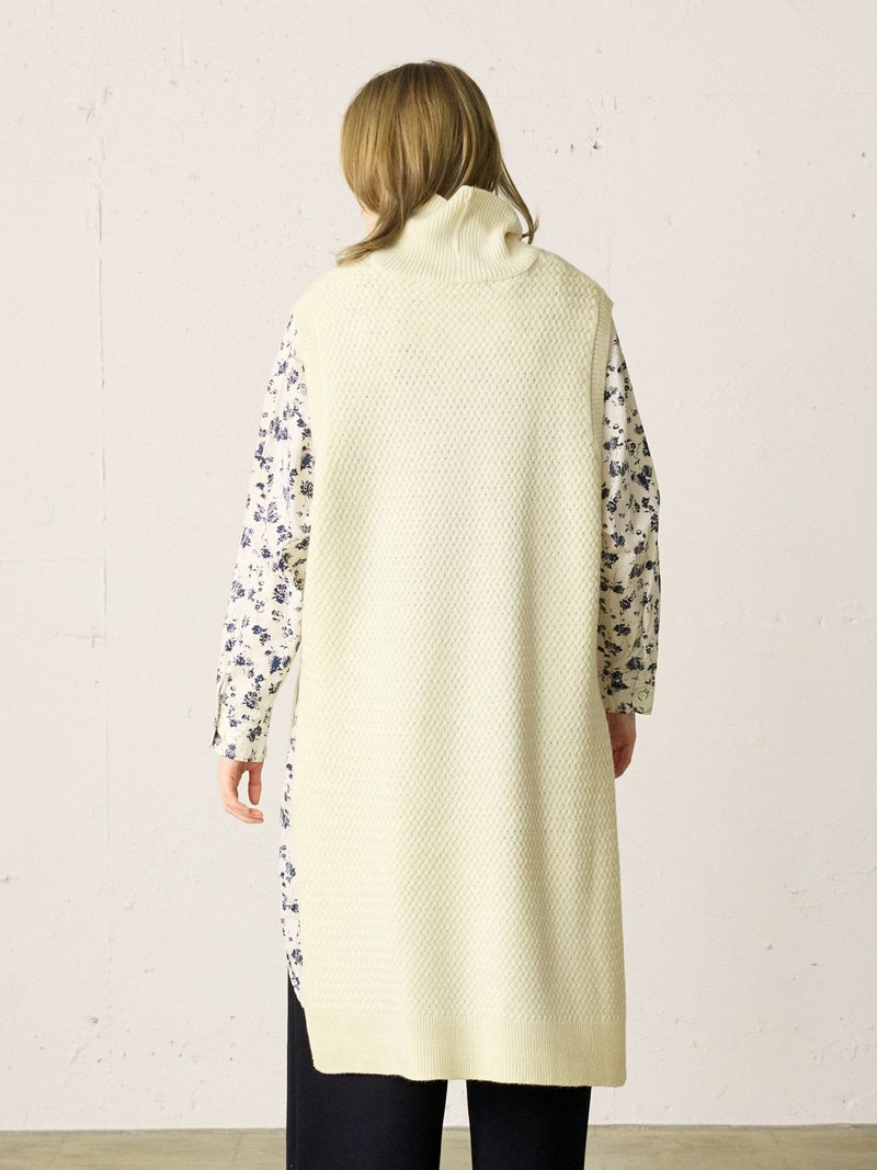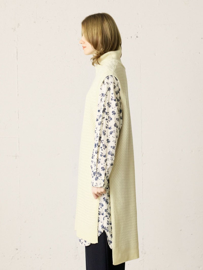 バスケットケーブル編みが特徴のアントレラックロングベストです。同ニットシリーズで4-729708/カーディガンと4-729709/プルオーバーも展開。ざっくり編んでいるので軽くて温かい1枚。脇から深くスリットの入ったデザインで前後差の付いたニットベストです。タートルネックの首元は風通しがなく首を包んでくれます。色々なアイテムにコーディネートしていただけます。特にワンピースとの合わせもオススメです。