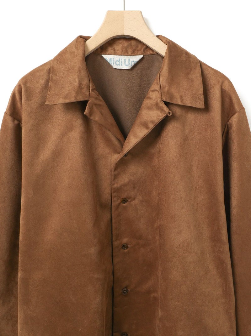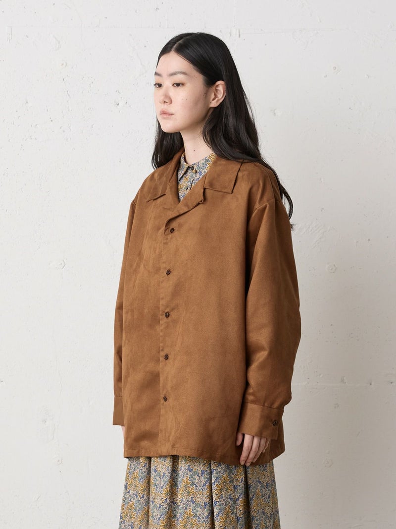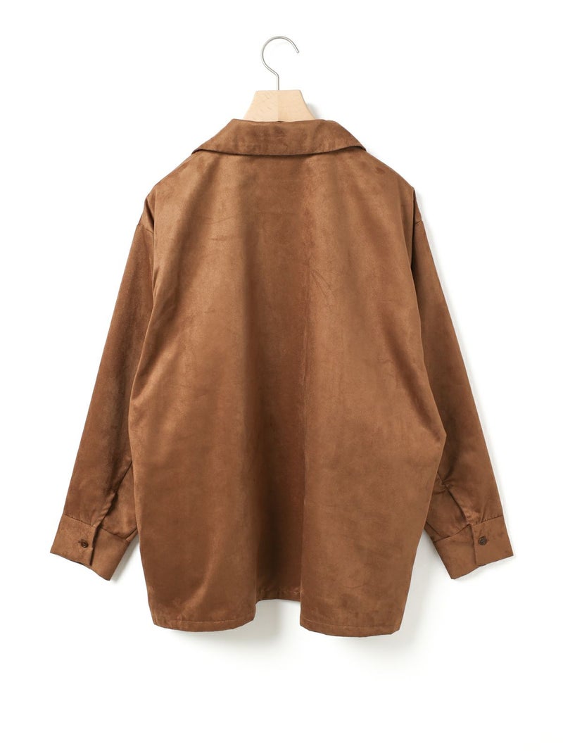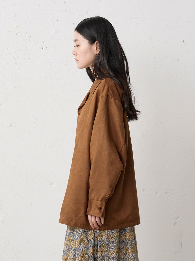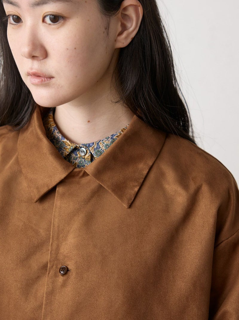 しなやかな風合いときれいな表面感のあるフェイクスエードを使用したフェイクスエードシャツです。今年トレンド感のある風合いのシャツでデザインしました。ジャケット風のオープンカラーシャツでゆったりとしたワイルドな雰囲気が印象的。シャツインしたり羽織にしたり、コーディネートを楽しむのがオススメです。同シリーズ4-730010/フェイクスエードジャケットも展開。